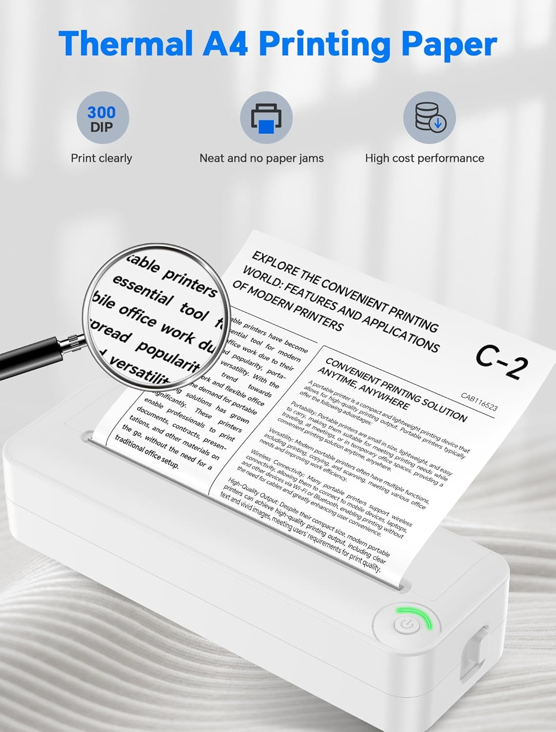 Powerful & Durable: Built in 1500mAh large capacity lithium battery, can print 200 sheets of A4 paper after a full charges; Each paper roll can print 45 sheets of A4, no need of frequent replacement.