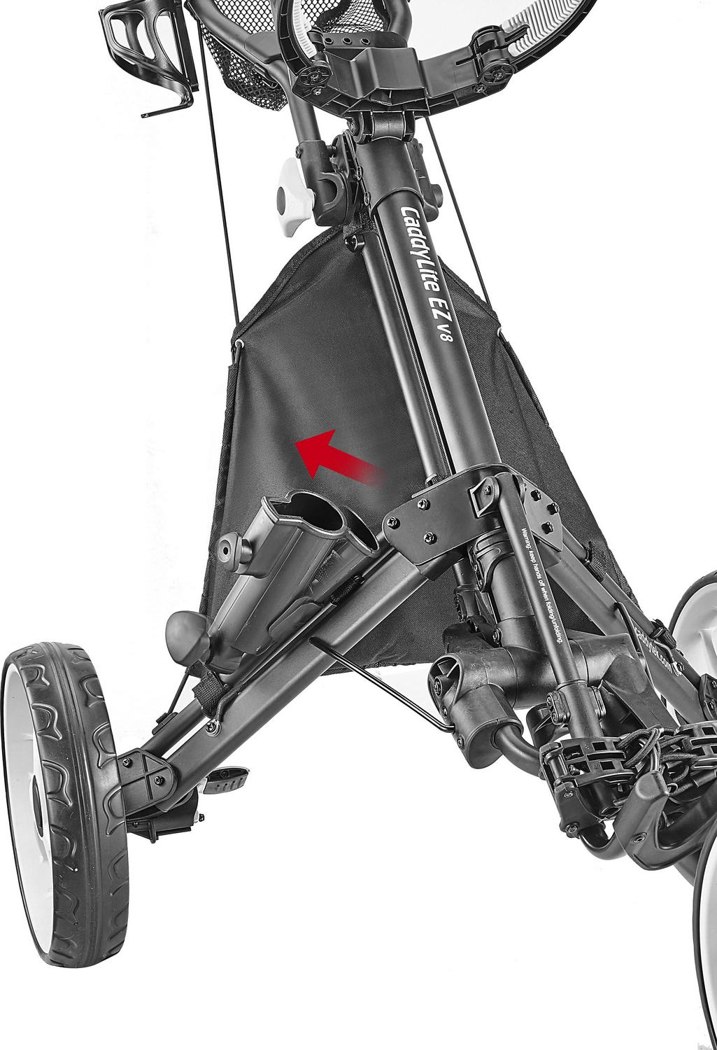 CaddyTek CaddyCruiser ONE Version 8 Blue, with the new scorecard holder/storage compartment. Plus the new clamp type golf bag holder, the 2018 version of CaddyCruiser ONE still comes with the advanced One-Click Folding mechanism. It is convenient and easy to fold in one simple step. The new and big wheel make it rolling easily in the high grass. The strong, stable 4-wheel body design maintains a unique lightweight and compact folded size for easy storage in car trunks before or after your round of golf. Golfers can push the cart effortlessly on all types of terrain with cushioned front wheels, multiple handle positions, and smooth rolling ball-bearing wheels. The CaddyCruiser ONE V8 has plenty of storage and features that most golfers want including umbrella, scorecard, and beverage holders and the unique/patented basket with cooler built in. Rain or shine, cart your clubs around the green in style and enjoy the game!