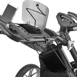 > Scorecard holder integrated with storage compartment, beverage holder, cell phone/GPS holder and mesh net