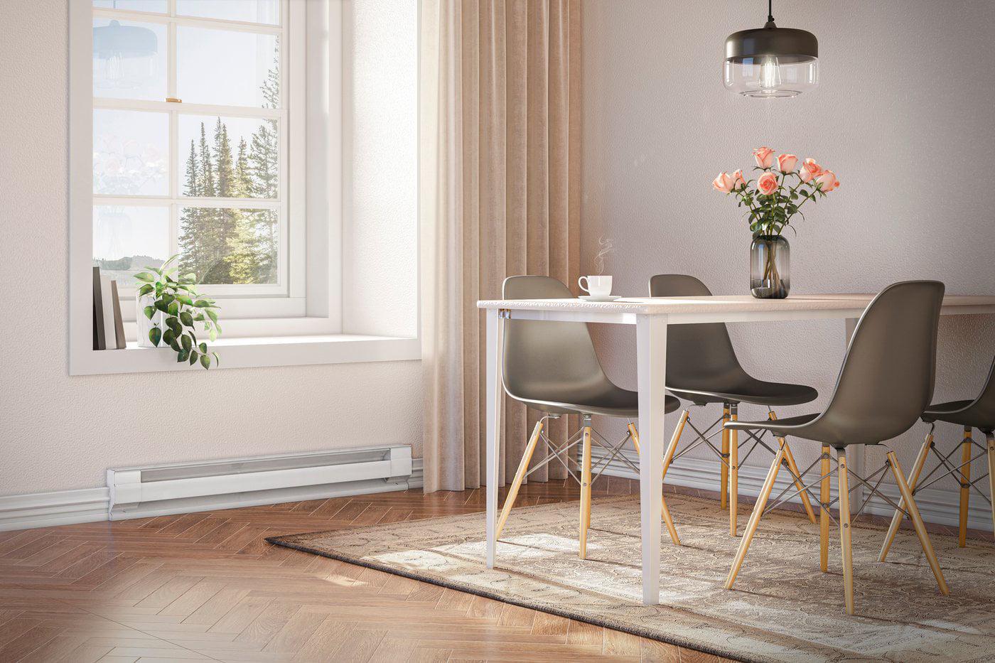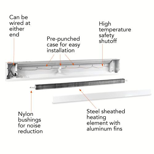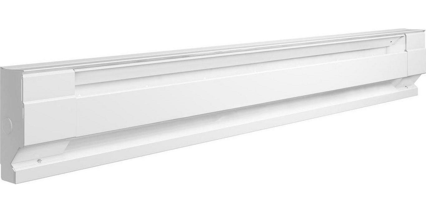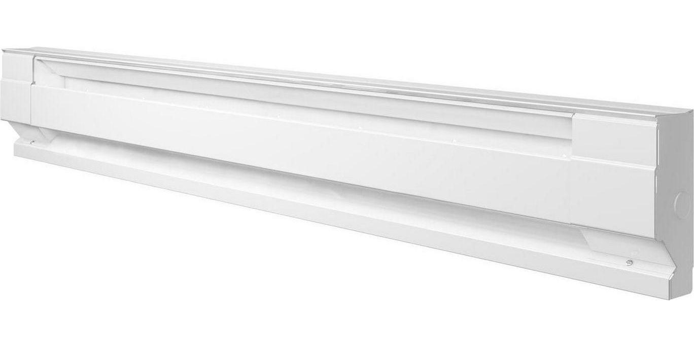 The Cadet Electric Baseboard Heater utilizes convection heat to provide efficient warmth. The quiet operation and low cost installation make it a perfect choice for a bedroom or any area of your home that requires additional warmth. Designed for ease of installation with pre-punched mounting holes along 1″ intervals, this hardwired heater can be wired at either end. Rugged U.S.A. steel construction with powder coated white paint for a durable, premium finish. A thermostat is required and sold separately.