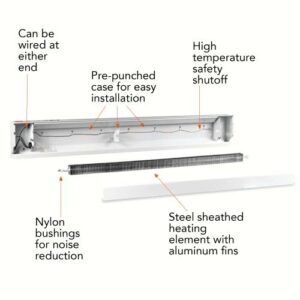 - No cords – requires hard-wired installation for a permanent, safe, reliable heating solution