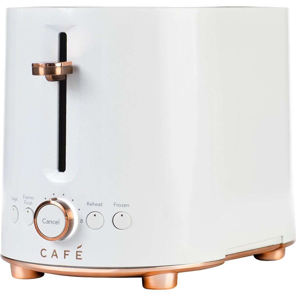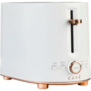 Café Express Finish 2-Slice Toaster Matte White For busy mornings, this innovative two-slot toaster from Café has an Express Finish mode. Just push a button and the extra heating elements kick in, toasting bread to your preferred doneness in just 60 seconds. Quickly check the selected level of doneness using the light up LED setting control ring. 4 PRE-SET FUNCTIONS – Customized toaster settings are a touch away thanks to a toaster with four pre-set functions: Express Finish, Bagel, Reheat and Frozen