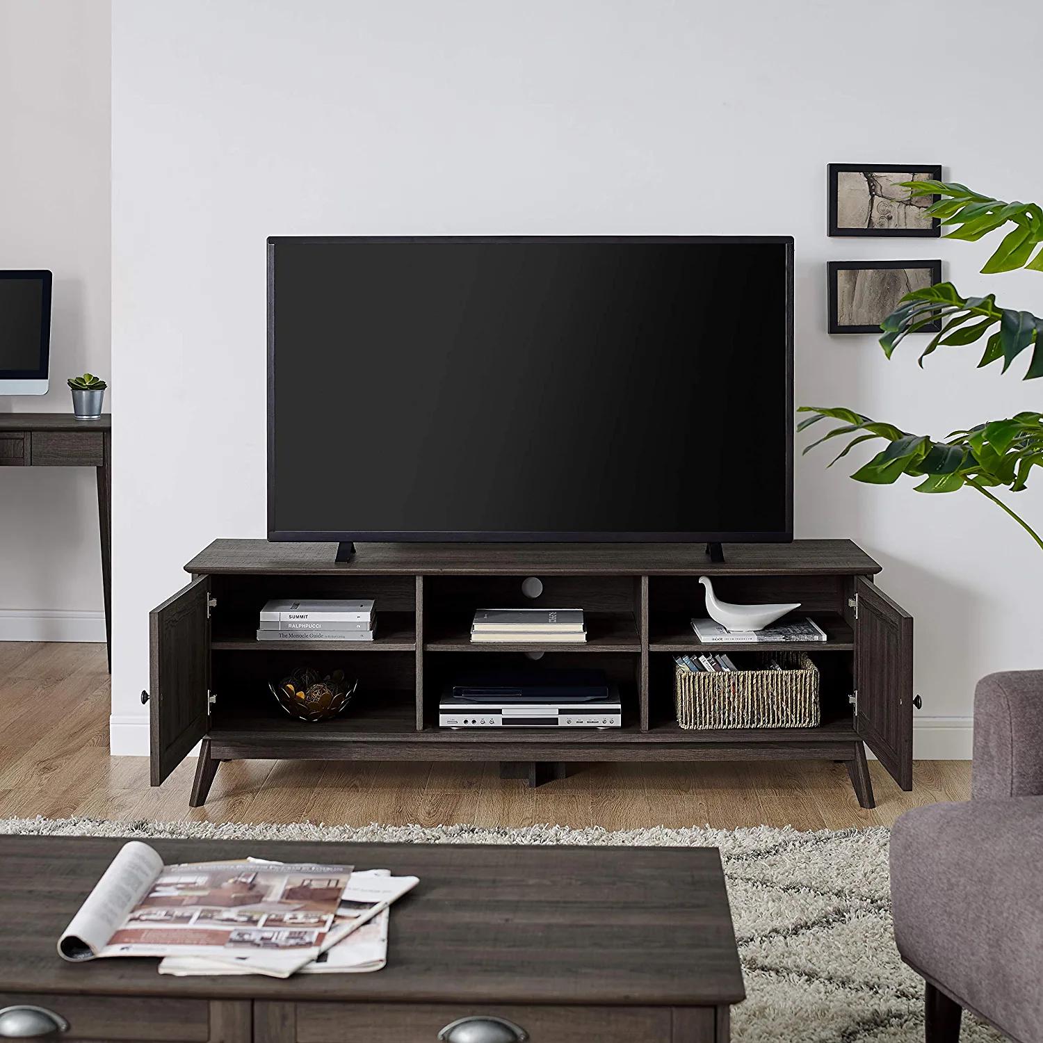 – DESIGNED FOR STYLE AND FUNCTIONALITY: This quality Mid-Century multi-tasker can enhance the look of your living room, den or family room. Not only does it showcases your TV, but it also helps you stay organized by serving as storage space for your books, DVDs, game consoles, and other media equipment. Durable, thick ,and high-pressure laminate will better withstand daily use and abuse than pure wood or veneer.