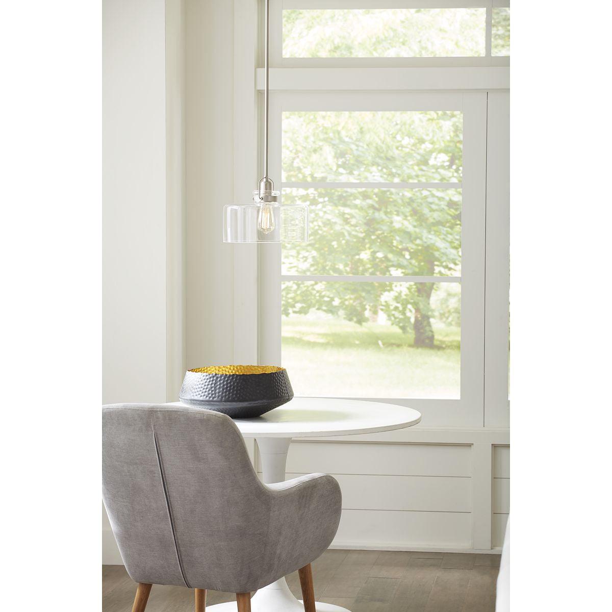 - Clear glass shade inspired by apothecary jars add a vintage feel to Calhoun’s casual forms
