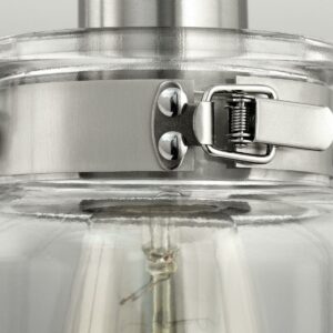 A trend in home decor is the repurposing of antique pieces. Calhoun playfully follows this trend with an apothecary style clear glass diffuser held in place with a mechanical latch from a spice container. A glass shade showcases a thickened profile to create a vintage-style surface for a classic handmade appearance. The vintage design is a perfect complement to several decor styles including the popular Farmhouse trend. One-Light Pendant with a Brushed Nickel finish.