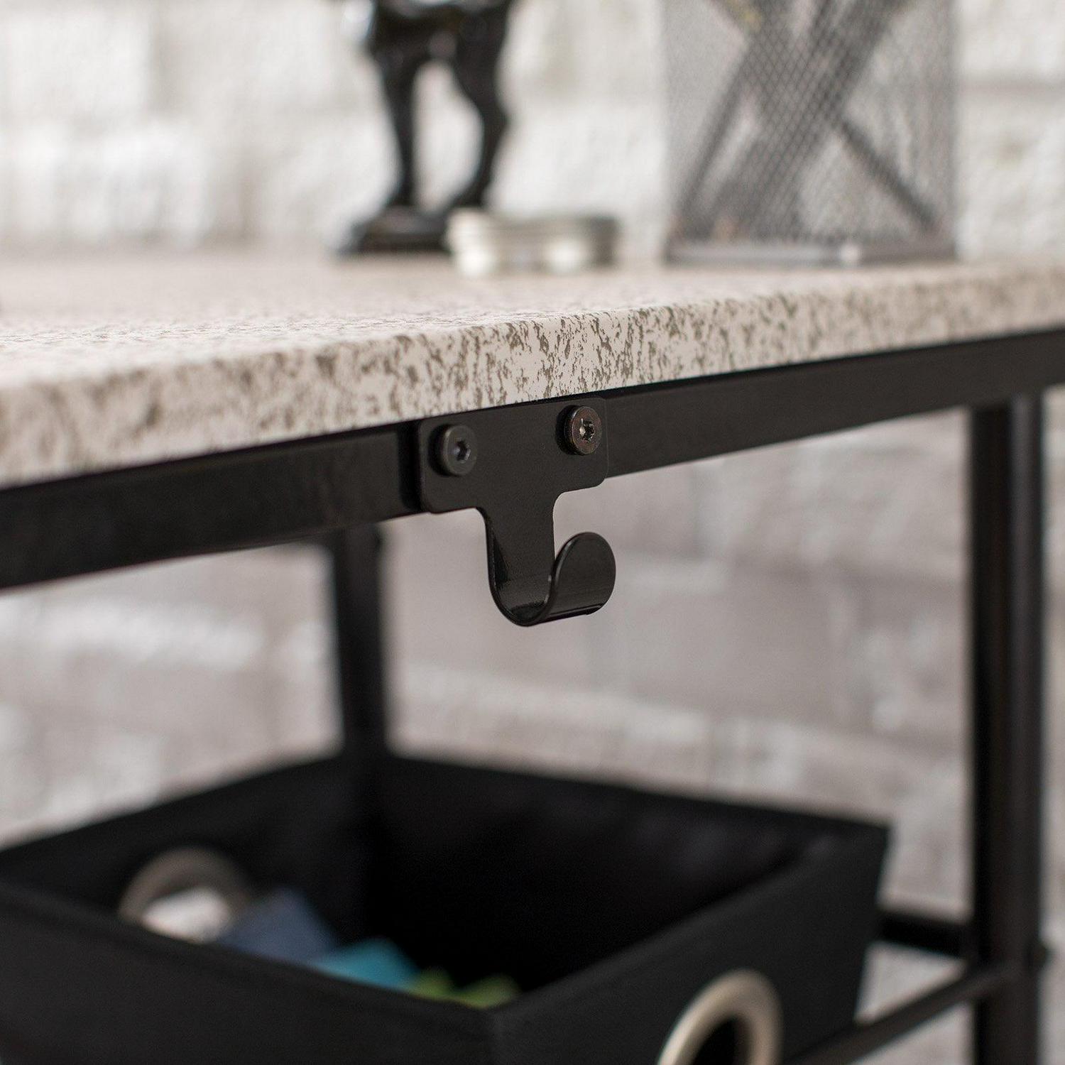 – Wire Shelf: 10″W x 16″D. Metal Shelf: 11.5″W x 17.75″D. Powder Coated Steel Frame for Durability. Two Hooks to Hang Bags or Jackets