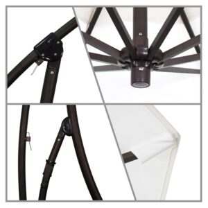 This California Umbrella BA 908 model is an exciting cantilever umbrella that opens up tremendous possibilities for any space. The large 9 foot canopy tilts and turns 360 degrees to offer the most dramatic shade potential. With a strong 2 inch diameter aluminum pole, stainless steel crank system and a standard base with pre-drilled ground anchor holes; this tough design will stand up to the rigors of use. This umbrella also features Olefin fabrics, which are made with high durability synthetic Olefin fibers that offer improved fade resistance over lesser grade fabric materials like polyester and cotton. It is recommended to use at least 100 lbs. of weight on the base if the frame is not anchored to the ground. This umbrella also features Olefin fabric, which is composed of highly durable synthetic Olefin fibers and offers a 1 year fade resistance warranty.
