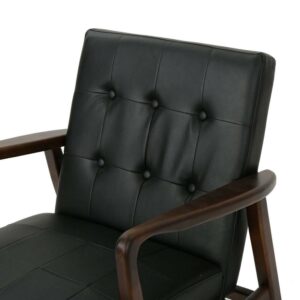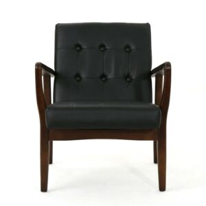 With a gentle slope to its backrest, seat, and arms, the Callahan Tufted Club Chair looks oh-so inviting and feels just as good. The club chair draws inspiration from mid-century modern designs with its tufted cushions and exposed solid birch wood frame. Polyurethane upholstery gives the club chair the visual appeal of leather while ensuring easy care.