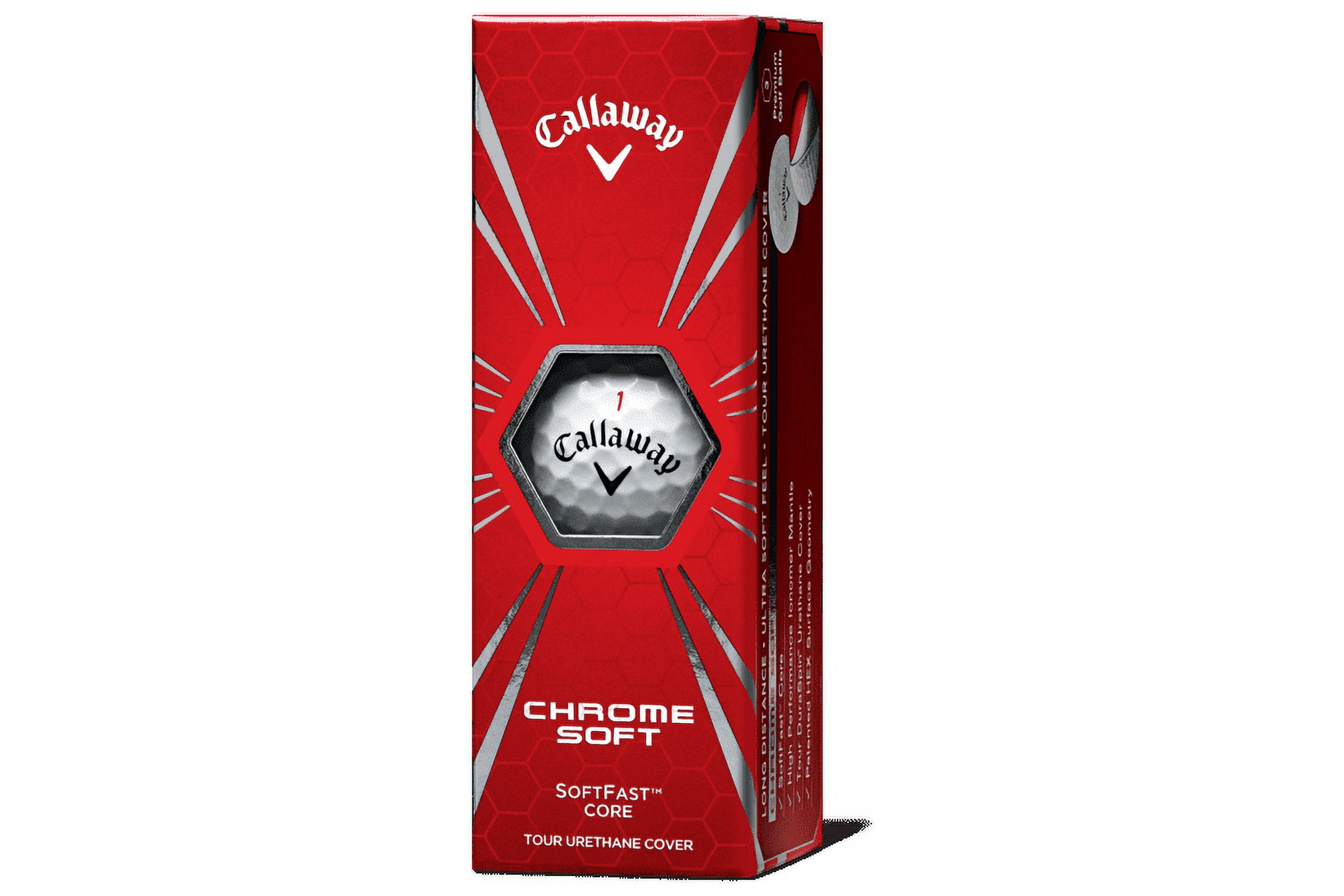 Calloway Mills Chrome Soft Golf Balls, (12 Pack): Soft Fast Core – Soft feel, low spin, and high ball speeds off the driver Derespina Cover – the key to durability, amazing feel, and short game control Patented HEX Surface Geometry – Long, penetrating and stable ball flights High Performance Ionomer Mantle – More speed and distance for you