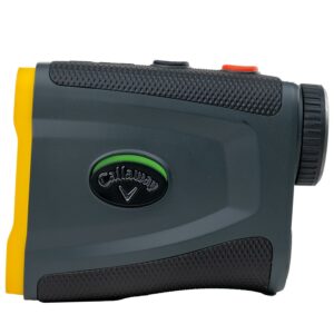 The Callaway XLS Pro golf laser rangefinder offers superior optics and distance measurement features to maximize your performance on the course. The XLS Pro golf laser delivers powerful 6x magnification at a total range up to 800 yards, with accuracy to +/- 1 yard. When engaged, the slope compensation feature will automatically provide adjusted distances based on elevation changes, with easy disengagement via the external on-off switch making the Callaway XLS Pro golf laser legal for tournament use. When approaching the green, scan across the pin in PAT mode (Pin Acquisition Technology) and receive a vibrating Pulse confirming you’ve hit the flag versus any clutter behind it. The Callaway XLS Pro golf laser rangefinder has a compact, ergonomic shape with rubber inserts at the top and bottom to maximize your grip and help steady your aim. The innovative Magnahold feature includes a strong internal magnet allowing you to securely mount the laser onto the cart frame, for easy and convenient access during play. Comes with a carry case with carabiner to clip to your golf bag, and a lens cleaning cloth.