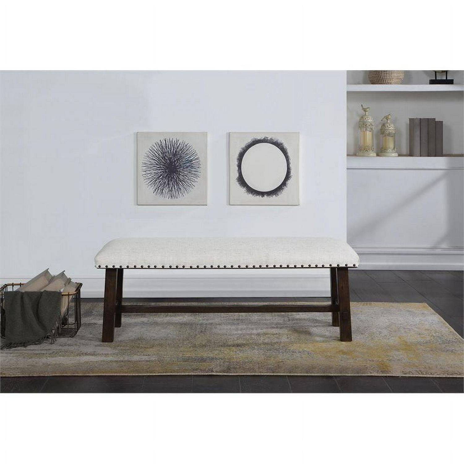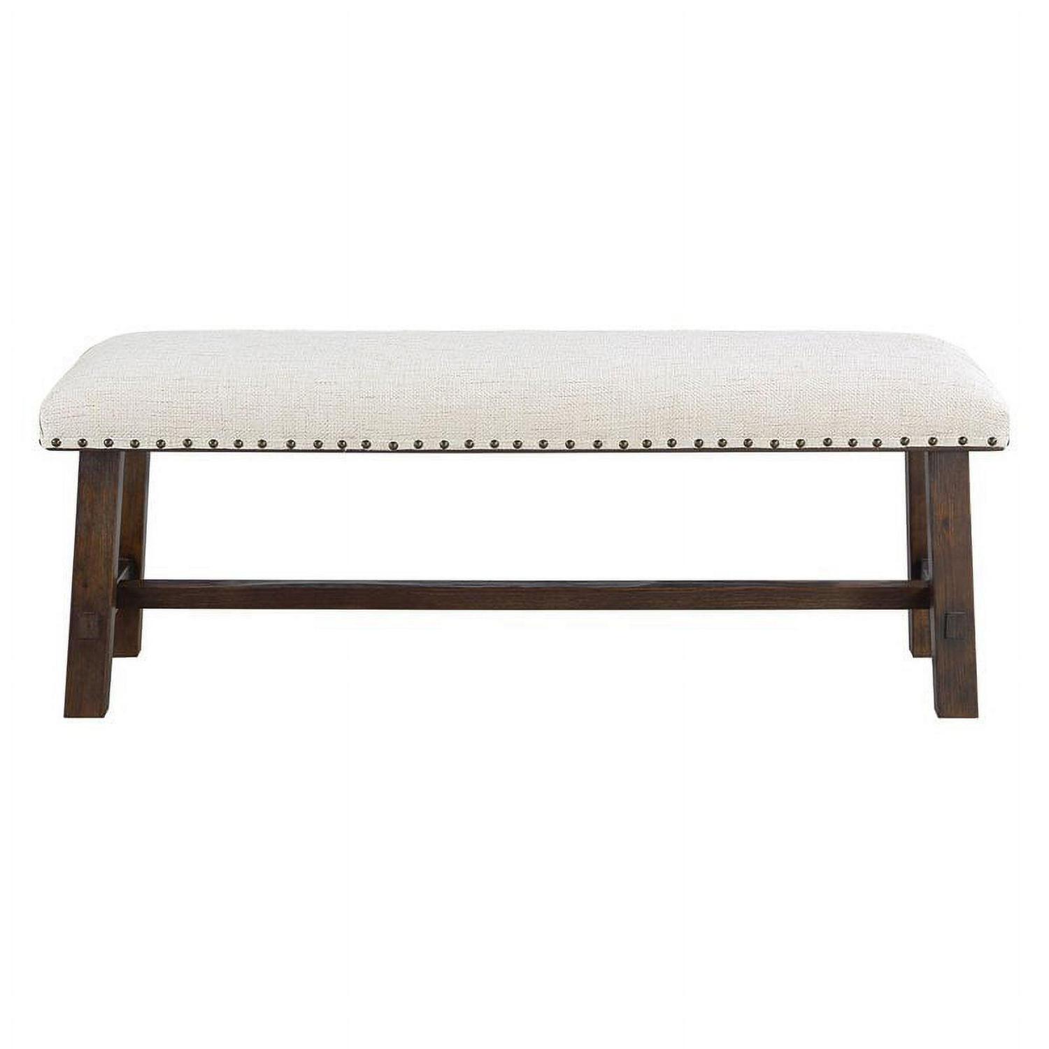 Callen Bench with Walnut Frame and Bronze Nailhead Trim in Linen White Fabric