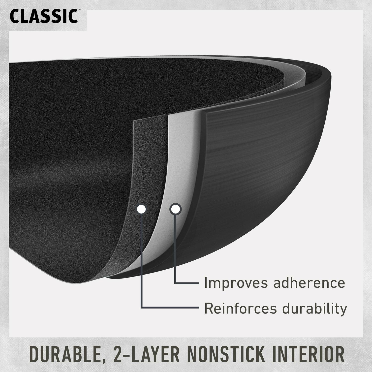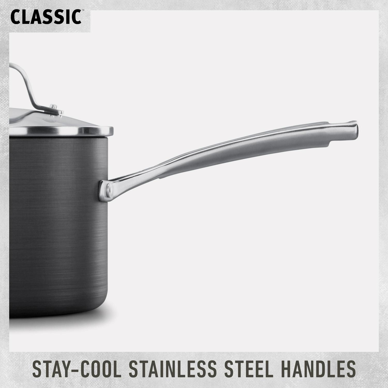 Create easy, everyday meals with the Calphalon Classic Hard-Anodized Nonstick 3-qt. Saute Pan with Cover. Made with dual-layer nonstick, food release is super easy and so is cleaning up. The durable hard-anodized aluminum construction creates fast and even heating, while the stainless steel handle remains cool on the stovetop. Oven-safe to 450 degrees F, both the saute pan and glass tempered lid can easily go from the stovetop to the oven to finish cooking foods. Requiring little to no butter or oil, this nonstick cookware makes it easy to cook healthy in your kitchen. Hand wash only.