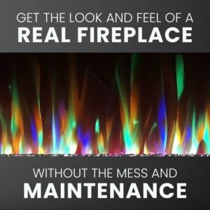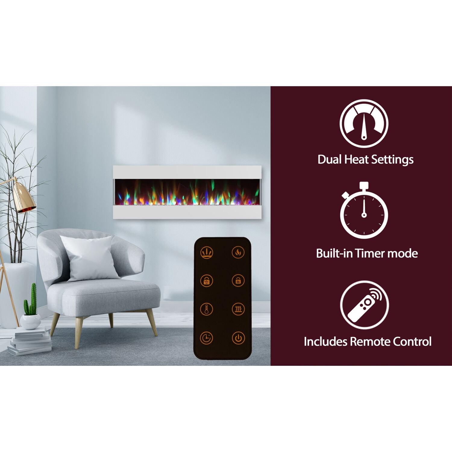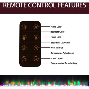 – KEY FEATURES: The color changing wall mounted fireplace includes a display controls on unit and remote control for convenience in adjusting the temperature or settings from across the room. A Built-In Timer is featured on the unit, as well as, 10 LED Flame Color Effects that display over a bed of crystal rocks.