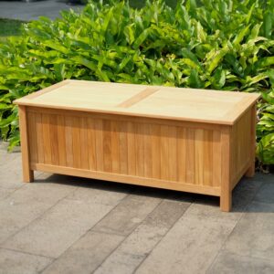 Durably constructed of plantation teak wood, this Cambridge Casual Solid Teak Wood Storage Box is a weatherproof and maintenance-free teak storage box that makes a statement for your outdoor space while providing storage solutions. Carefully crafted from strong and durable solid teak wood with natural teak finish to create fresh look. This teak storage box is a must-have item to store your outdoor essentials.