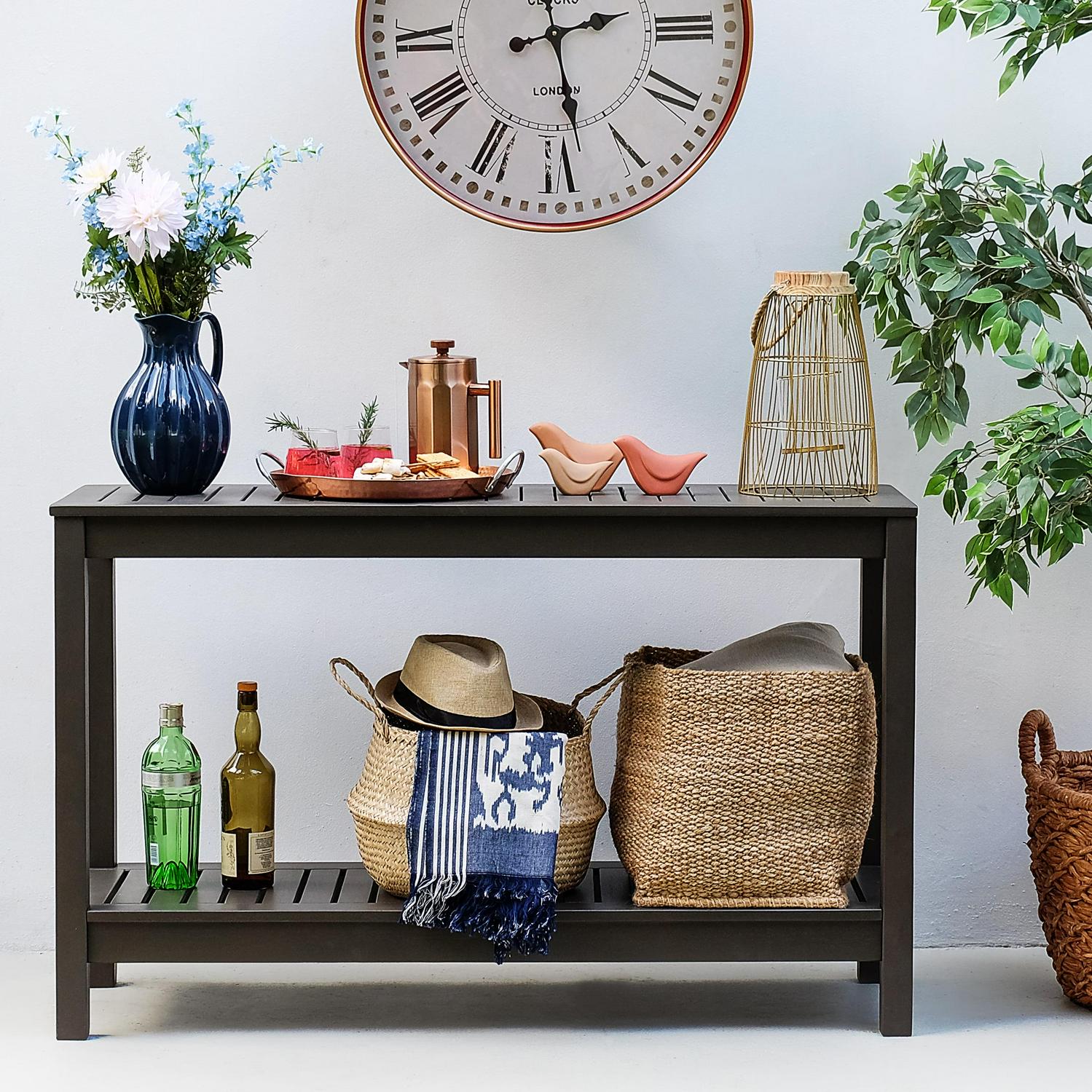 Crafted from beautiful and durable Mahogany wood, Sailendra Solid Wood Outdoor Console Table is built to accompany casual open-air dining. With the dark grey finish in a polyurethane coating to accentuate style and comfort, this wood patio console table is an essential piece for casual garden entertaining. Multi usage as an outdoor bar, entertainment unit, or accent piece. COLOR DISCLAIMER: Actual product color may vary from the images shown. This is due to the fact that every monitor or mobile display has a different capability to display colors and so every individual may see these colors differently. In addition, lighting conditions at the time the photo was taken can also affect an image’s color. We try to edit our photos to show the images as life-like as possible, but please understand the actual color may vary from your monitor. We cannot guarantee that the color you see accurately portrays the true color of the product.