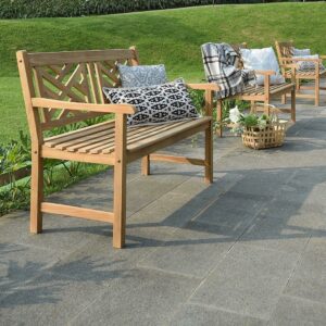 This garden bench is a stylish outdoor attraction that fits with the beauty of nature thanks to its bold simplicity and inventive design. This garden bench’s cross-hatch style makes it a real centerpiece in practically any garden or outdoor location. It can also be savored and admired throughout the year. This comfortable teak seat is made of good quality solid teak wood and measures four feet long, making it ideal for your porch or garden.