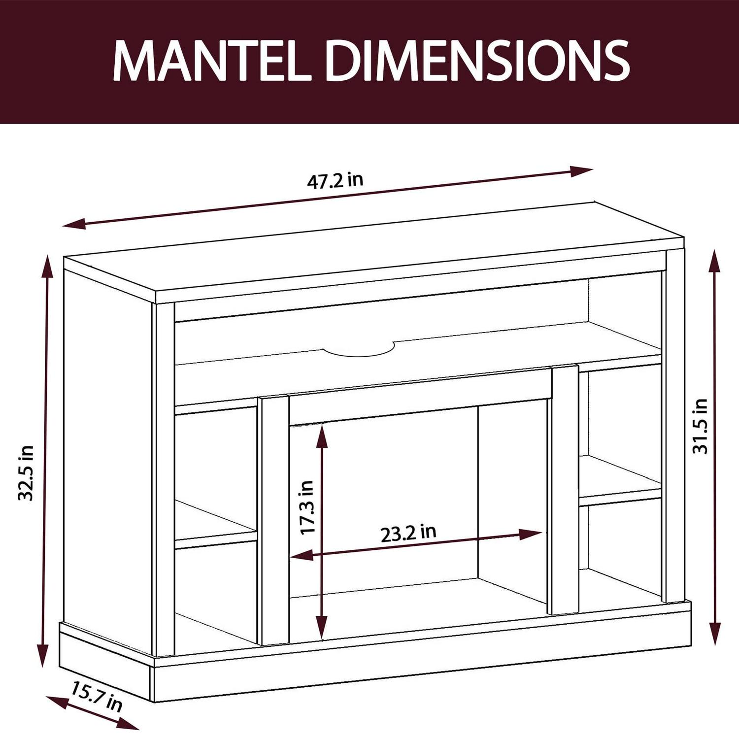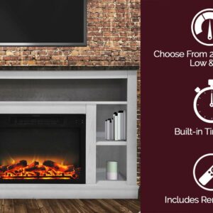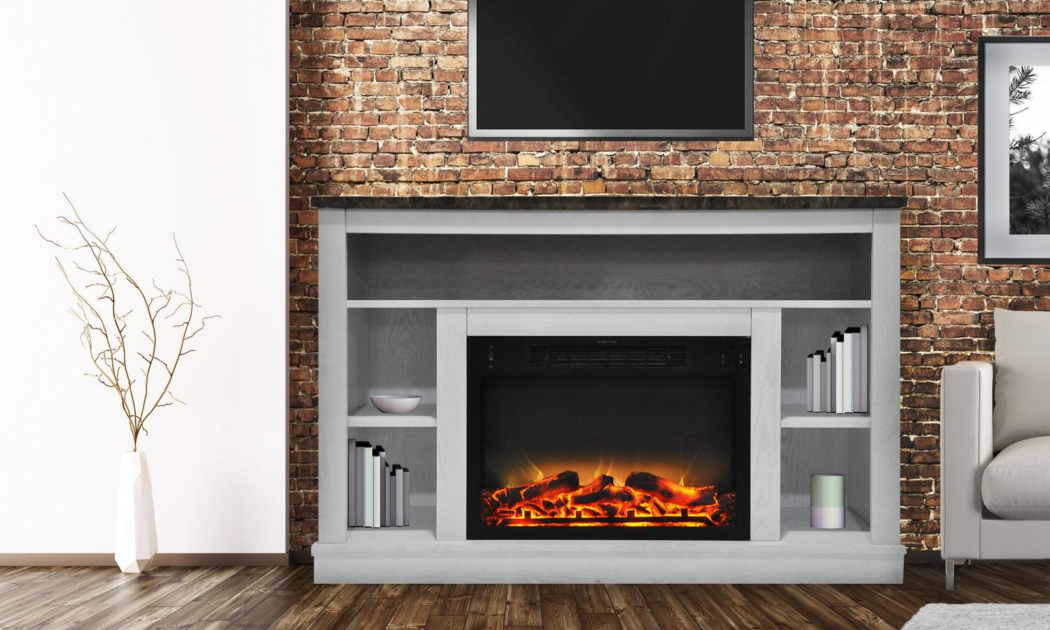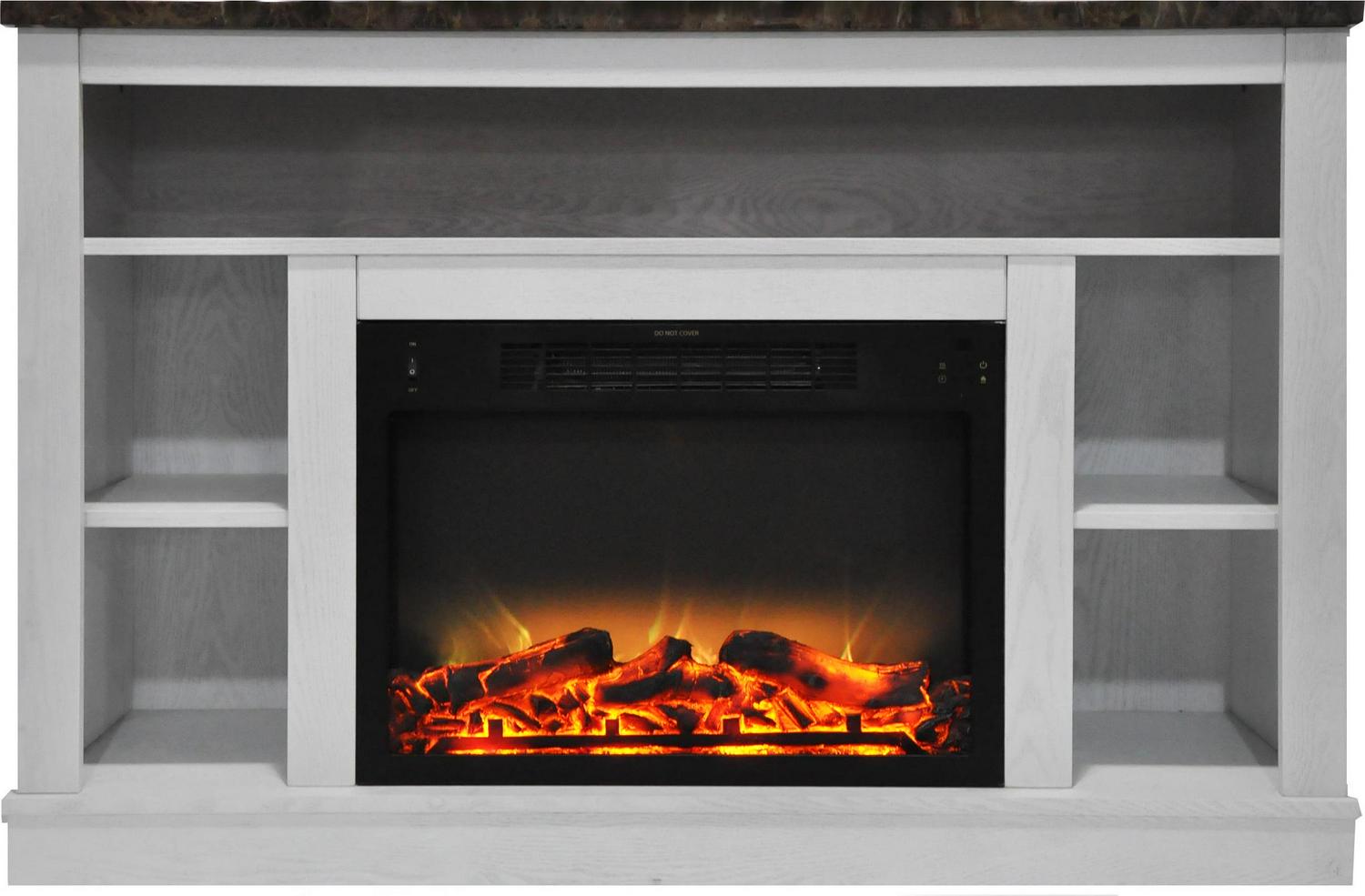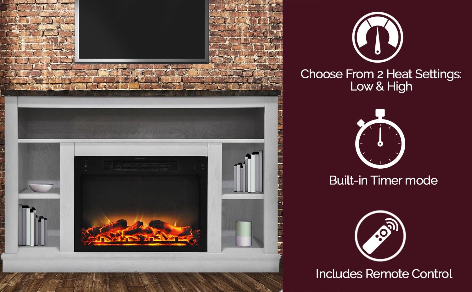 The Seville fireplace by Cambridge combines the best of both worlds – a stylish fireplace mantel entertainment center that maximizes space and a powerful electric fireplace heater that warms the room. The faux marble mantel top accommodates flat panel TVs up to 50 inches and adds a touch of elegance to the design. Underneath, a long recessed shelf and 4 compartments offer ample storage space. The centerpiece is a log and grate display with incredibly realistic flames. With the ability to quickly warm a room up to 210 square feet, the Seville electric fireplace heater is ideal for adding comfort to any room. Choose from dual heat settings and set the timer according to your needs. Adjust the flame brightness to set the perfect mood for any occasion. Offering year-round enjoyment, the mesmerizing flames can also be set to function independently of the heat. Transform your space into a cozy retreat with Seville by Cambridge, and enjoy the warmth and ambiance a fireplace brings to life.