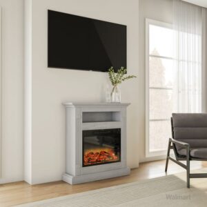 – Sienna 34 in. electric fireplace with enhanced log display and White mantel