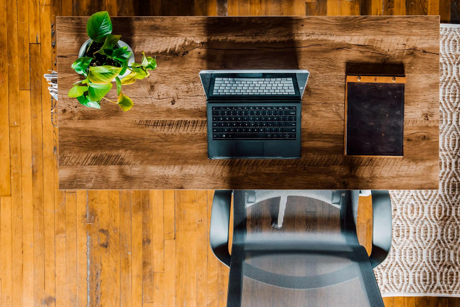 – At 47′ wide and 22′ deep, this desk has a large desktop