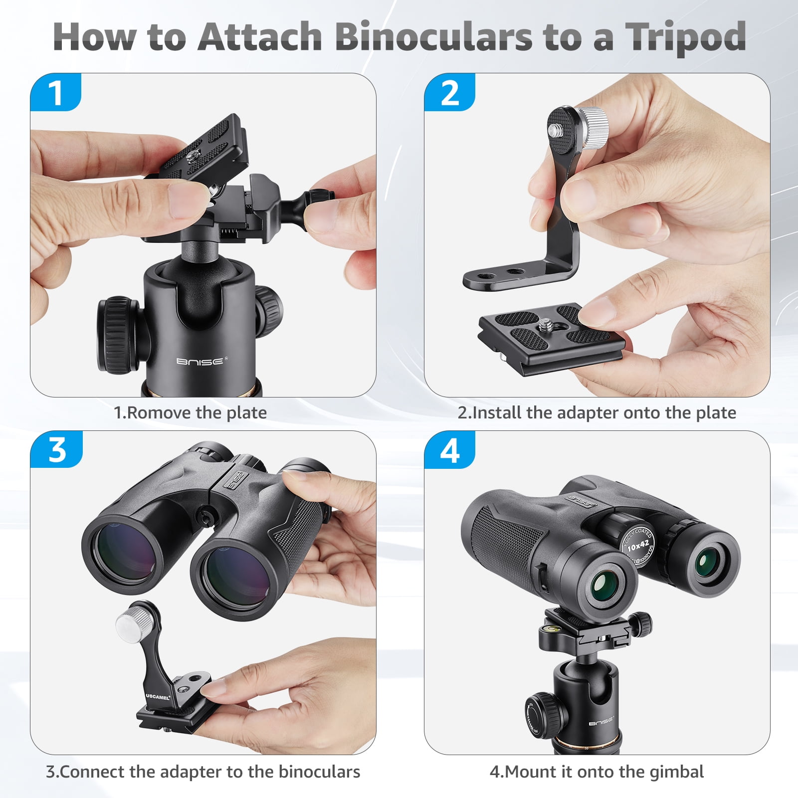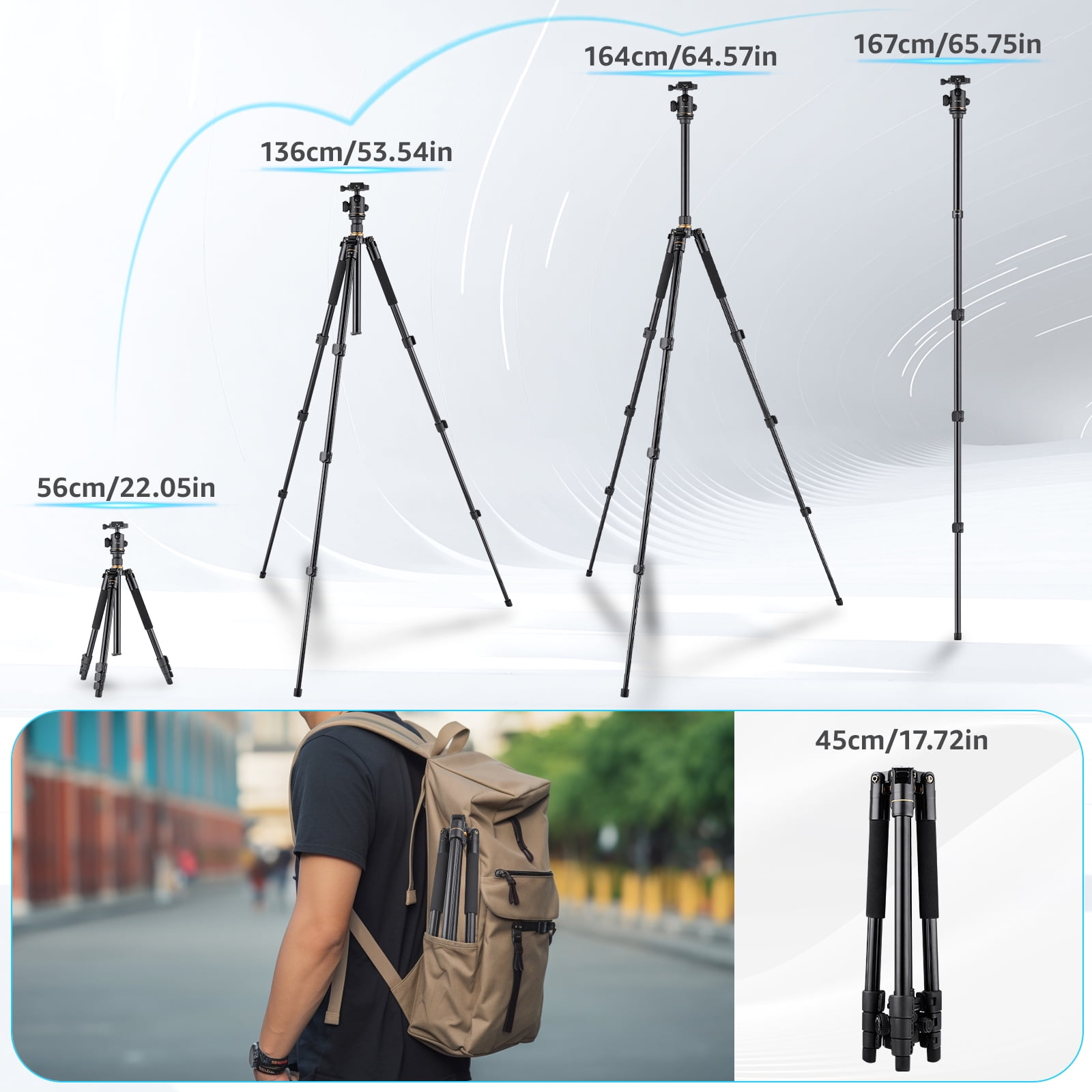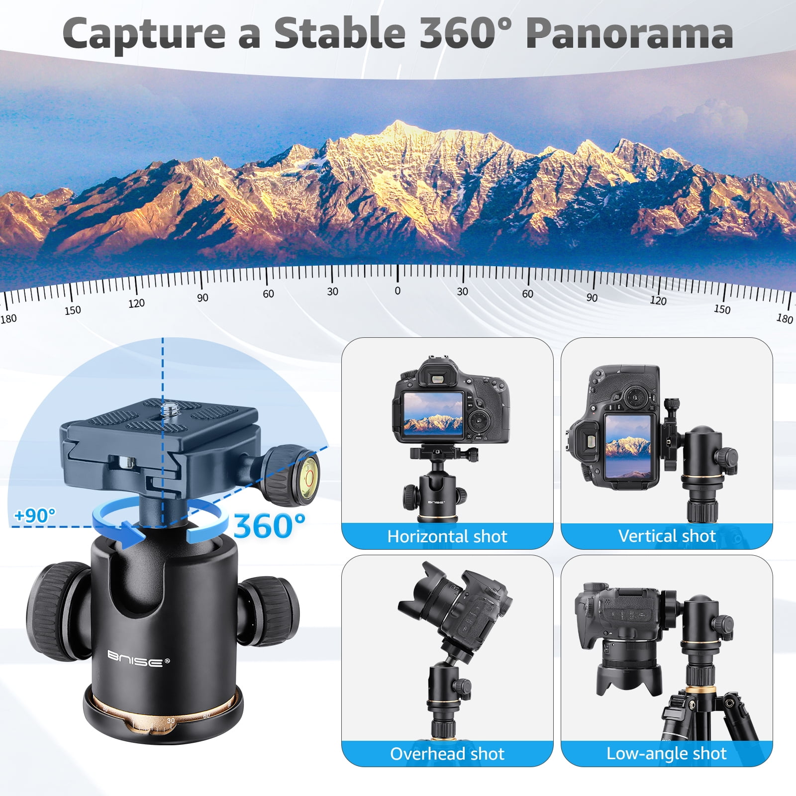 【STABLE AND PORTABLE】BNISE tripod for cameras folded length is only 17.7 inches, with a maximum extended height of 65inches. Made of aluminum alloy, it weighs just 3 lb The central column consists of 1 sections, and the 4-section legs feature quick flip locks, balancing portability and stability. 【FAST OPERATING SYSTEM】360 degree metal ball head and the quick release plate are locked by knobs, and the whole quick release plate is compact, light and fast, and it has a strong compatibility, which can be applied to most quick release plates; 1/4″ screw is suitable for most cameras, DSLR camera, projector and telescope, etc. 【LOW ANGLE SHOOTING】Through structural optimization, a quick-removable central axis is configured. By quickly inverting the center axis, the camera can be closer to the ground for low-angle or macro photography of plant or insect,or other creative photography. 【DETACHABLE MONOPOD】Convertible to Monopod: A special leg can be quickly detached and connected to the central column, transforming into a monopod camera stand for another shooting option. The monopod height can be adjusted from up to 65.7″. 【QUICK SET-UP】Simplicity allows for tripod setup or storage in less than half a minute, offering convenience and time-saving benefits that ensure you never miss a scenic moment during your travels. 【THOUGHTFUL ACCESSORIES】 The tripod for camera and phone comes with a phone holder, binoculars adapter and carry bag. Camera stand comes with two quick release plates for more efficient switching between different shooting devices. Materials: Aluminum Alloy Load Capacity: 8kg/17.6lbs Maximum Working Height: 164CM/64″ Minimum Working Height: 56CM/21.8″ Folded Length: 45CM/16.14″ Weight: 1450g/3.1lbs Leg Lock Type: Flip Lock Leg Diameter: 14mm-25mm/0.54-0.98″ Sections: 4 Sections Leg