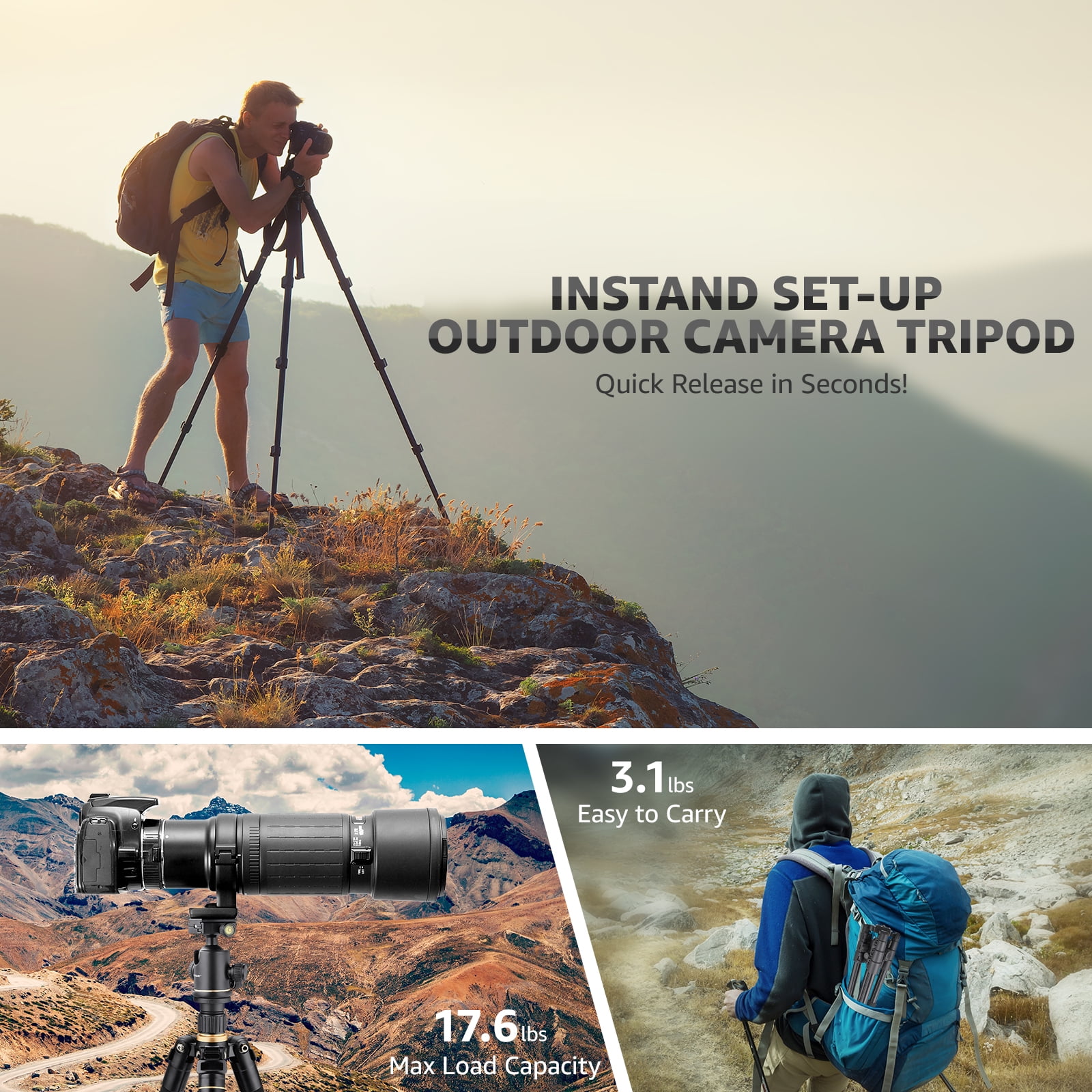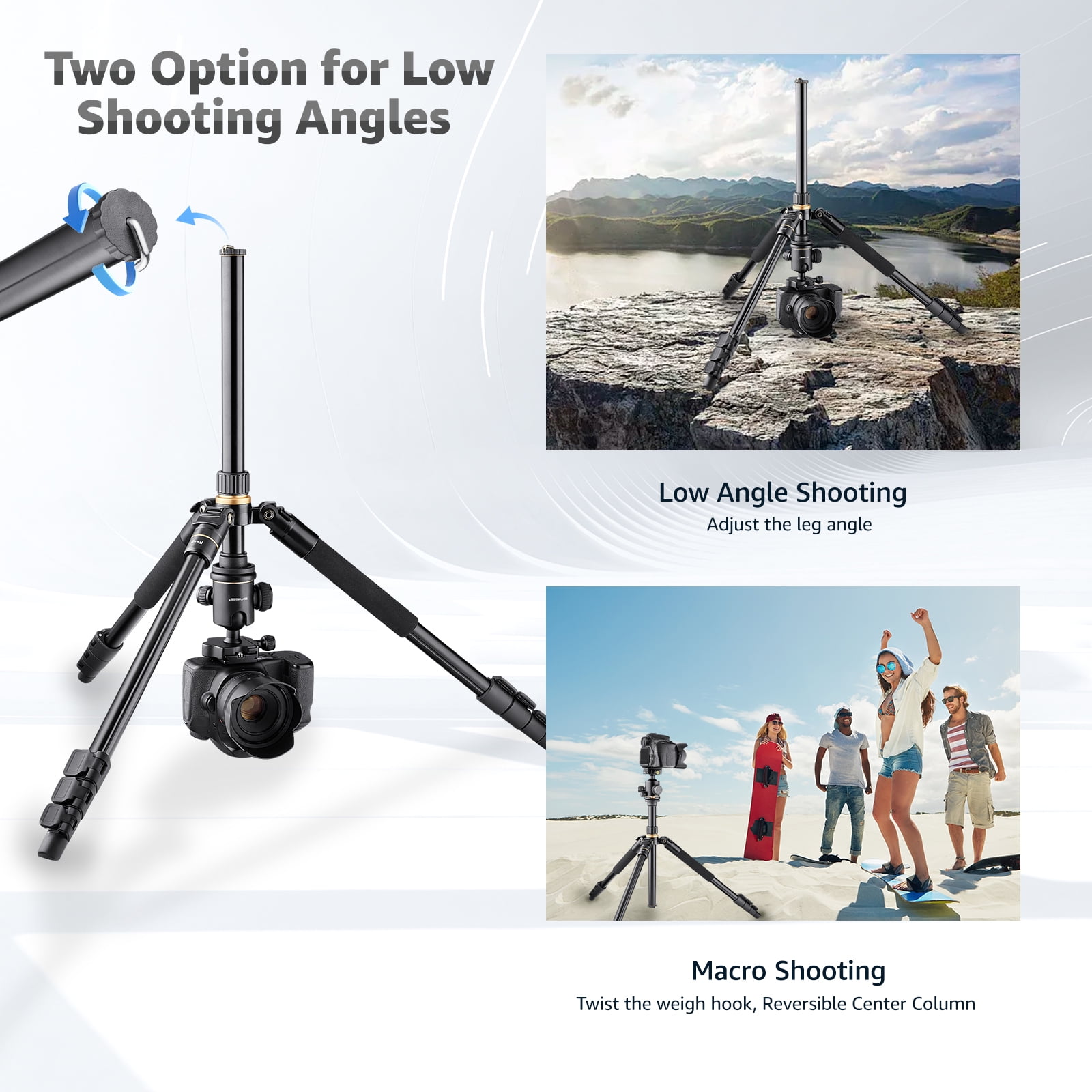 This versatile camera tripod features a lightweight and portable design with 4-section legs that can adjust the height from 22 inches to 64.57 inches. The quick-release plate buckle allows for easy and fast setup, while the 360-degree metal ball head provides precise camera positioning and panning. Crafted with durable aluminum and ABS, the tripod can support up to 8kg/17.6lbs, making it compatible with most DSLR cameras, projectors, telescopes, and even smartphones and tablets. The inverted center column enables low-angle shooting, making it a versatile choice for a wide range of photography and videography needs.