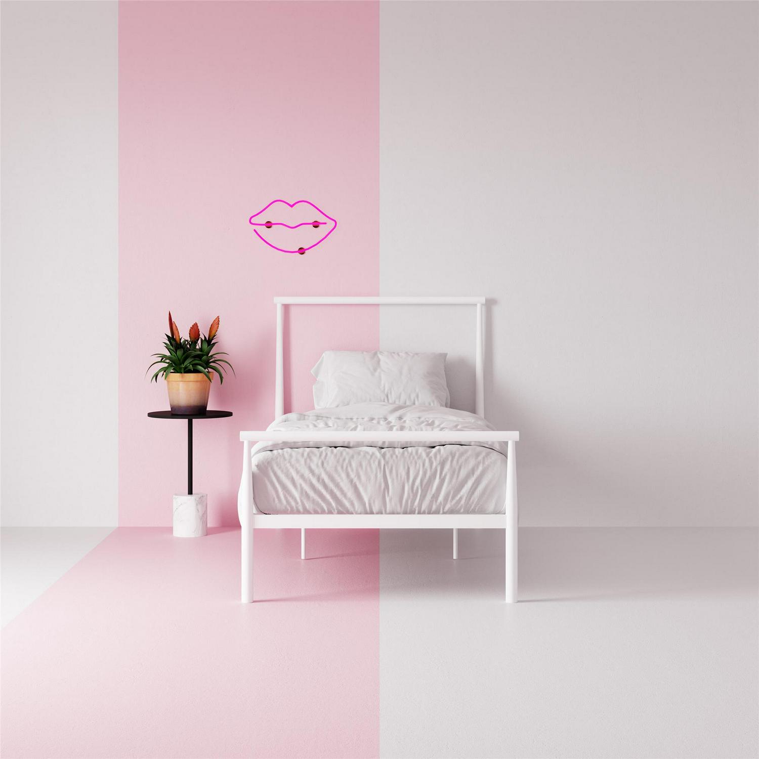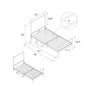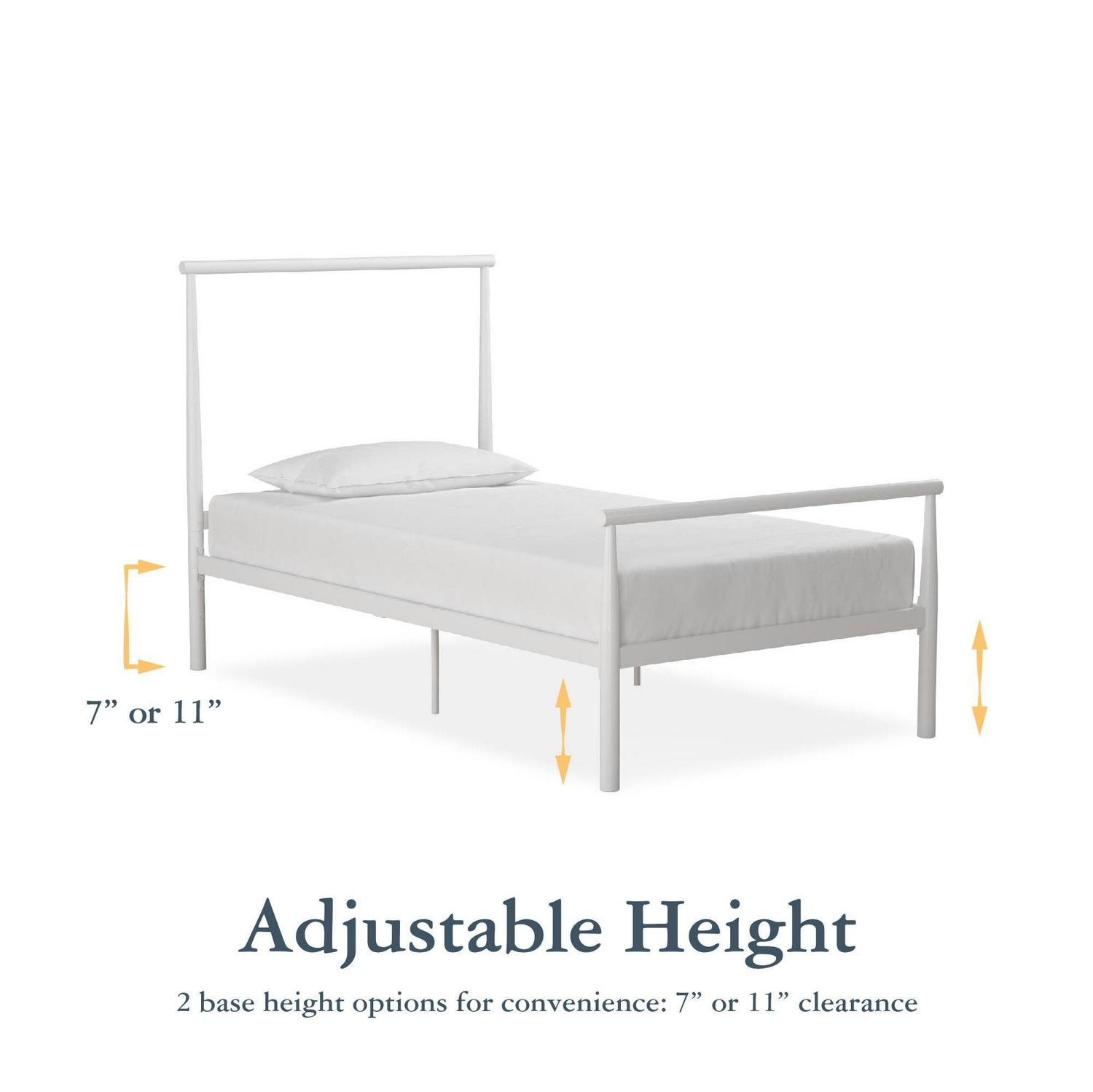 Minimalist yet modern, the DHP Calixa Metal Bed is the perfect addition to make a simple statement in bedrooms of any style. The bed frame features a headboard and footboard with a rectangular silhouette that will add a flair of industrial style while letting you make your room your own! You want to fill your house with souvenirs from your travels Go for it! You want to add a colorful wallpaper to create a unique accent wall Scour the internet to find the best one! The DHP Calixa Metal Bed is here to complement and enhance your personal style and help bring your bedroom décor to the next level. Even better, the bed frame’s all metal construction features an adjustable base height to allow you to choose between a 7″ or a 11″ under bed clearance depending on your storage needs. Now that is what we call functionality. The Calixa also includes secured metal slats to remove the need to purchase any additional box spring or foundation. Mattress sold separately. Available in Twin, Full, or Queen size and in multiple colors. So add a touch of luxury to your new & improved space.