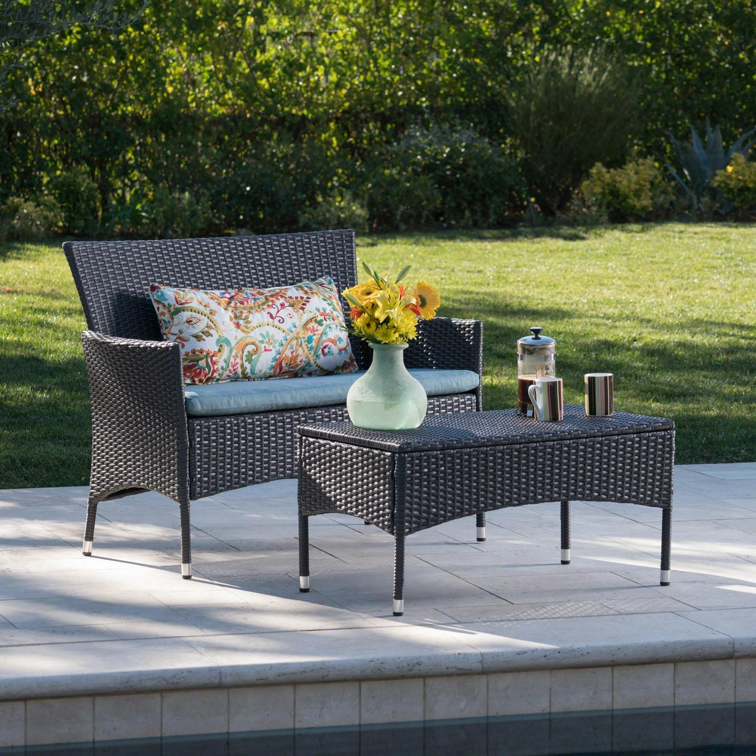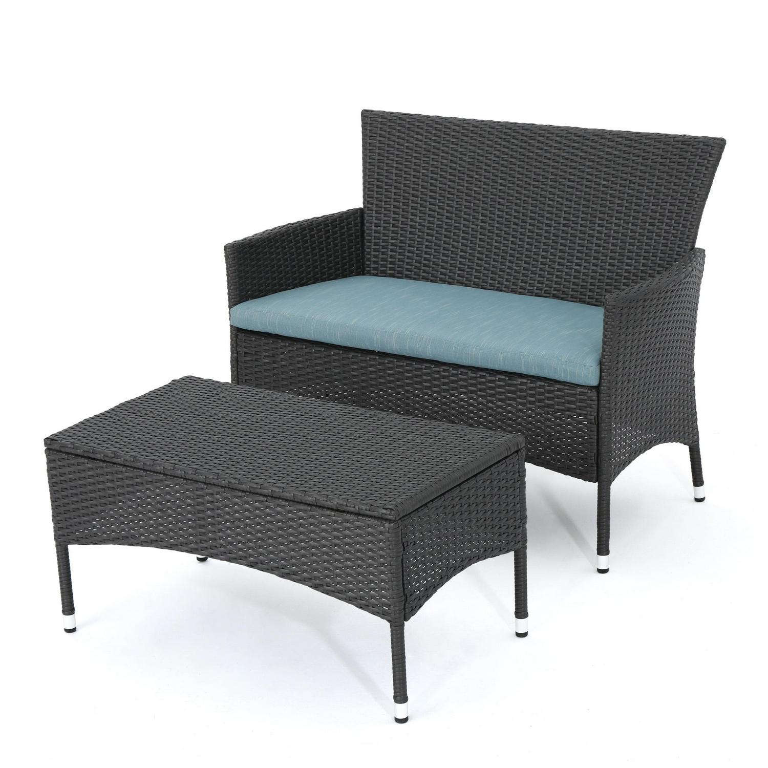 Camilo Outdoor 2 Piece Wicker Loveseat and Coffee Table Set with Cushion, Gray and Teal