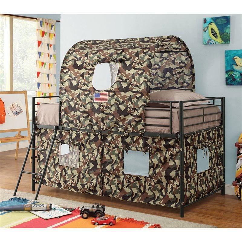For the little soldiers in your home comes this camouflage loft bed. The bed is finished in army green camouflage and features solid metal construction. Guard rails protect against sibling invasions or accidental falls. Bed also includes a tent cover for those late-night covert operations (that is, cookies and milk). Comes with ladder to easily climb to the top bunk.