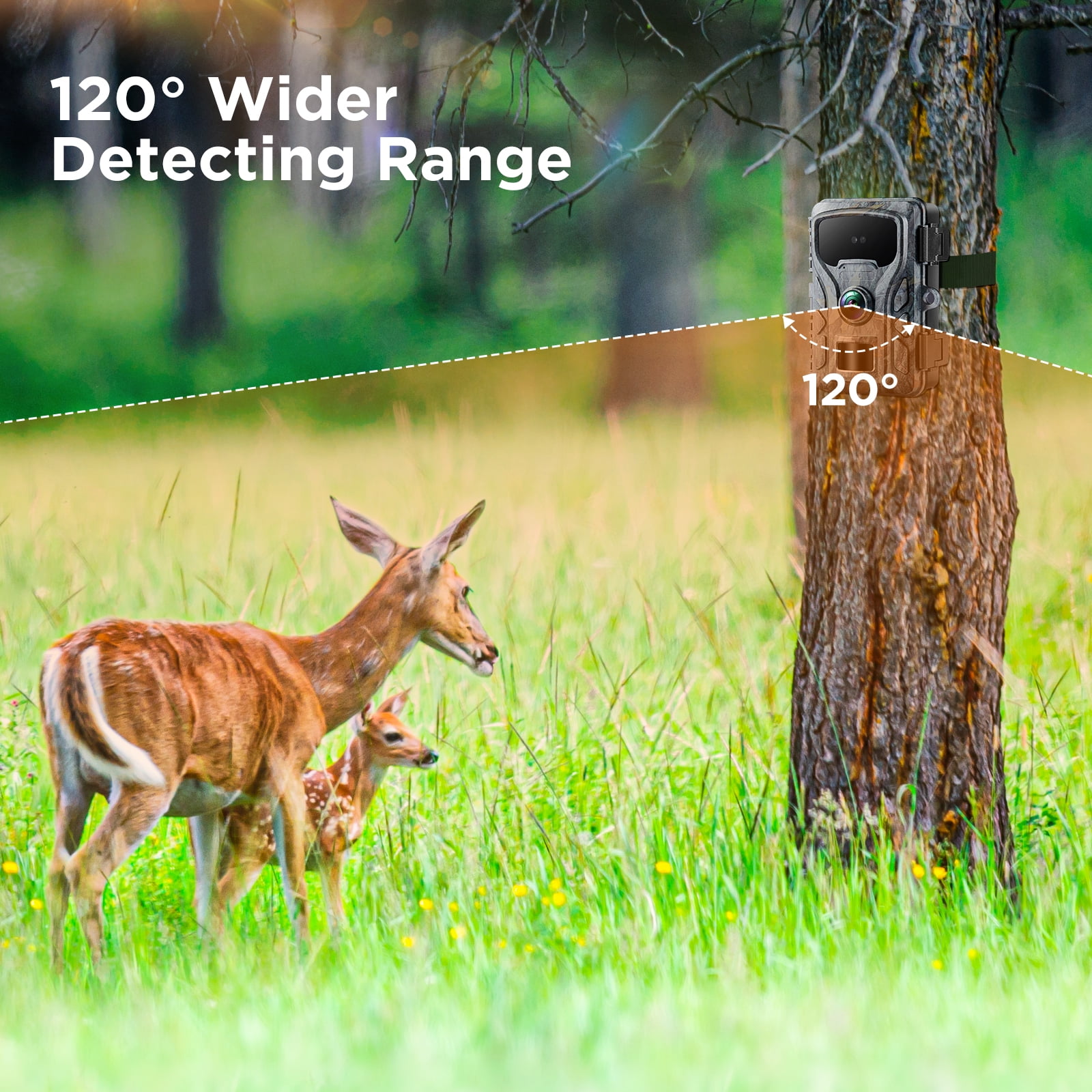 The game deer camera is equipped with a 120° detecting range, which allows you to get an excellent broader view.The unique ultra-high concealment appearance makes the camera cleverly blend with nature and will not be easily discovered by humans and wildlife.