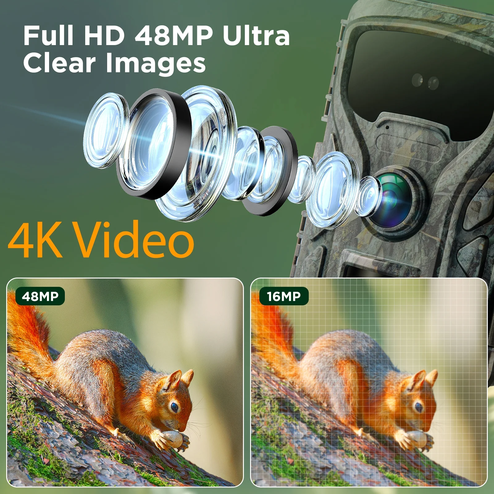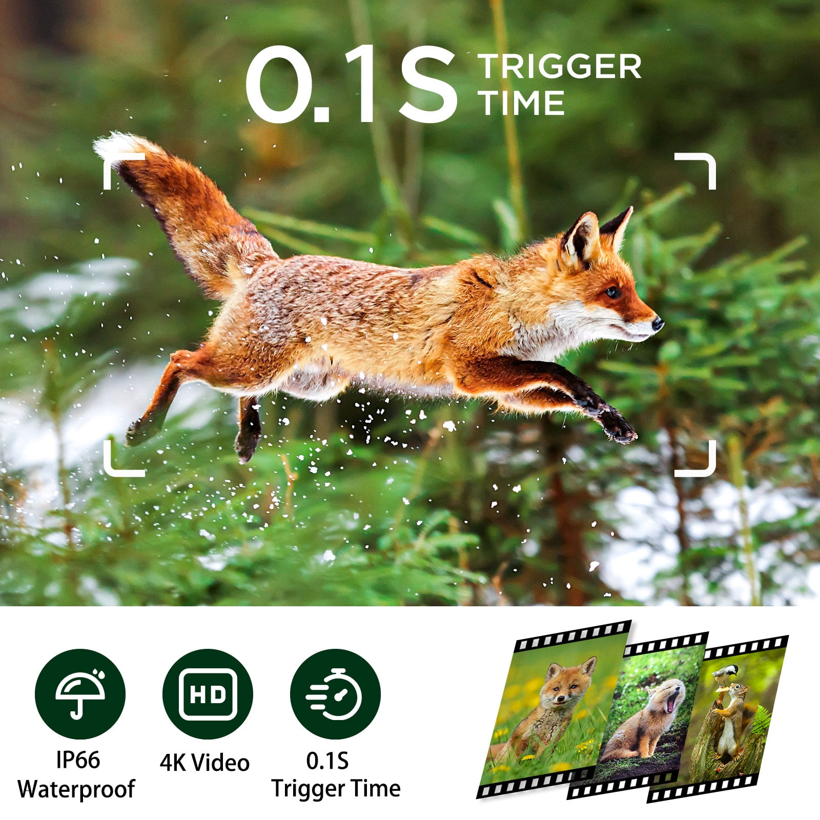 The trail camera is equipped with advanced sensors, once detecting the movements, the hunting camera will be triggered instantly without delay, and will not miss any wonderful moments. The trigger distance is up to 65 feet.