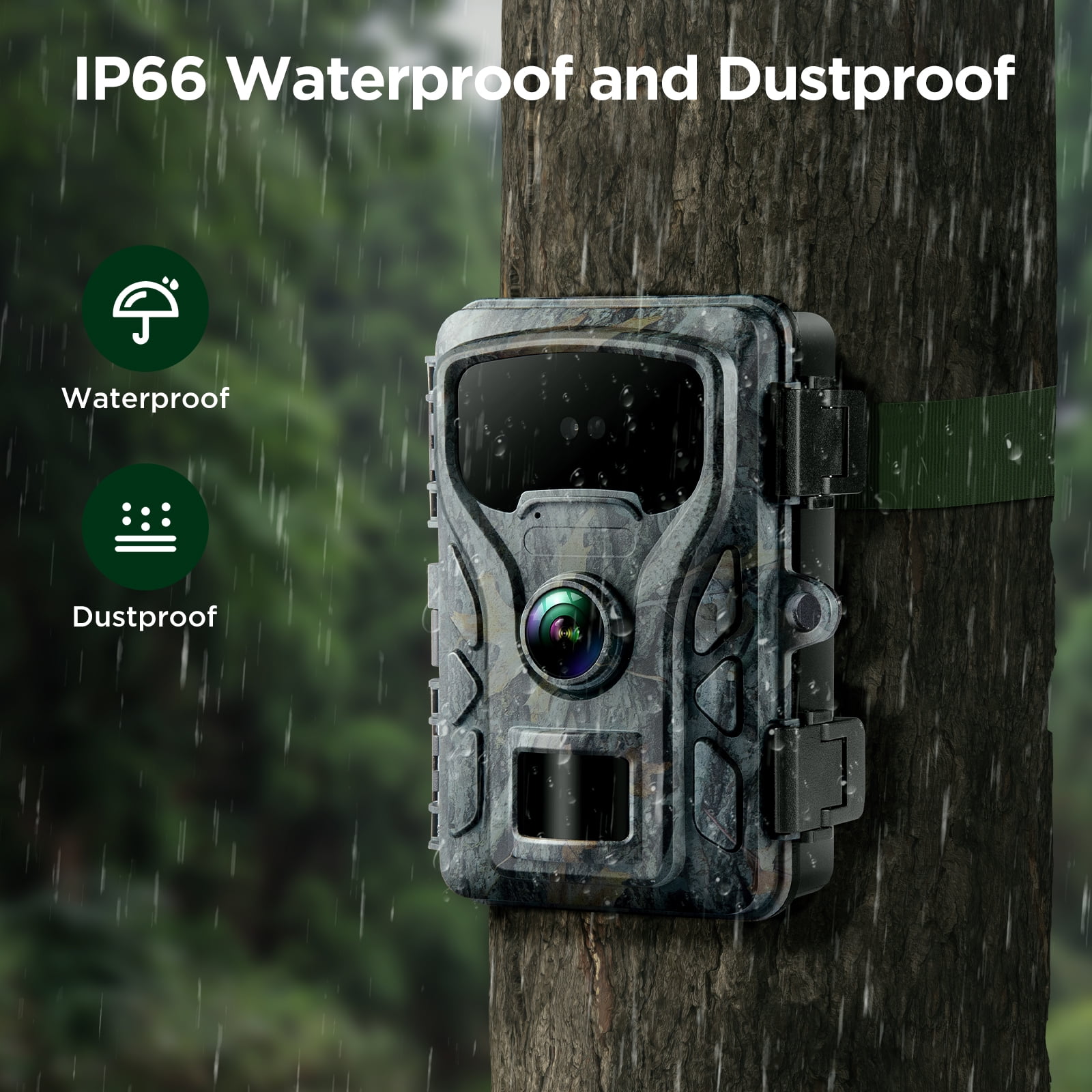 Hunting game camera with 2 pieces High Power 850 nm LEDs support super clear night vision, which can deliver ultra-clear and detailed night vision, letting you catch any moment at dark night. Trail camera with IP66 waterproof camera body design, the hunting game camera has waterproof rubber ring and weatherproof casing.