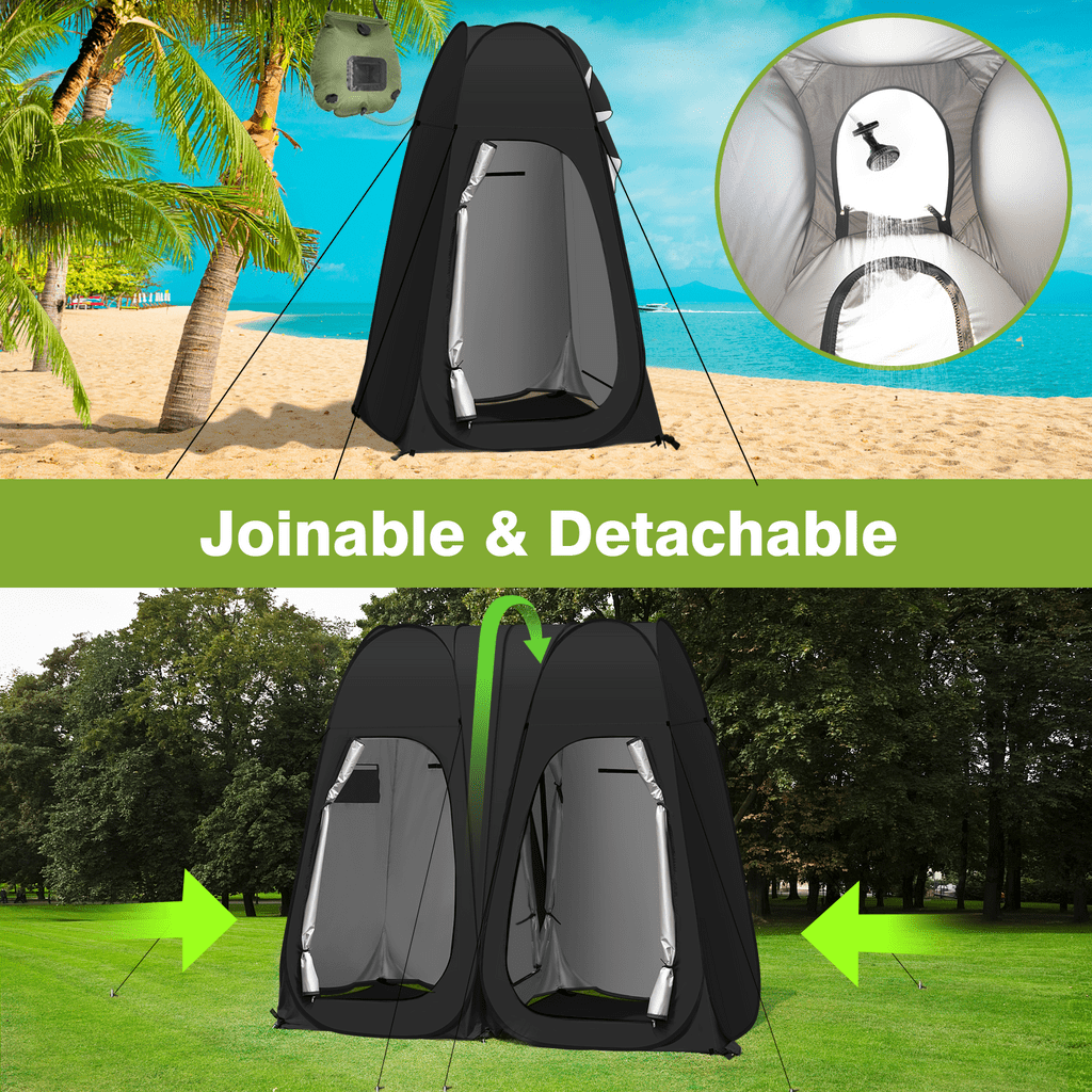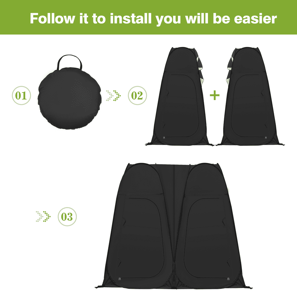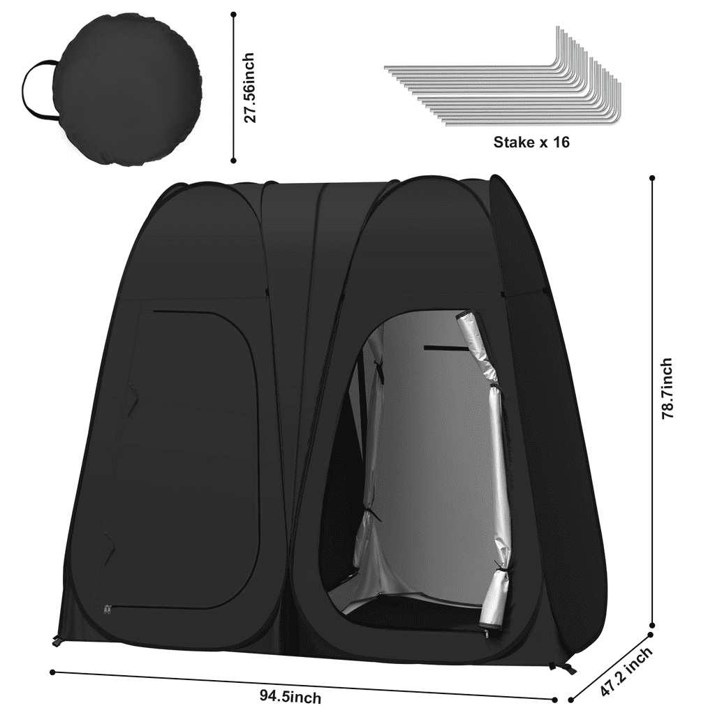 Vecukty Double Shower Tent offers two private spaces that can be connected and used independently for using the toilet and enjoying a quick shower the same time when you go camping outside. When two people use it, they can take a bath at the same time, and when one person uses it, the space can be separated from wet and dry, one takes a bath and the other changes clothes.It also provides a changing room for models when she/he need to change clothes when you shoot outdoors, or for your kid’s dancing competition, or for clothes vending stands. 💙❤️【HIGH QUALITY & EASY TO SET】 Vecukty Double Changing Room Privacy Tent can folds down in seconds, no assembly required. Ultra-lightweight construction allows for easy transportation including a carrying bag. Pop up Privacy Tent made from high-quality polyester taffeta 170T water-resistant coating. Includes a flexible steel frame for premium durability. 💚❤️【MULTI-FUNCTION & PORTBALE】 Removable roof with waterproof zippered skylight on top with can withstand the sun and rain. Mosquito nets with shower holes at the top ensure air circulation while maintaining privacy.There are two windows on the behind, which can also be opened for ventilation.Lightweight and easy to store, store it up and take it away at any time. 💛❤️【ACCESSORIES】 With 1 side bag to store your phone, tablet, or other items, and 1 removable bottom mat, 1 hook for hanging emergency lights ,1 clothesline for hanging wet clothes or towels,8 plastic studsand 16 ground nail Improved stability. 🧡❤️【DIMENSIONS】 Measuring 78.7” high and 47.2” x 94.5” in length and width when open, the instant portable outdoor shower tent affords free standing and comfortable movement within. And it can be folded into a compact size of 27.5″ L x 27.2″W x 2.75″ H.