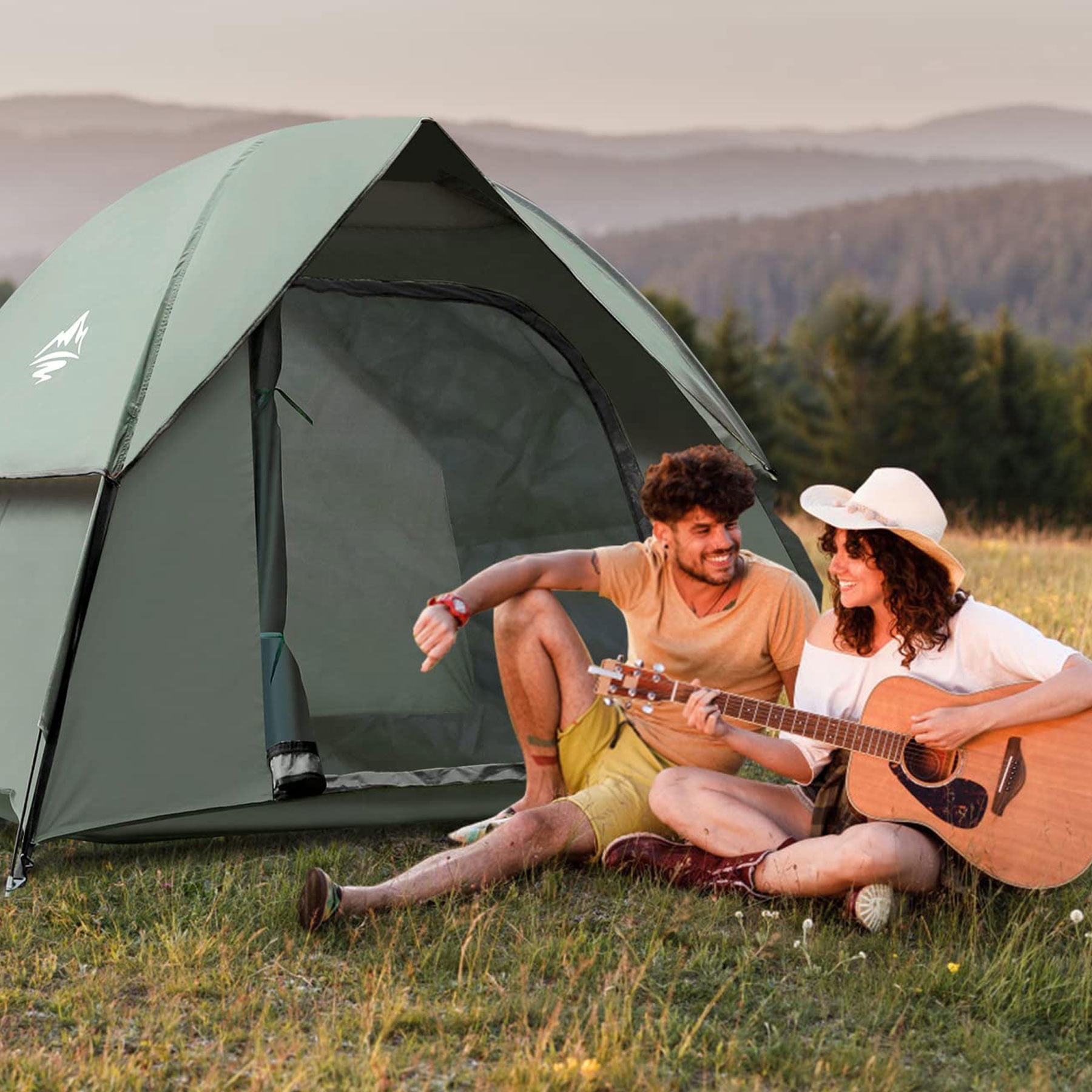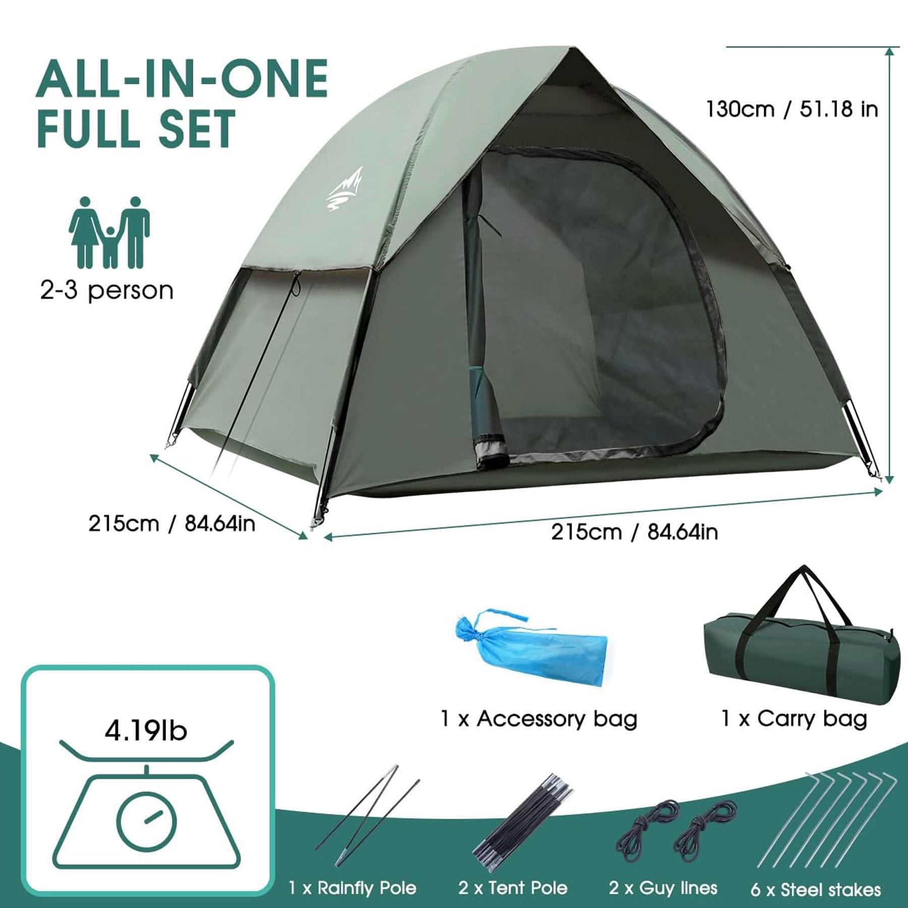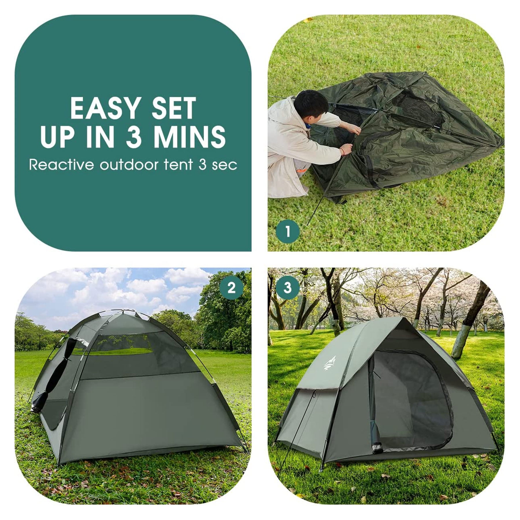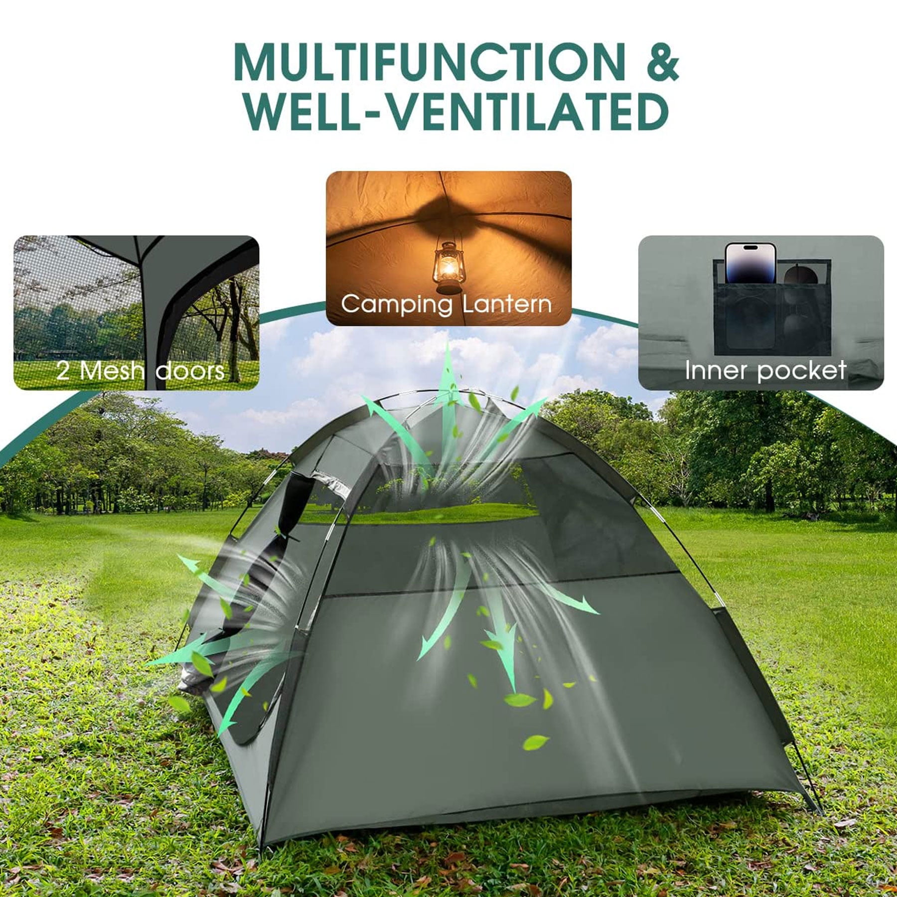 Spacious enough for up to 3 persons Removable rainfly Water-resistant and weatherproof Anti-UV UV50+ Mesh windows for air circulation and bug protection Durable fiberglass poles Easy and quick to set up and fold down Lightweight and portable for easy transport 【Durable Construction】 Our camping tent constructed out of high-quality 100% polyester fabric for waterproof and long-lasting performance, and offers UV protection of 50+.The underneath is made of 210D waterproof Oxford fabric that keeps the interior dry during the night, to ensure that water will not penetrate. 【Easy Set-Up】2 people could set up the tent easily in 3 min. The camping tent features well-made poles, a removable rain fly, ventilation, and an interior storage pocket to keep your contents neat and organized. 【Water & Windproof & Sun Protection】 Polyurethane-coated polyester material has 66D 210T sun protection (UV50) index while being waterproof up to 3000mm, the detachable umbrella and double-seamed waterproof strip keep the tent safe from rainwater penetration. Automatic fiberglass poles and 8 ground steel stakes add to the wind resistance. 【Multifunctional and Breathable】2 mesh windows and roof promote air circulation inside the tent in hot summer, and the inner pocket can be used to store small items. 【All-in-One Set】 The tents for camping are suitable for 2 -3 people. With the unfolding size of 83.85*82.28* 51.18in.This camping tent weighs just 5.2lb,which makes it very convenient to carry and you can have a comfortable and beautiful journey.