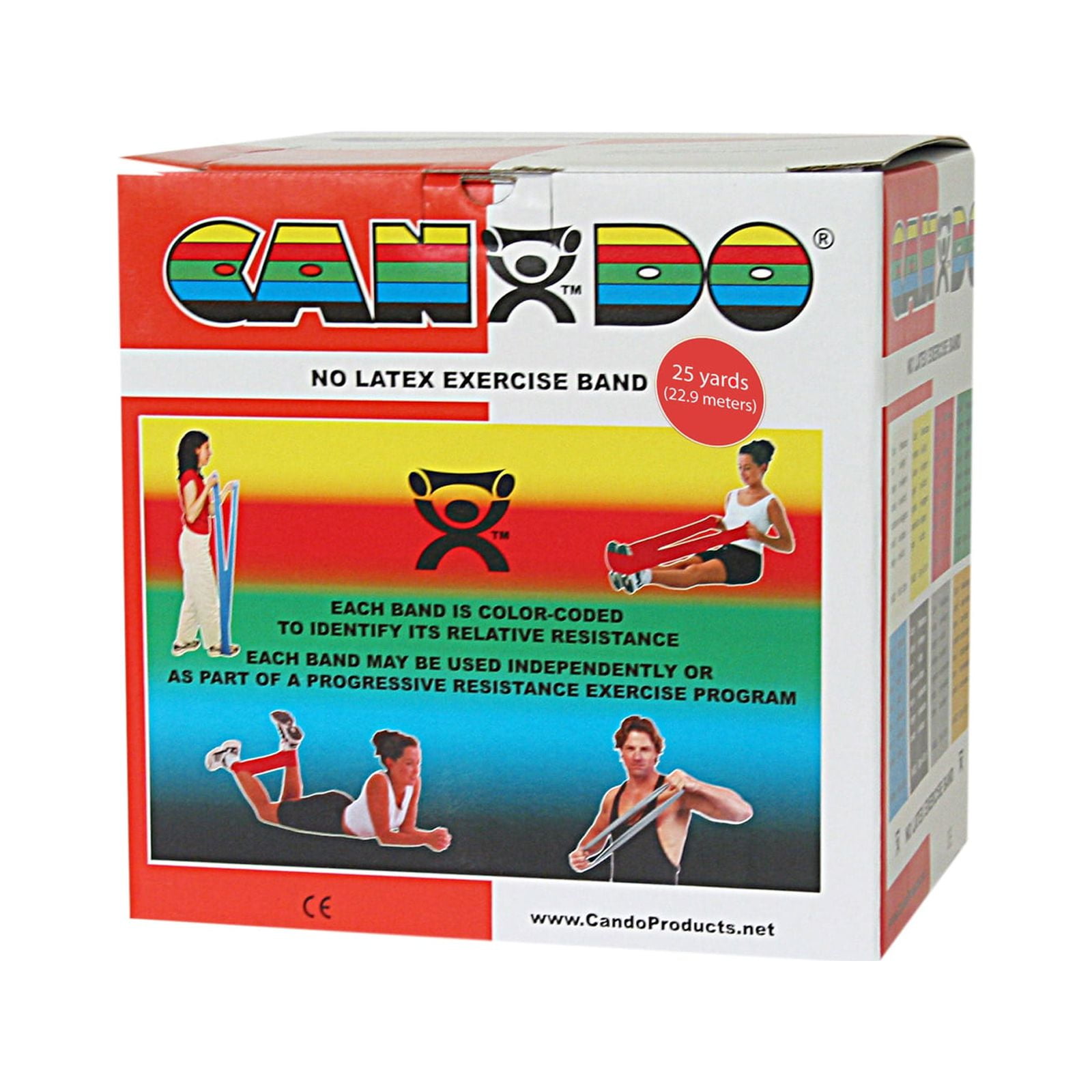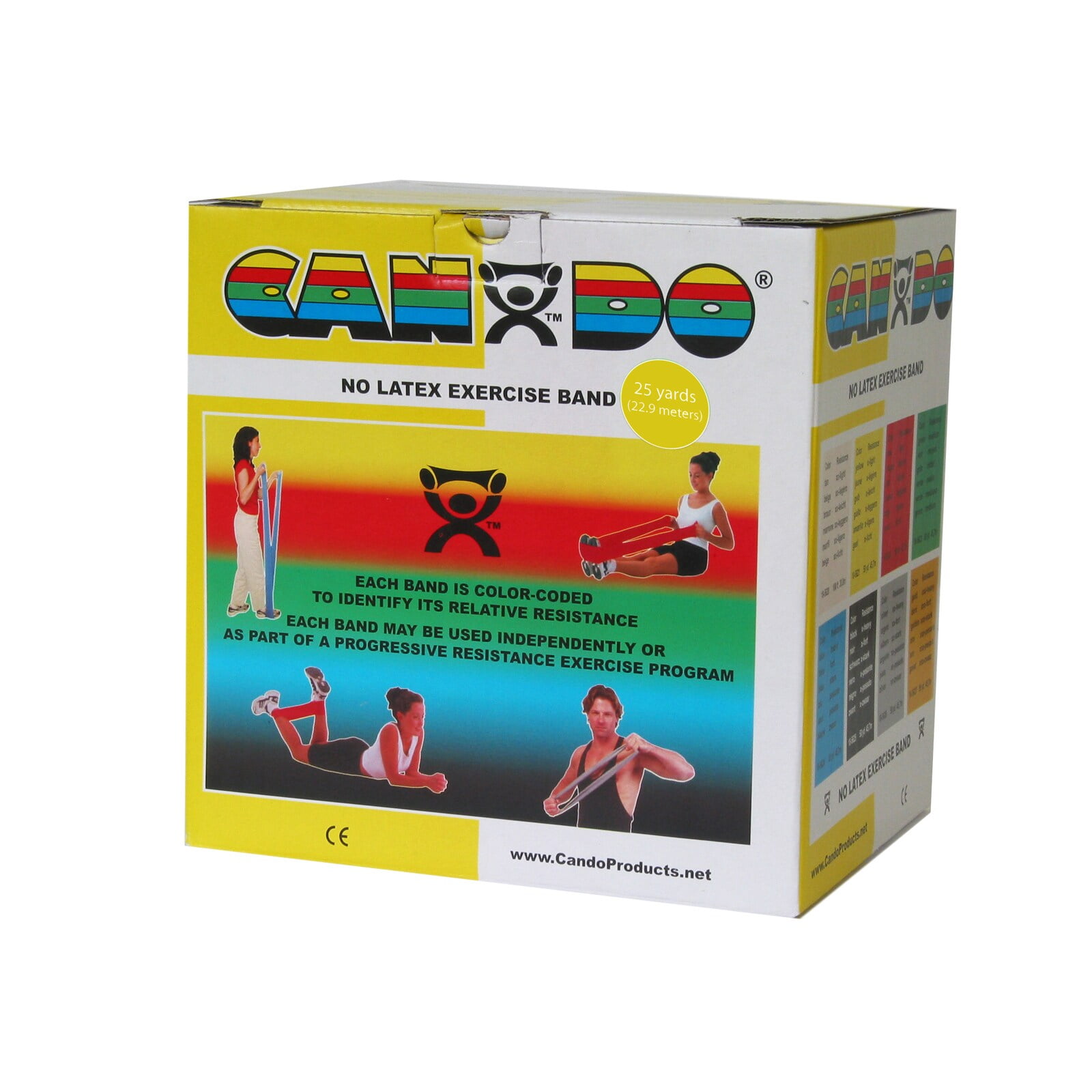 Cando Latex Free Exercise Band – 25 Yard Roll – Black – X-Heavy – 10-5635 – CanDo resistive band exerciser is packaged in a polybag. Simply remove exercise band from polybag and it is ready to use. CanDo high quality synthetic latex-free exercise band has been used for physical therapy and athletic training by clinics, fitness centers and individuals since 1987. It has become a well known staple of many physical therapy programs. The latex free formula has been specially created to mimic the stretch characteristics of latex band. CanDo exercise band is an economic solution for upper and lower body exercise. Lightweight, compact and portable. Durable. Effective when used alone, or with handles and anchors. Color-coded according to the exercise band’s resistance. CanDo is licensed to use the Thera-Band color sequence so resistance level is easily identified. Available in 8 levels of resistance for progressive exercise. Levels range in order of resistance from least to greatest resistance: tan, yellow, red, green, blue, black, silver, gold. Uniform width – each band is 5″ wide.