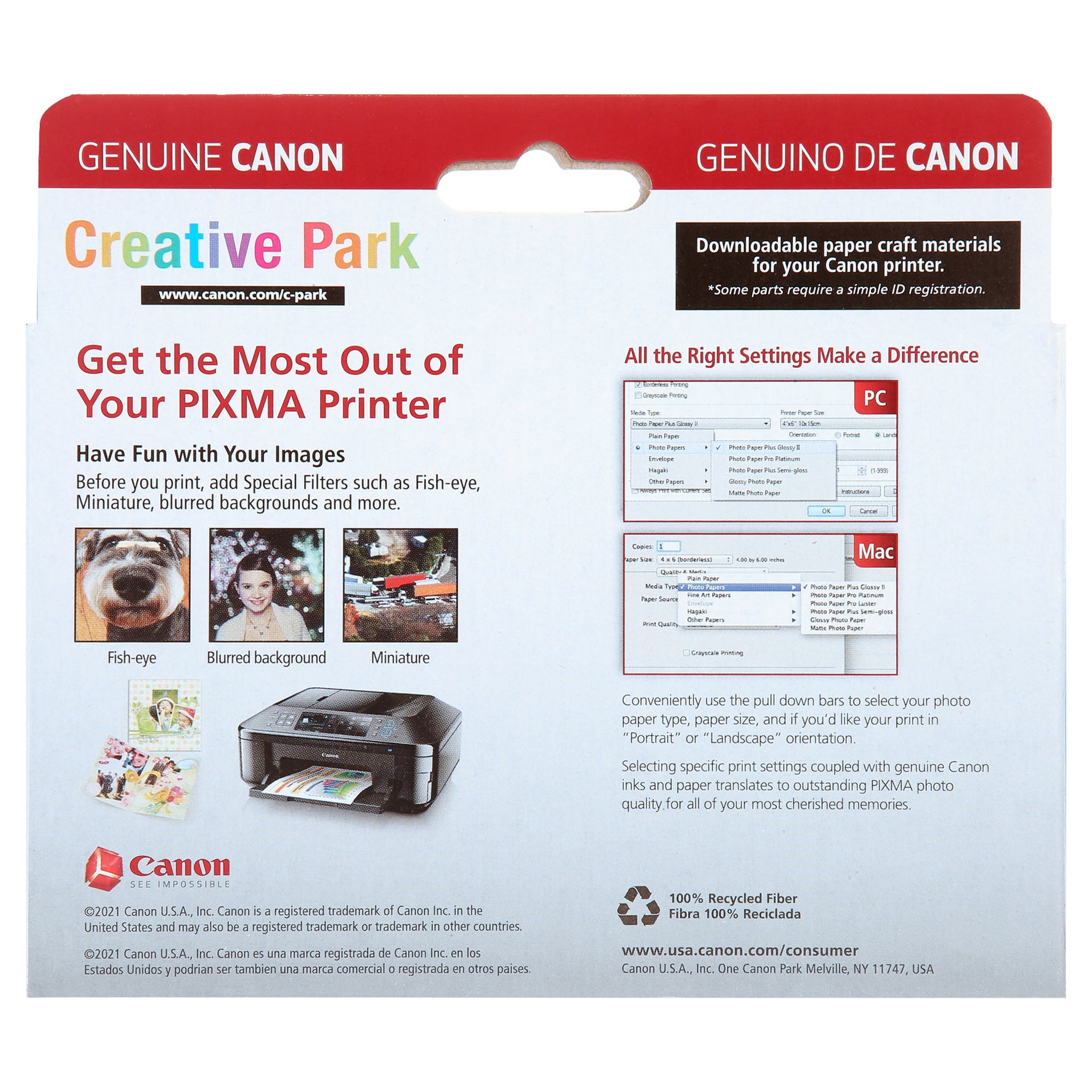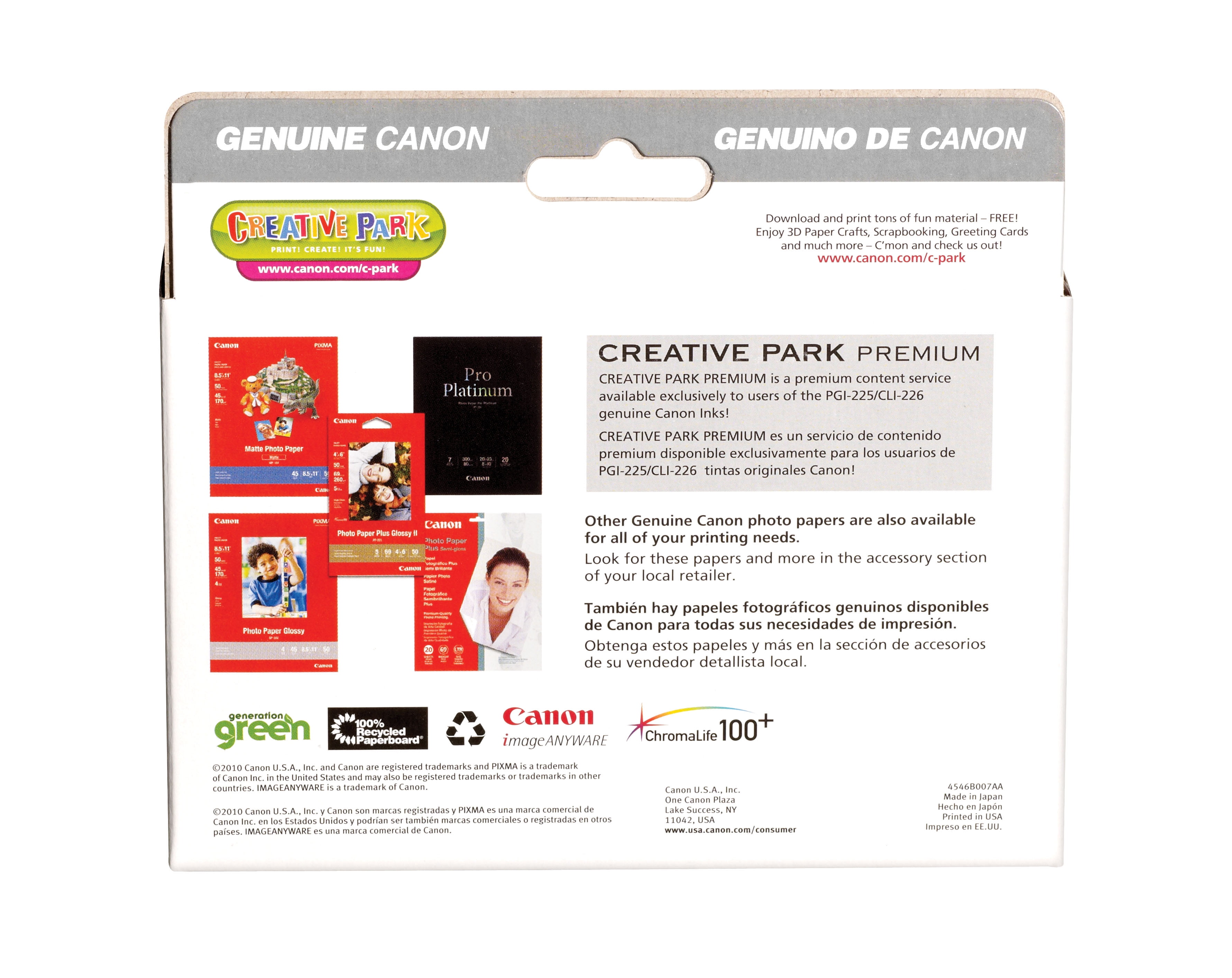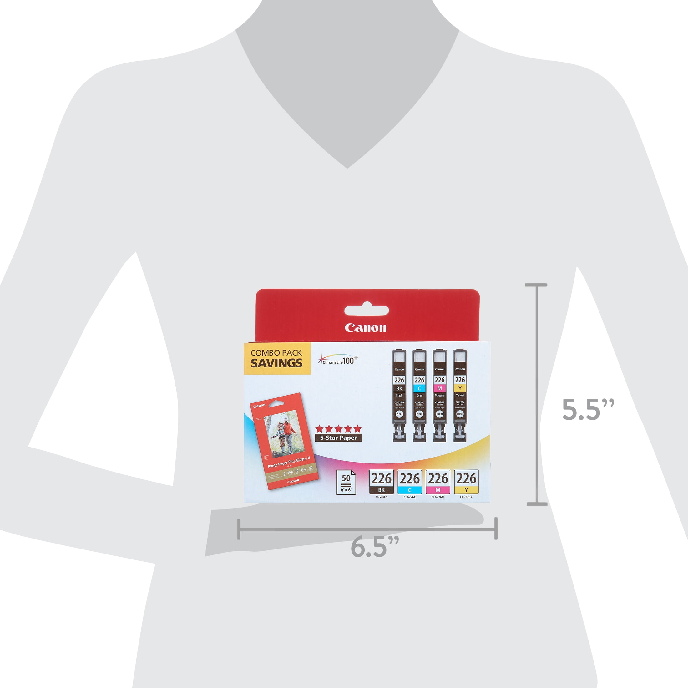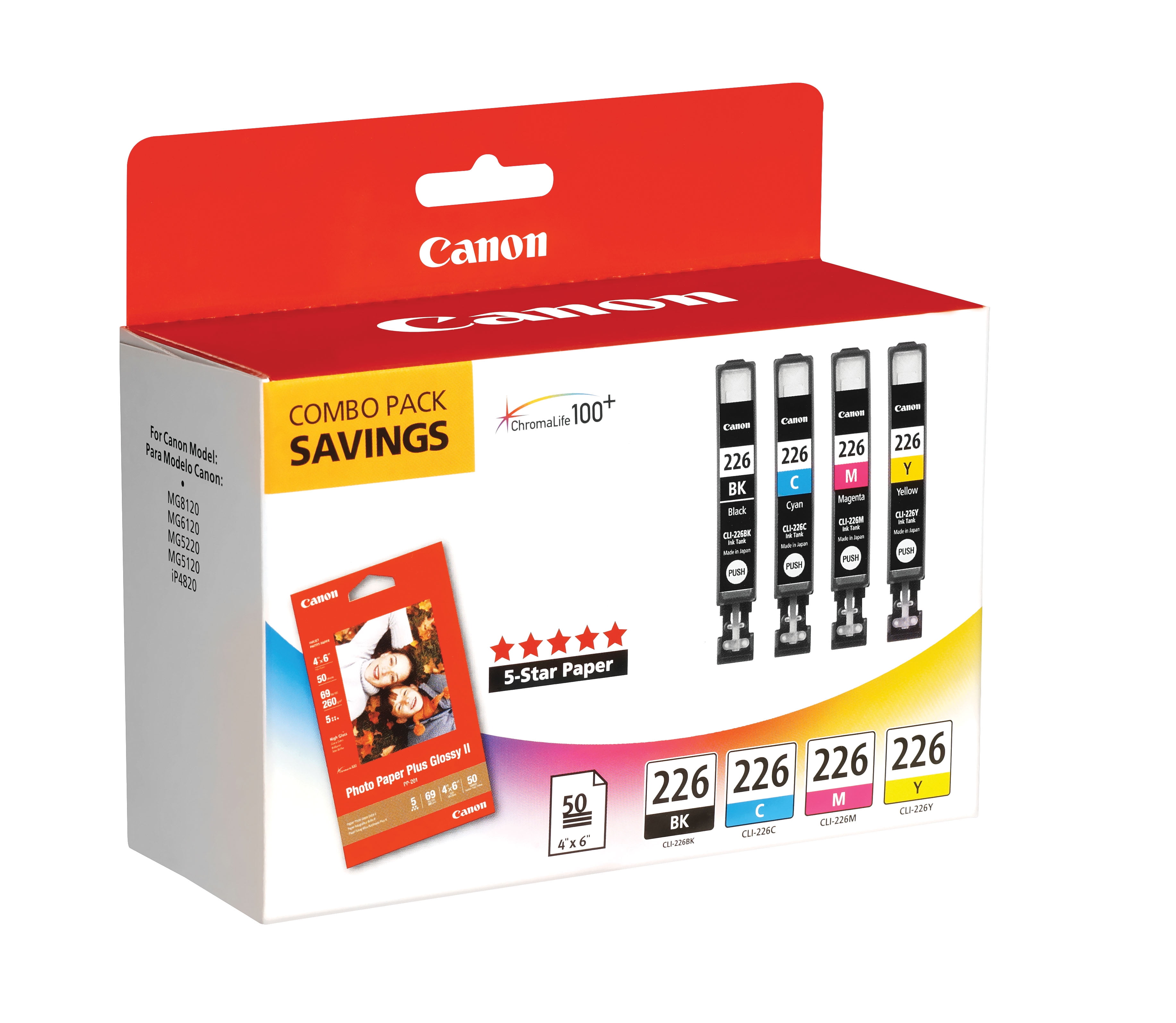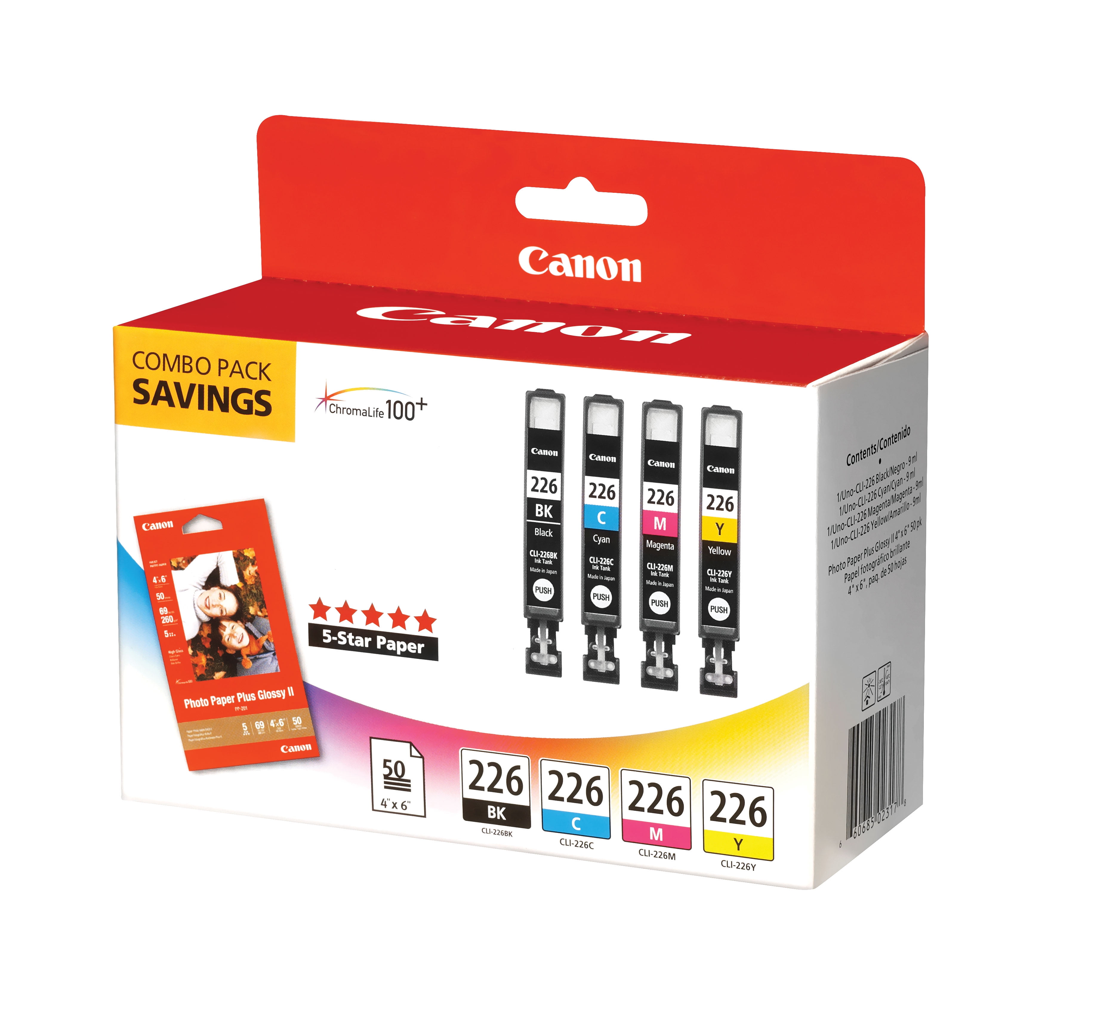 Contains one of each CLI-226 Black, Cyan, Magenta, Yellow and a 50 sheet pack of Photo Paper Plus Glossy II Genuine Canon Ink and paper for quality and reliability Save money, have extra ink and paper when you need it with a combo pack