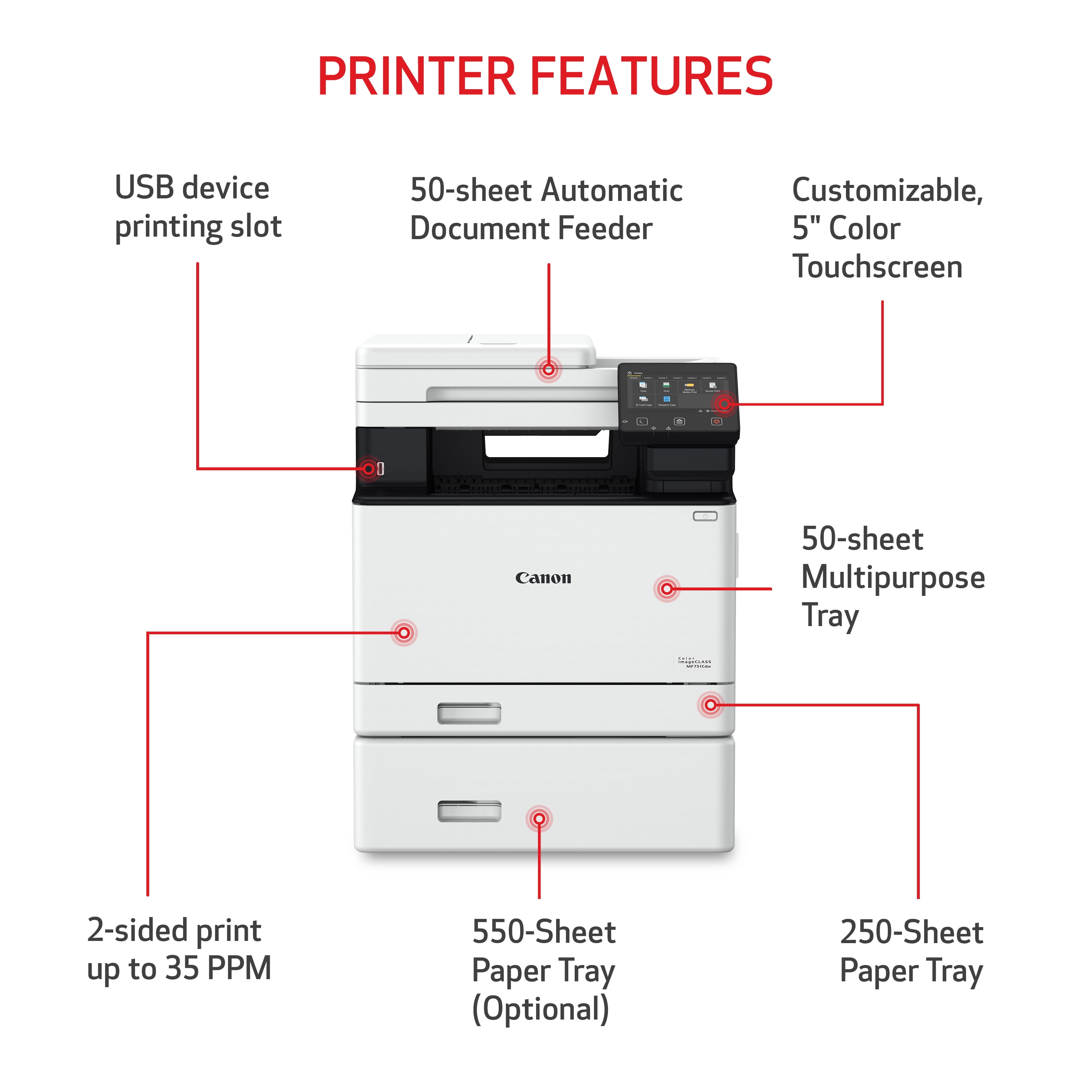 Color, Wireless 3-in-1 (Print | Scan | Copy) Print up to 35 Pages Per Minute (CL/BW) Uses Toner 069 / 069 High-Capacity Toner 250-sheet Standard Cassette, 50-sheet Multipurpose Tray, Expandable Paper Capacity of up to 850-sheets Using Optional Cassette PF-K1 Auto 2-sided Printing, 50-sheet Simplex Automatic Document Feeder            ENERGY STAR®, EPEAT Silver             3-Year Limited Warranty Chromebook Compatible