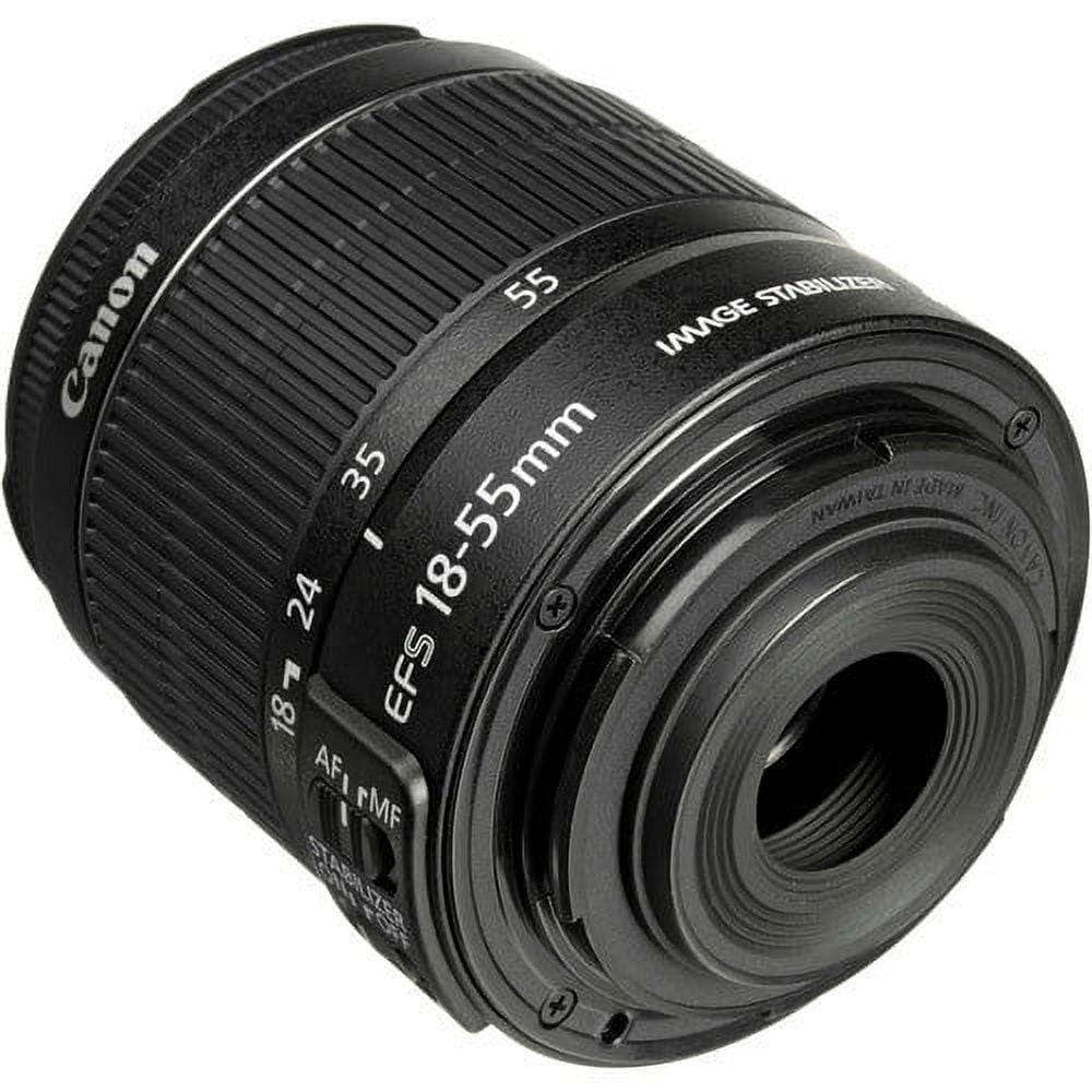 Canon EF-S 18-55mm f/3.5-5.6 IS Zoom Lens (2042B002): Focal Length & Maximum Aperture: 18-55mm f/3.5-5.6 Lens Construction: 11 elements in 9 groups Diagonal Angle of View: 74° 20′ – 27° 50′ Focus Adjustment: AF (DC motor), with manual focus option Closest Focusing Distance: 9.8″/0.25m Filter Size: 58mm