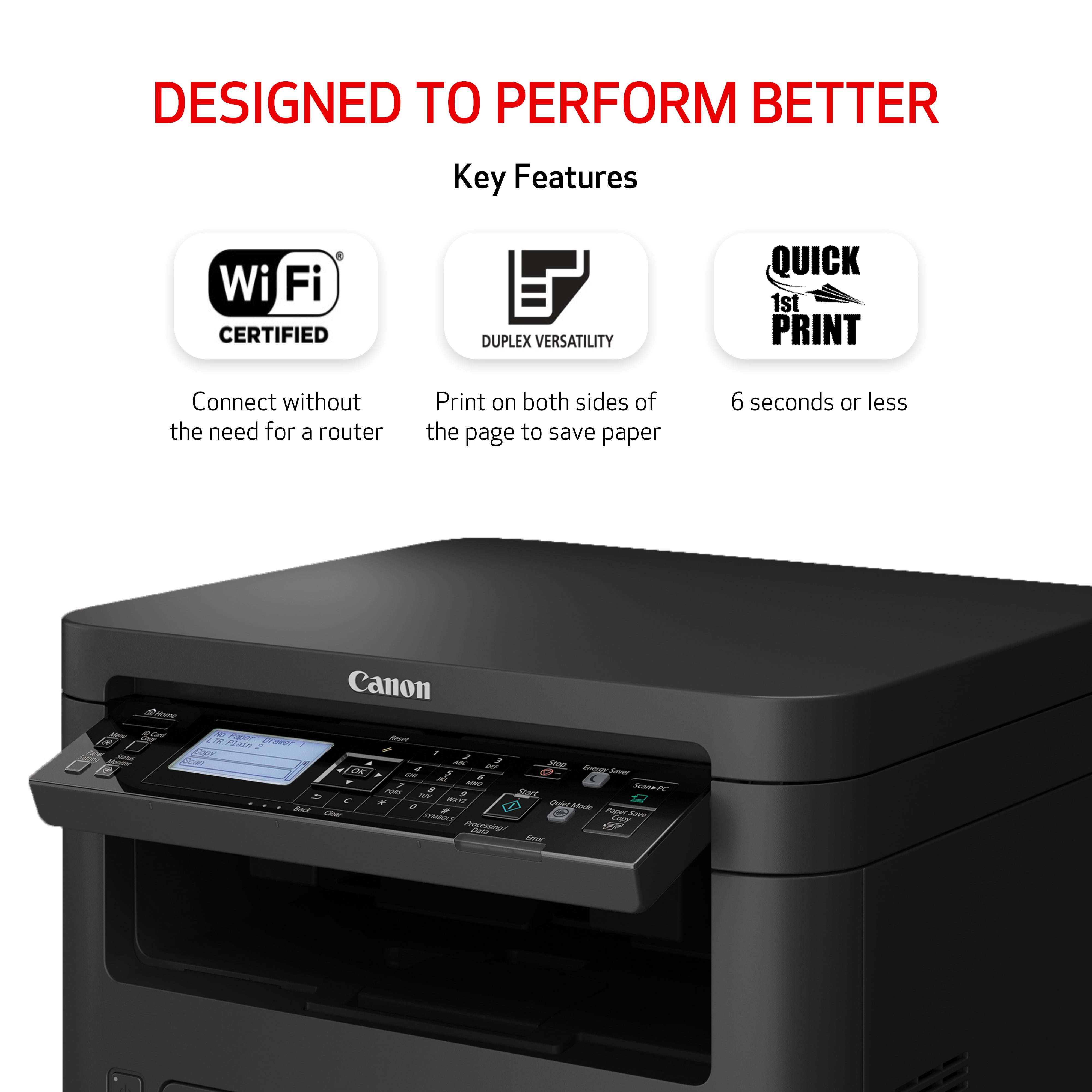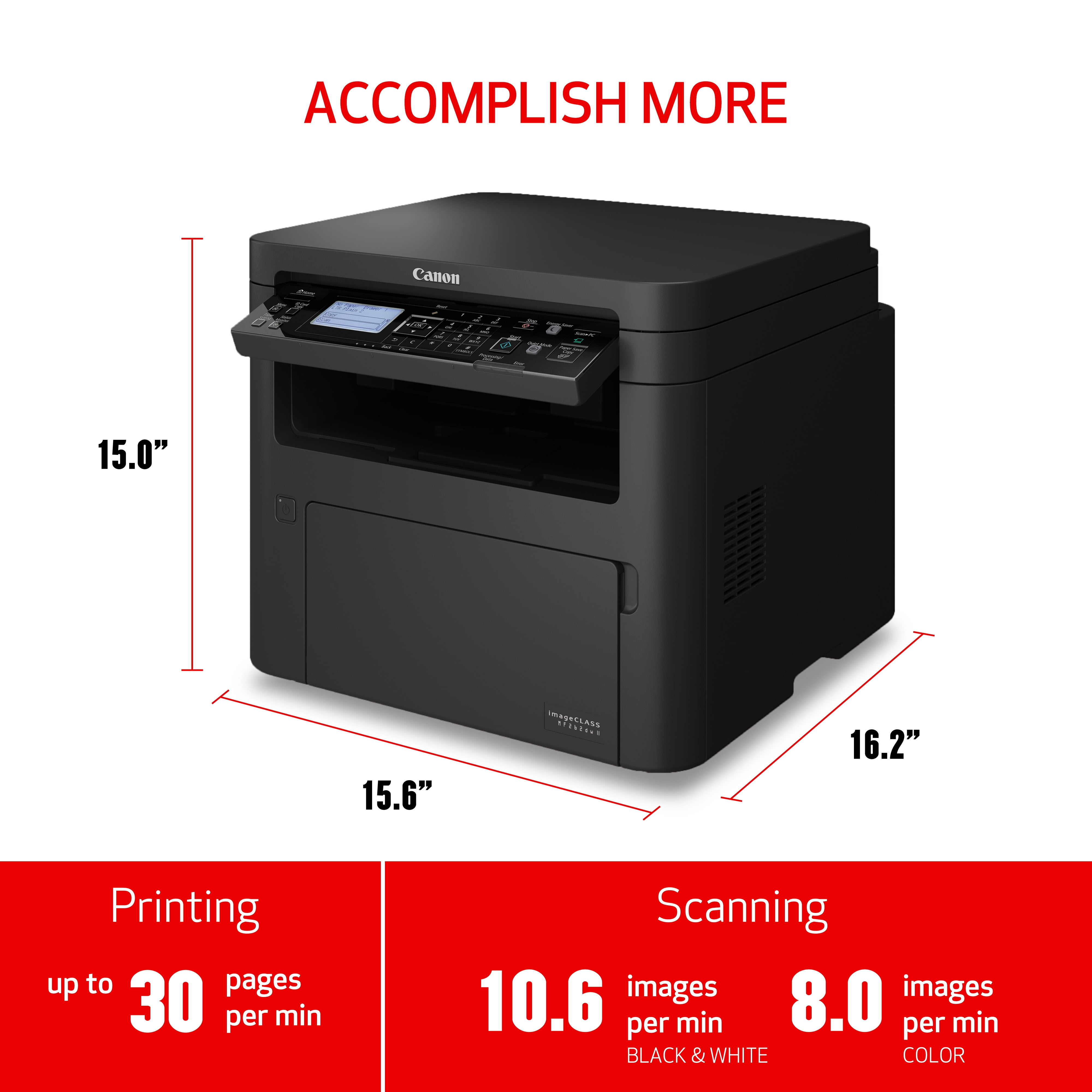The imageCLASS MF262dw II is designed for small office environments where black-and-white all-in-one capability is needed, and productivity and ease of use are priorities. The MF262dw II has print, scan and copy capabilities and prints up to 30 ppm with a first print out speed of approximately 5 seconds. Â Print on the go with your compatible mobile device, and wireless connectivity allows you to work from almost anywhere in your workspace. The MF262dw II has paper capacity of 250 sheets in the standard cassette, and 1-sheet multipurpose tray. This model comes with a 1-year limited warranty for peace of mind.