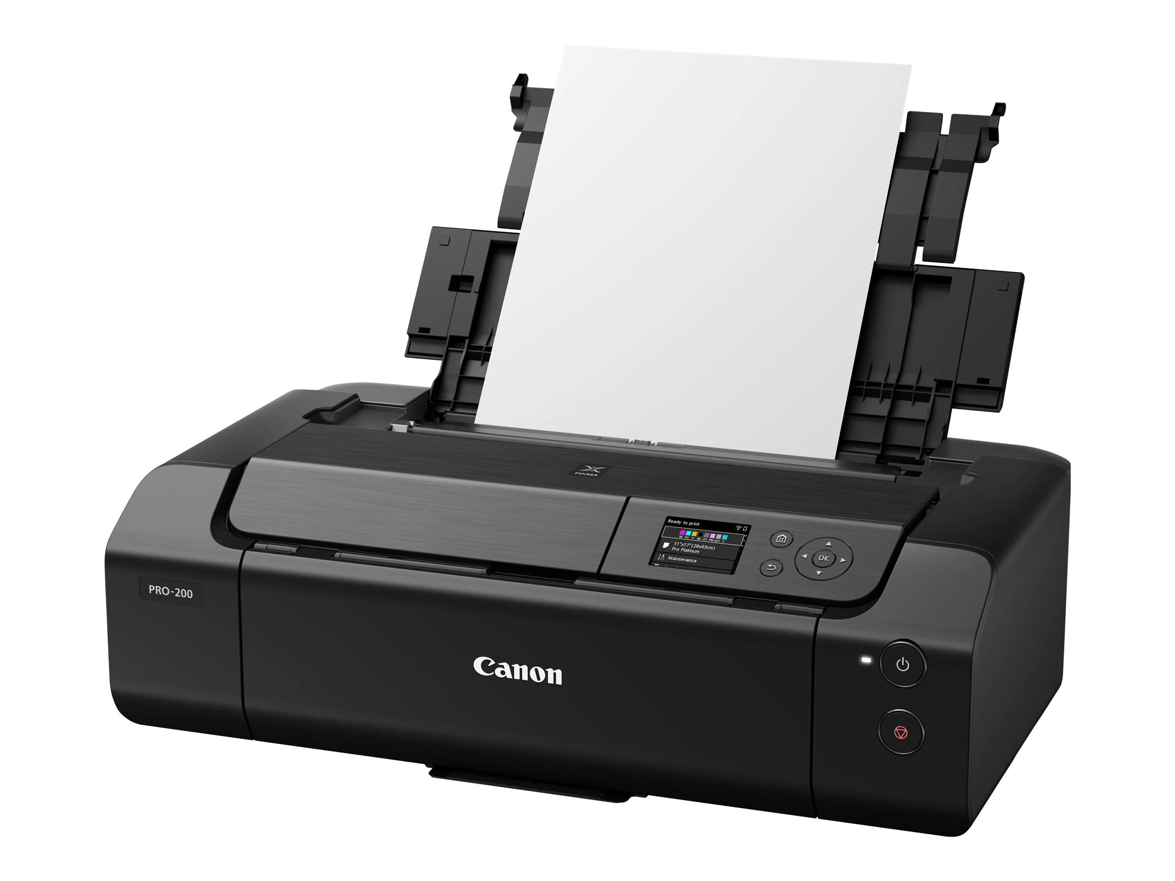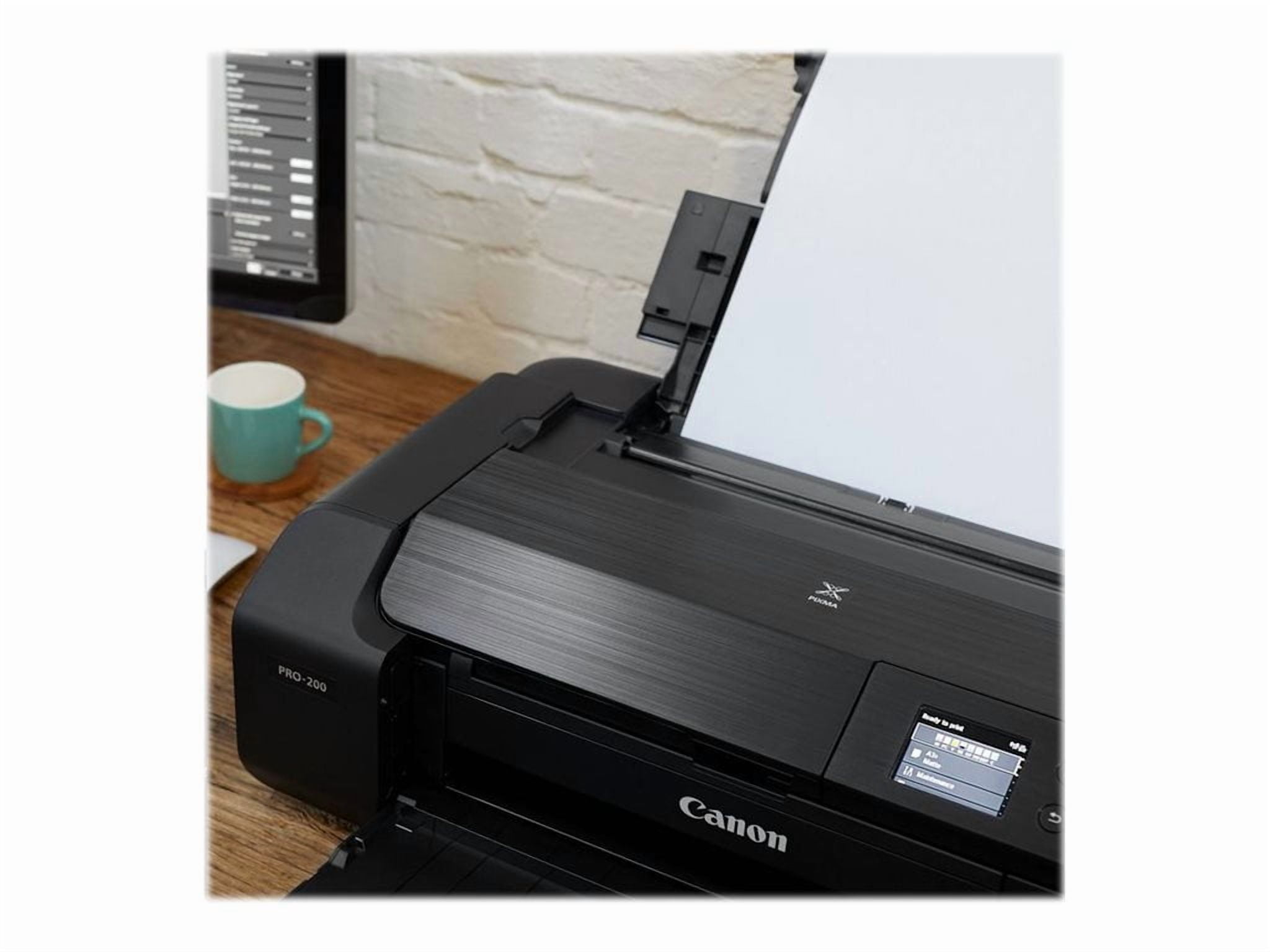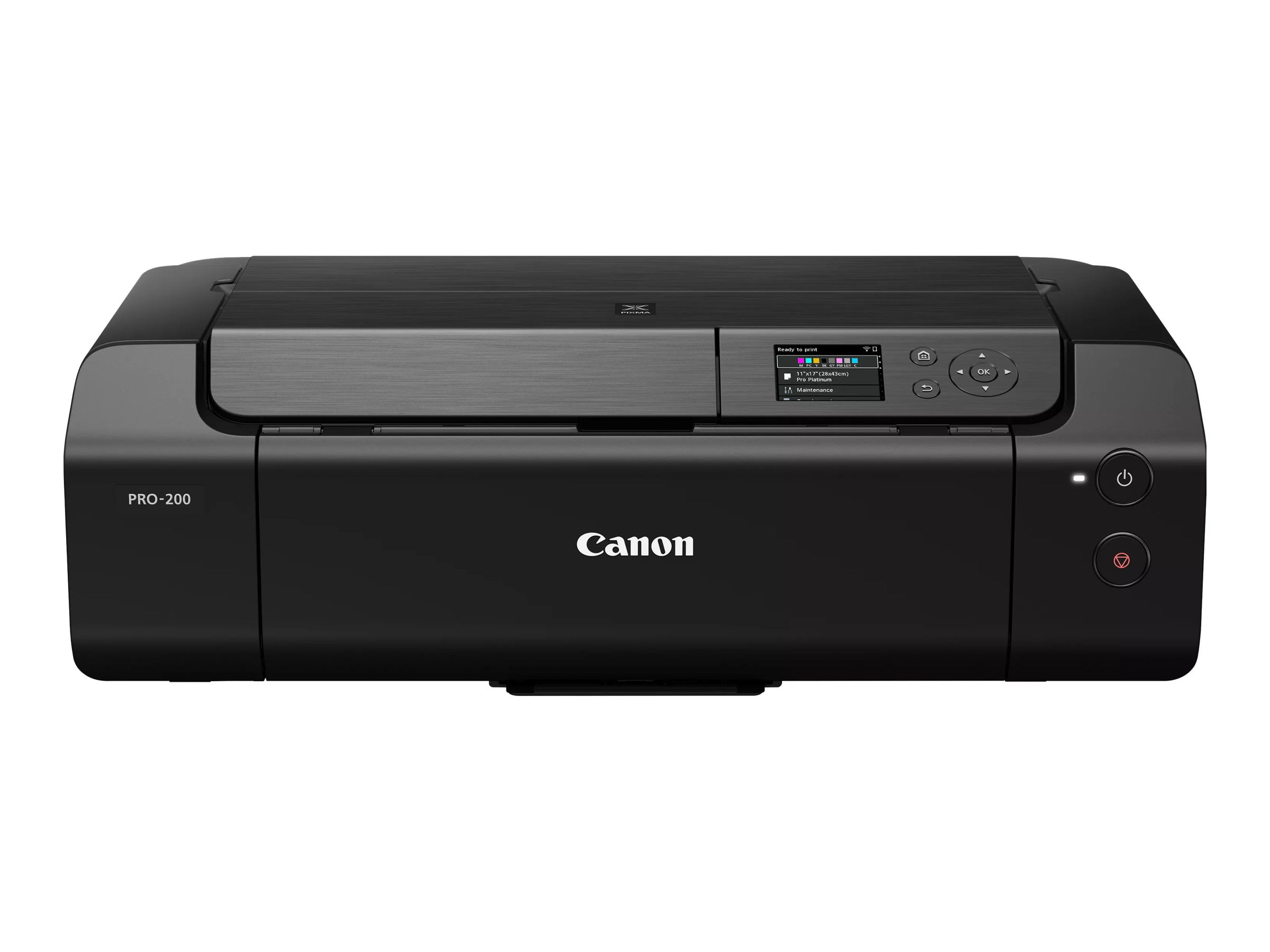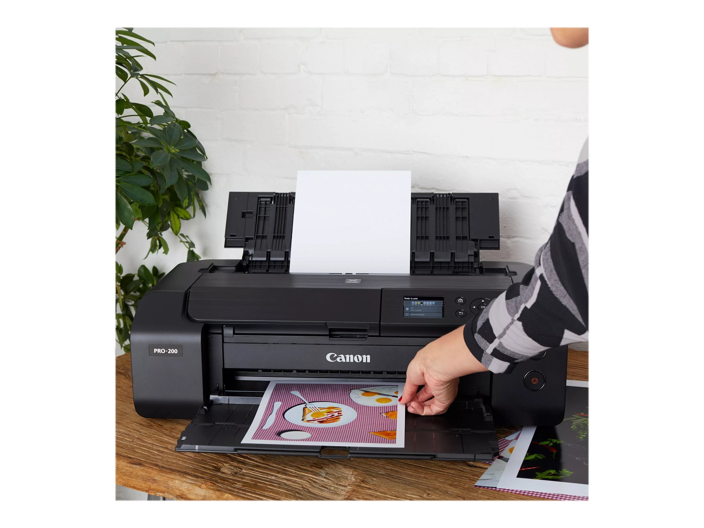 PIXMA PRO-200 The PIXMA PRO-200 Wireless Professional Inkjet Photo Printer is the ideal choice to bring your photos and designs to life in vibrant color. With an 8-color dye-based ink system, this versatile 13″ wide printer is designed to meet the demands of photographers and graphic artists alike. The PIXMA PRO-200 offers beautiful print quality, high-speed printing, and outstanding productivity in a compact footprint, allowing you to consistently produce the results your artistic work deserves. Bring your images to life with fast, professional quality print results. VIBRANT, TRUE COLORS With an 8-color dye-based ink system including two monochrome inks (gray, light gray), enjoy accurate color reproduction, richer colors, and vibrant professional printing, every time. FAST PHOTO PRINTING Increase your productivity through efficient high-speed printing. Produce a bordered A3+ print in just 90 seconds or a bordered 8×10 print in 53 seconds! ENHANCED COLOR GAMUT ChromaLife100+ CLI-65 ink is specially formulated for enhanced color gamut in magenta and reds, deeper black expression, and improvement of dark color reproduction in red and blues. BEAUTIFUL QUALITY ON A VARIETY OF MEDIA Express your creativity and choose a paper that suits your image or artwork., The PRO-200 prints on a diverse range of photo papers, from glossy and luster to matte or fine art. With the PRO-200 you can experience efficient, professional-level productivity in an easy-to-use printing system. COMPACT DESIGN Save space in your home or studio with a compact stylish design, the PIXMA PRO-200 is 15% smaller than the PIXMA PRO-10/PRO-100. 3.0″ COLOR LCD DISPLAY Easily check ink levels and printer status at-a-glance. You can also set certain printer settings and perform basic maintenance directly on the printer without a computer. VERSATILE MEDIA HANDLING The PRO-200 is compatible with a variety of media and has both Top Feed and rear Manual Feed options. With the addition of Panorama size and the ability to print sizes up to 39 inches long, you can express your images as you envisioned.