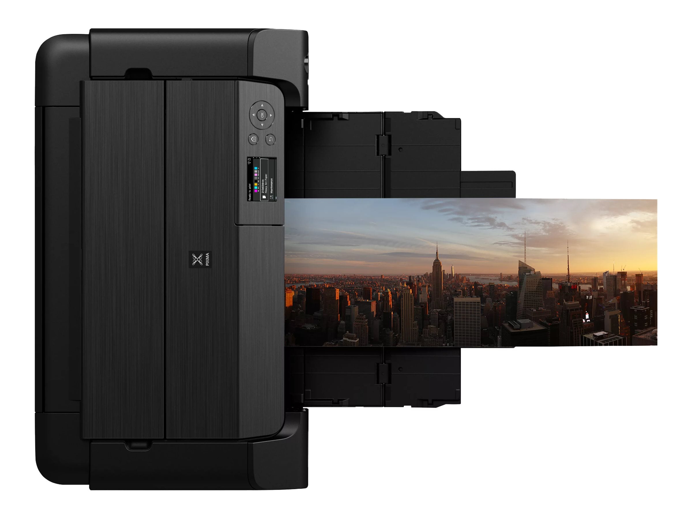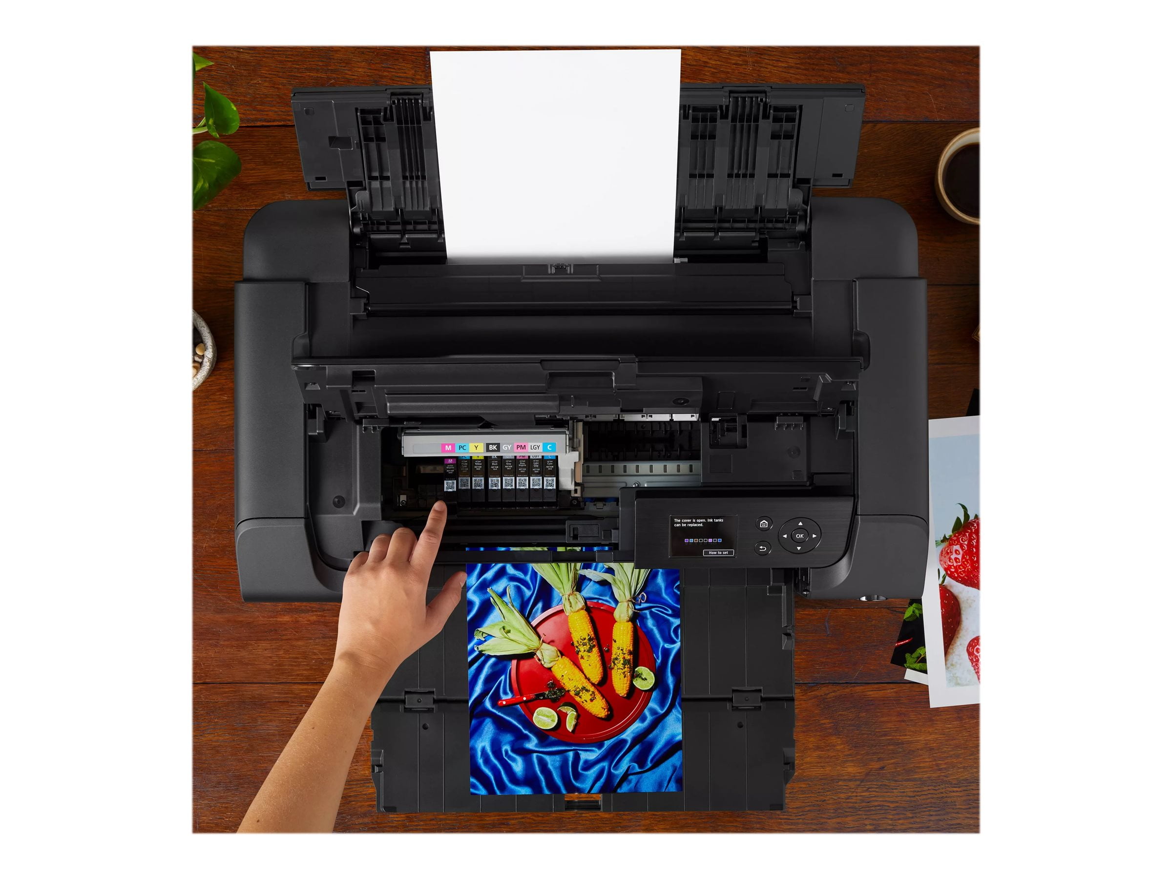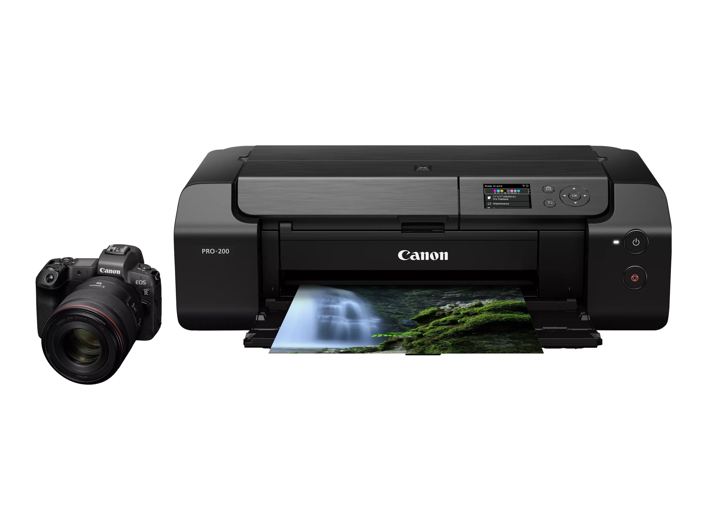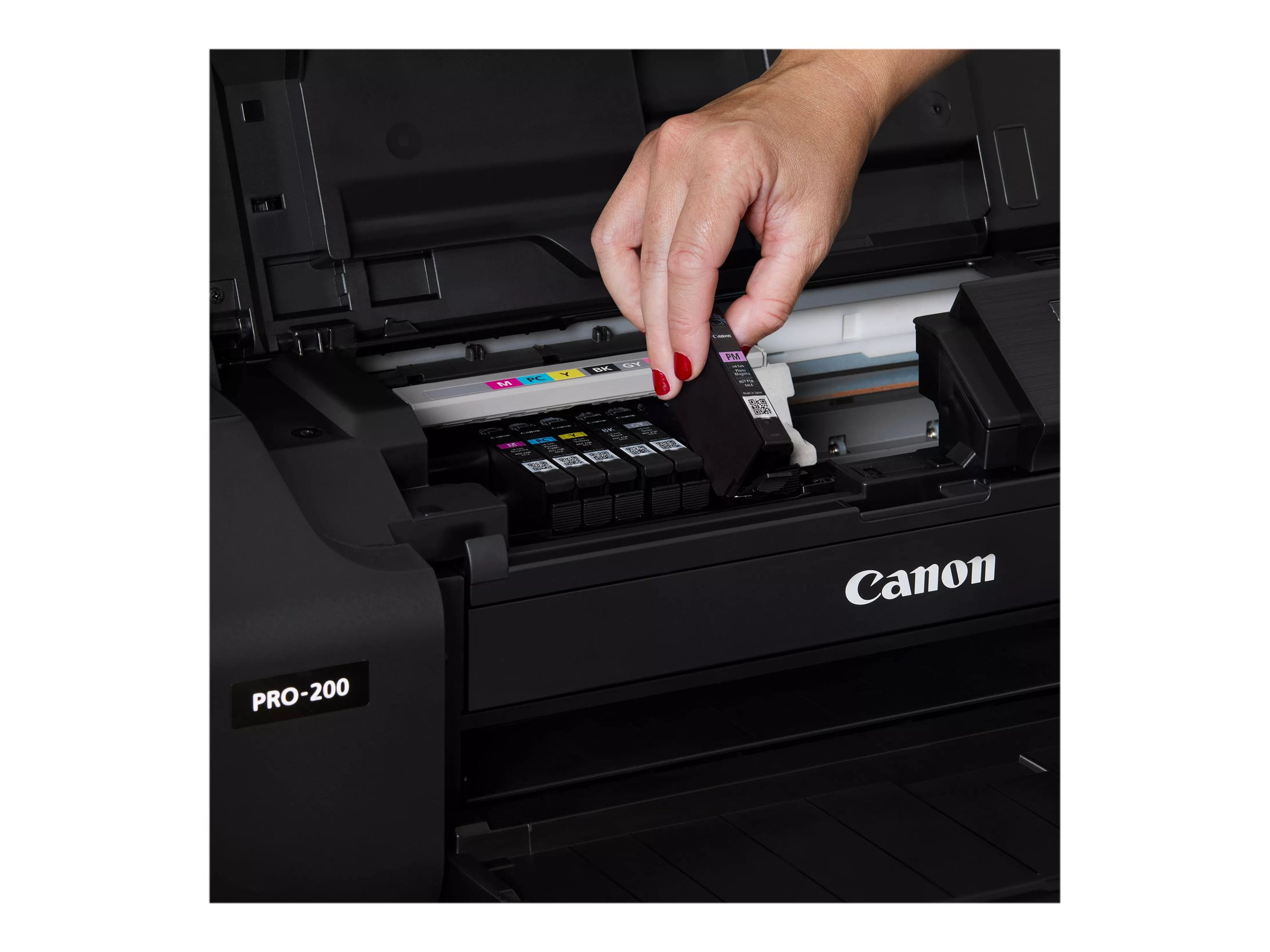 PIXMA PRO-200 The PIXMA PRO-200 Wireless Professional Inkjet Photo Printer is the ideal choice to bring your photos and designs to life in vibrant color. With an 8-color dye-based ink system, this versatile 13″ wide printer is designed to meet the demands of photographers and graphic artists alike. The PIXMA PRO-200 offers beautiful print quality, high-speed printing, and outstanding productivity in a compact footprint, allowing you to consistently produce the results your artistic work deserves. Bring your images to life with fast, professional quality print results. VIBRANT, TRUE COLORS With an 8-color dye-based ink system including two monochrome inks (gray, light gray), enjoy accurate color reproduction, richer colors, and vibrant professional printing, every time. FAST PHOTO PRINTING Increase your productivity through efficient high-speed printing. Produce a bordered A3+ print in just 90 seconds or a bordered 8×10 print in 53 seconds! ENHANCED COLOR GAMUT ChromaLife100+ CLI-65 ink is specially formulated for enhanced color gamut in magenta and reds, deeper black expression, and improvement of dark color reproduction in red and blues. BEAUTIFUL QUALITY ON A VARIETY OF MEDIA Express your creativity and choose a paper that suits your image or artwork., The PRO-200 prints on a diverse range of photo papers, from glossy and luster to matte or fine art. With the PRO-200 you can experience efficient, professional-level productivity in an easy-to-use printing system. COMPACT DESIGN Save space in your home or studio with a compact stylish design, the PIXMA PRO-200 is 15% smaller than the PIXMA PRO-10/PRO-100. 3.0″ COLOR LCD DISPLAY Easily check ink levels and printer status at-a-glance. You can also set certain printer settings and perform basic maintenance directly on the printer without a computer. VERSATILE MEDIA HANDLING The PRO-200 is compatible with a variety of media and has both Top Feed and rear Manual Feed options. With the addition of Panorama size and the ability to print sizes up to 39 inches long, you can express your images as you envisioned.