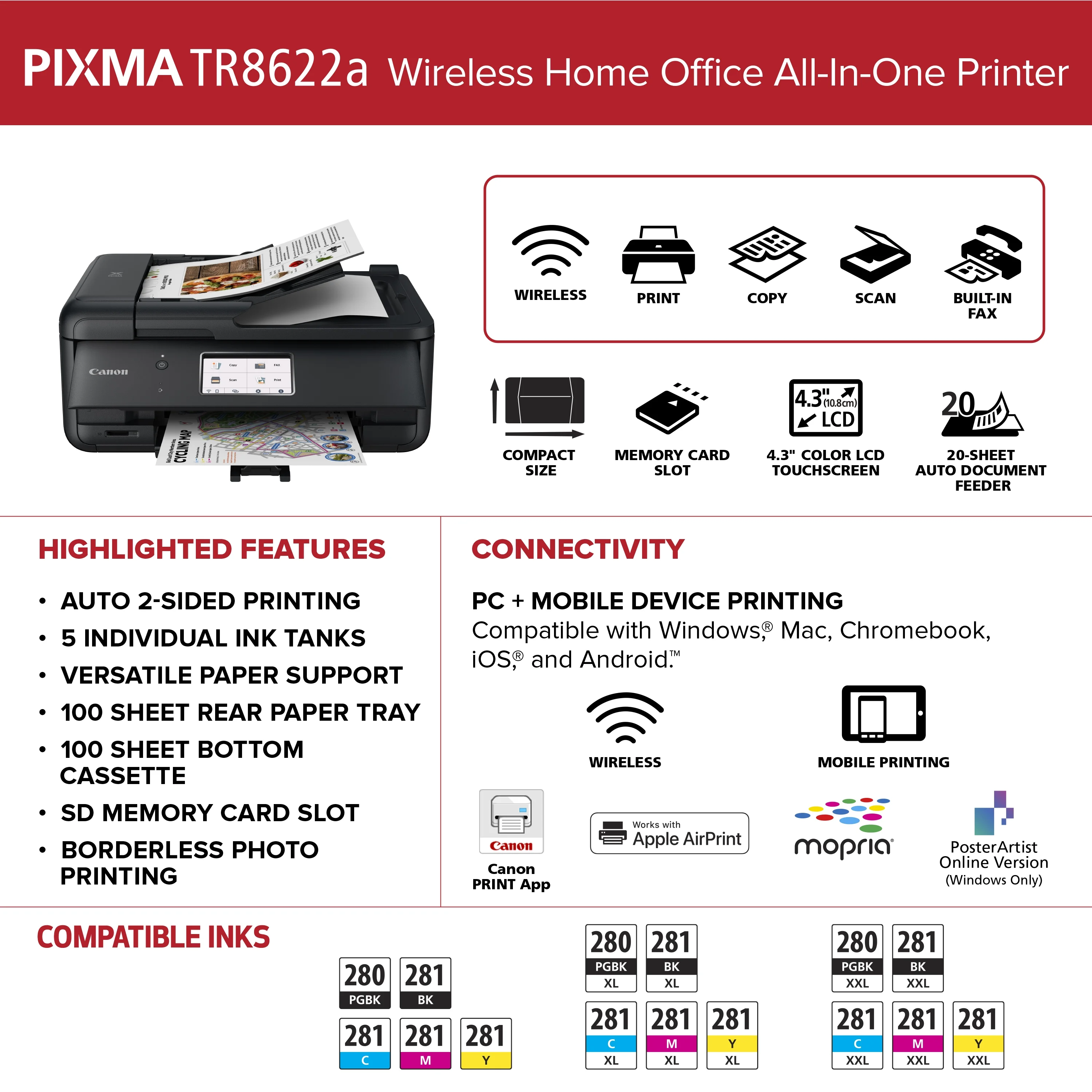 The Home Or Office All-In-One For Any Way You Work.When you need a compact home office printer that can handle all your work needs, the PIXMA TR8622a has you covered. With front and rear paper feeding, a 5-Individual Ink System, 4.3″ LCD Touchscreen, and impressive wired and wireless5 connectivity options, you’ll be able to do it all. The PIXMA TR8622a can easily transition from scanning a multi-page contract with the built-in Auto Document Feeder to printing double-sided homework assignments from online classrooms systems, or a family photo wirelessly from your smartphone. Whether it’s printing documents and reports, or faxing and scanning, the PIXMA TR8622a is the ultimate compact home office printer that’s big on performance and productivity.