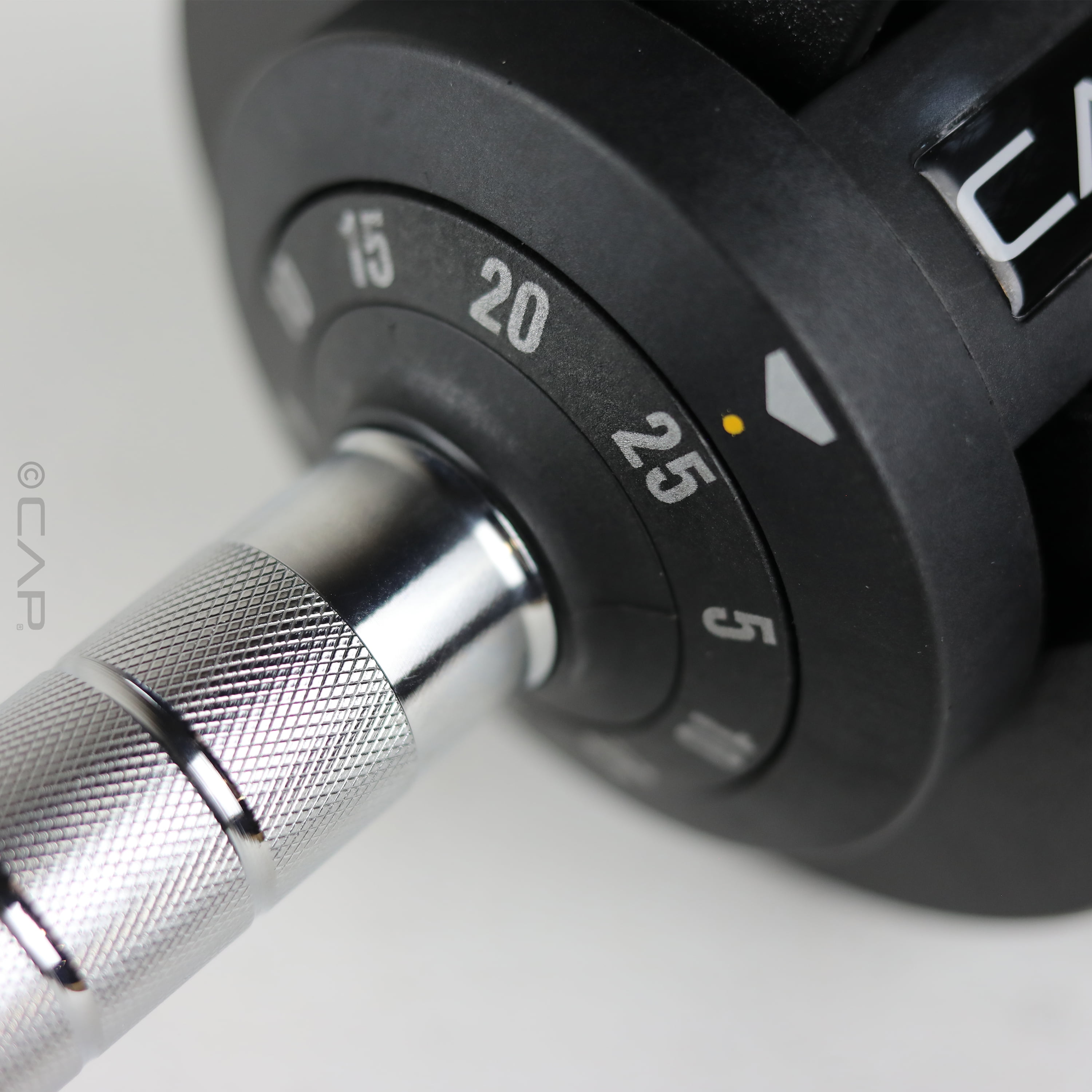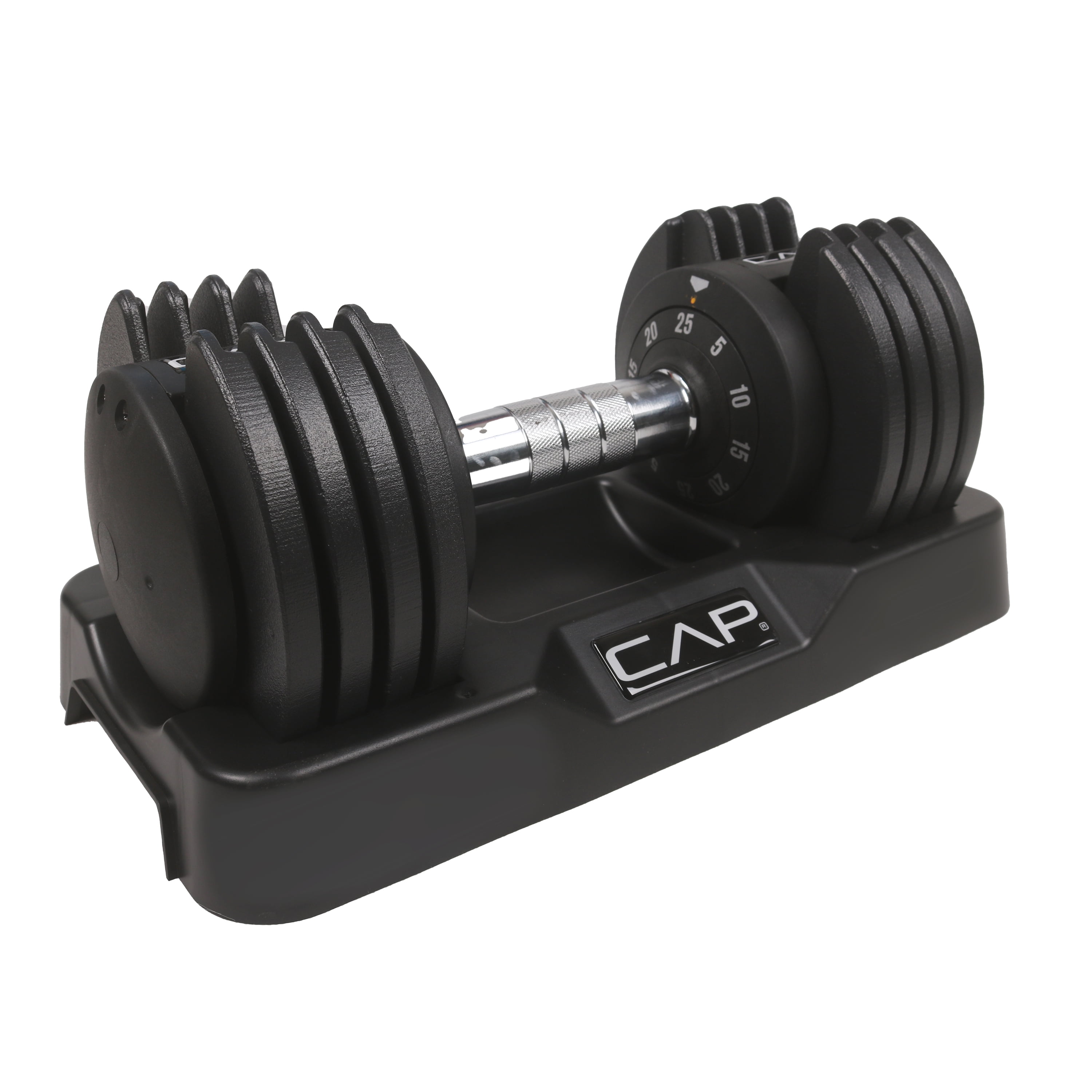 CAP Barbell 25 lb Adjustabell dumbbell features the adjustable weight adjustment system that is safe, quick, and easy to use. The adjustable weight-adjustment system allows you to rapidly switch from one exercise to the next. Simply turn the handle right or left to adjust the weight in 5-pound increments, pull up, and start your workout. The straight bar handle has a natural orientation for a comfortable, secure lifting position. U.S. Patent 11,285,354