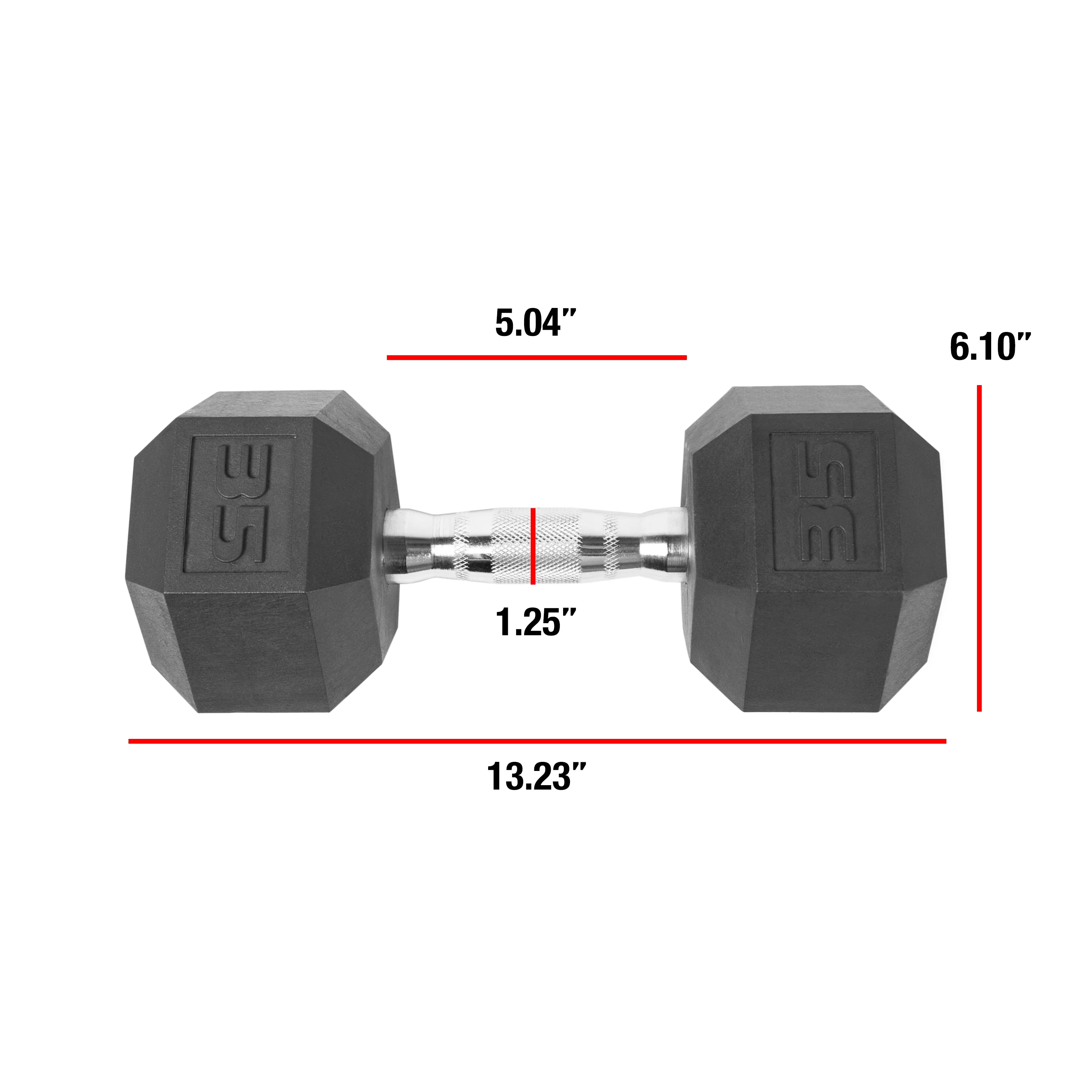 CAP Barbell Coated Hex Dumbbell, Single 35lb: Sold individually; Available in sizes from 3, 5, 8, 10, 12, 15 – 120 lbs in 5 lb increments Premium quality weights that are built to last and withstand any workout environment Contoured, easy-grip chrome steel handles The medium depth knurling on the ergo handle provides essential grip and security during use Hexagon shaped heads are designed to prevent rolling and provide easier storage Protective coating on the heads prevent damage to floors Perfect for isolations, full body, functional and HIIT workouts 30-day limited manufacturer warranty