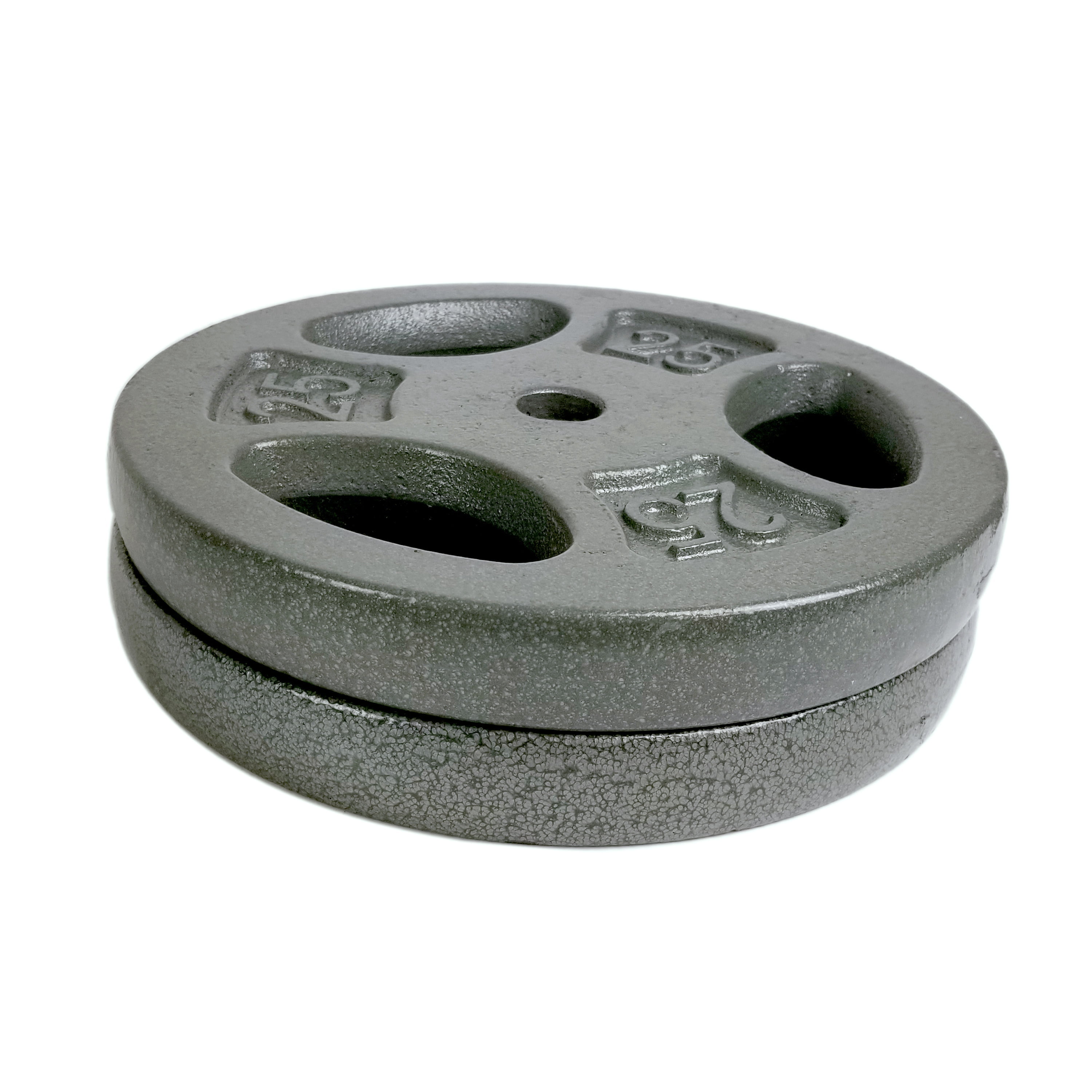 Construction, made of solid steel with a black powder coat finish, medium-depth diamond knurling for a non-slip grip, accommodates Standard plates (1-inch center hole). Versatile, target the biceps, triceps, back, and chest muscles with this super curl bar, used for triceps extensions, curls, skull crushers, and more. Features, super angled shaft is designed to reduce discomfort when lifting weights, star collars are included. These 1″ Standard grip weight plates come with openings in the plates making them easier and safer to grip. Whether you are using adjustable dumbbell handles, straight bar, or trap bar, these weights can be loaded onto any Standard bar with a 1-inch sleeve diameter. These weights feature a machined center hole to easily slide onto bars. The glossy enamel finish offers a durable, long-lasting coating to prevent rust and damage. The 3-hole grip design allows for easy handling when loading or unloading weights. Add these grip plate sets to your home gym and use them for cardiovascular fitness or strength training! The 2.5, 5 and 10lb plates are sold in sets of 4 plates, while the 25lb plates are sold in sets of 2.