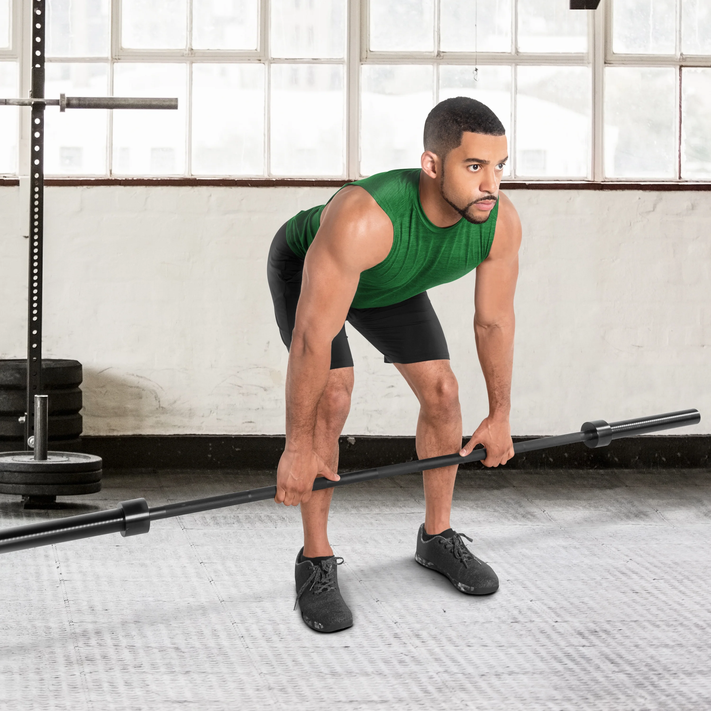 CAP Barbell Weightlifting 7 Ft. Olympic Solid Power Squat Bar, Black: Crafted with solid Japanese steel and coated with a black phosphate finish Maximum loading capacity of 1500-pounds makes this barbell ideal for experienced lifters Center knurling and side knurling provide a secure, non-slip grip 15-inch loadable sleeve length provides ample room to load Olympic weights Great for squats, bench presses, deadlifts, lunges, and much more Collars are not included