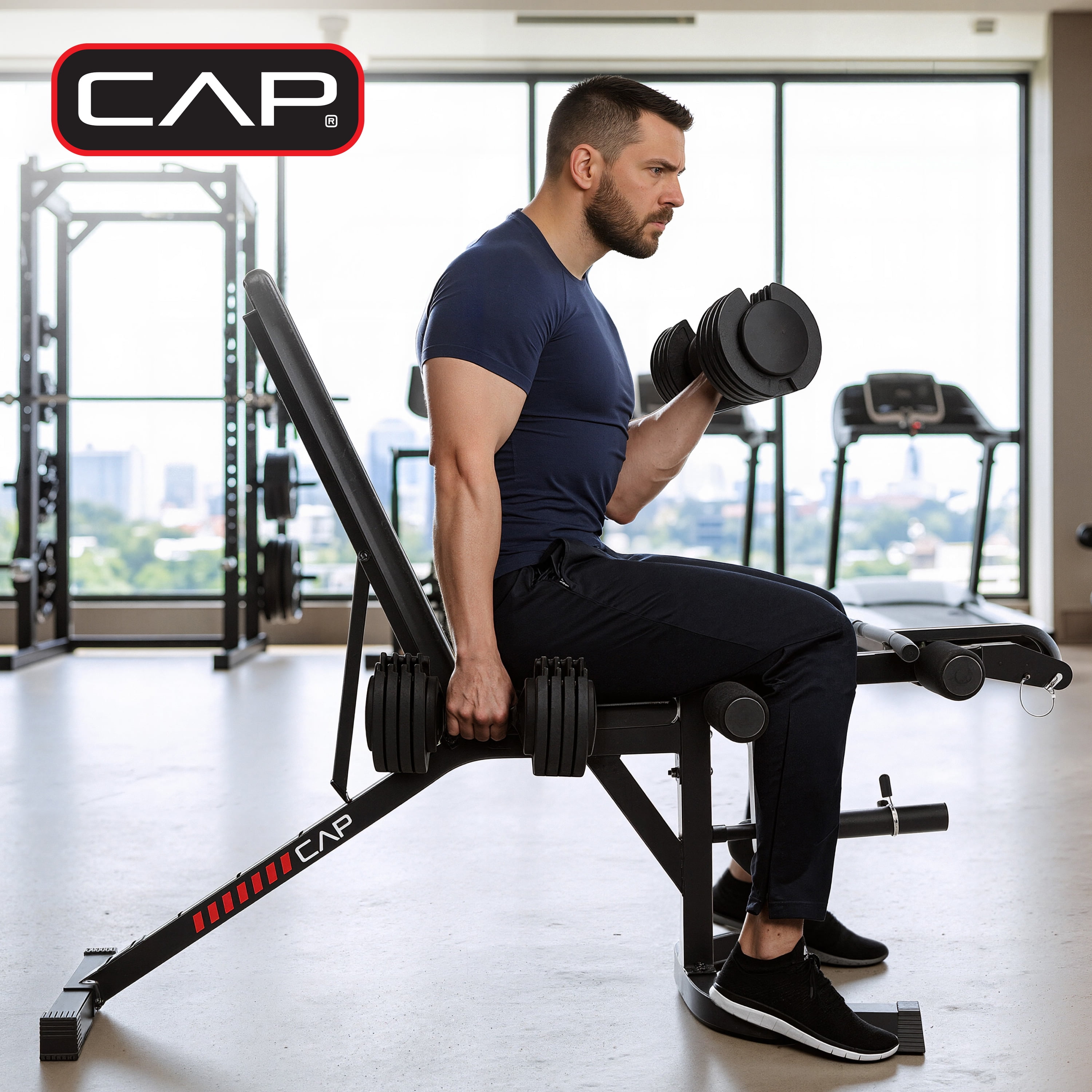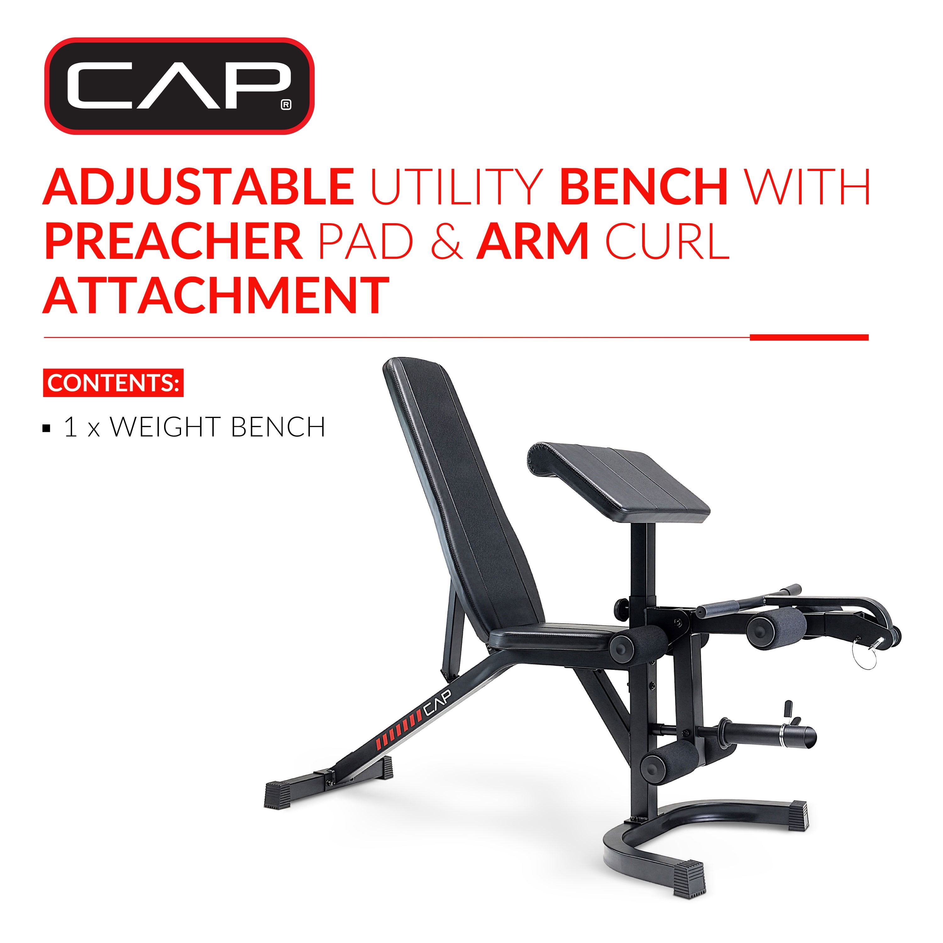 Upgrade your workouts and challenge yourself right from the comfort of home by adding the CAP Deluxe Adjustable Utility Weight Bench with Curl Attachment to your home gym. This single piece of equipment allows you to train your lower and upper body with a variety of exercises, never letting you get bored. Featuring an removable preacher Curl pad and curl attachment, the bench lets you hone in on your biceps and triceps helping you maximize your performance. With the CAP Deluxe Utility bench, you can vary your routines with its six-position bench positions ranging from decline to incline. Its sturdy foot placement and soft foam rollers add safety and comfort. Use it on its own or paired with the CAP Squat Rack, which is sold separately, for an optimal full workout experience. This deluxe utility weight bench with curl attachment has a maximum weight capacity of 610 lbs, including the user.