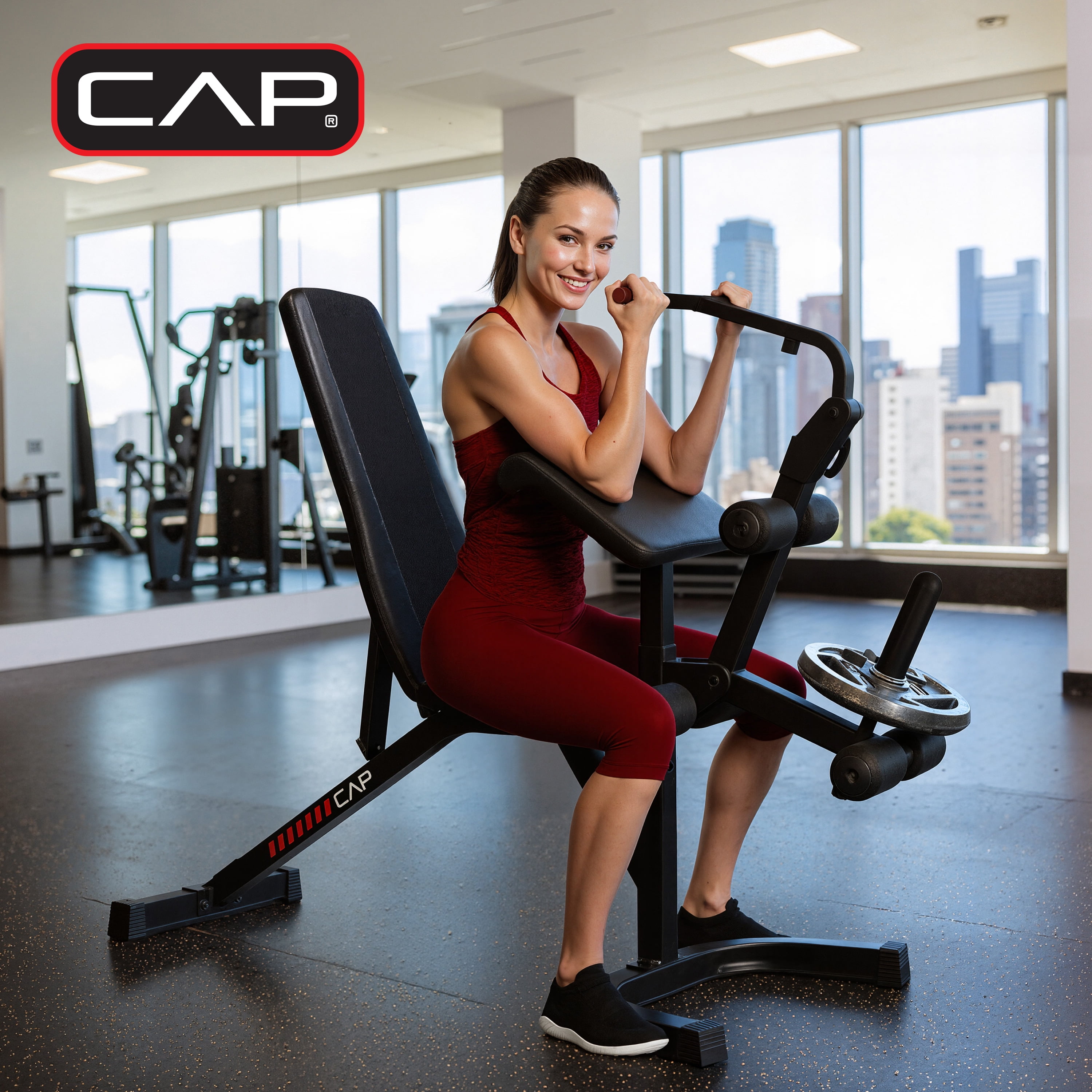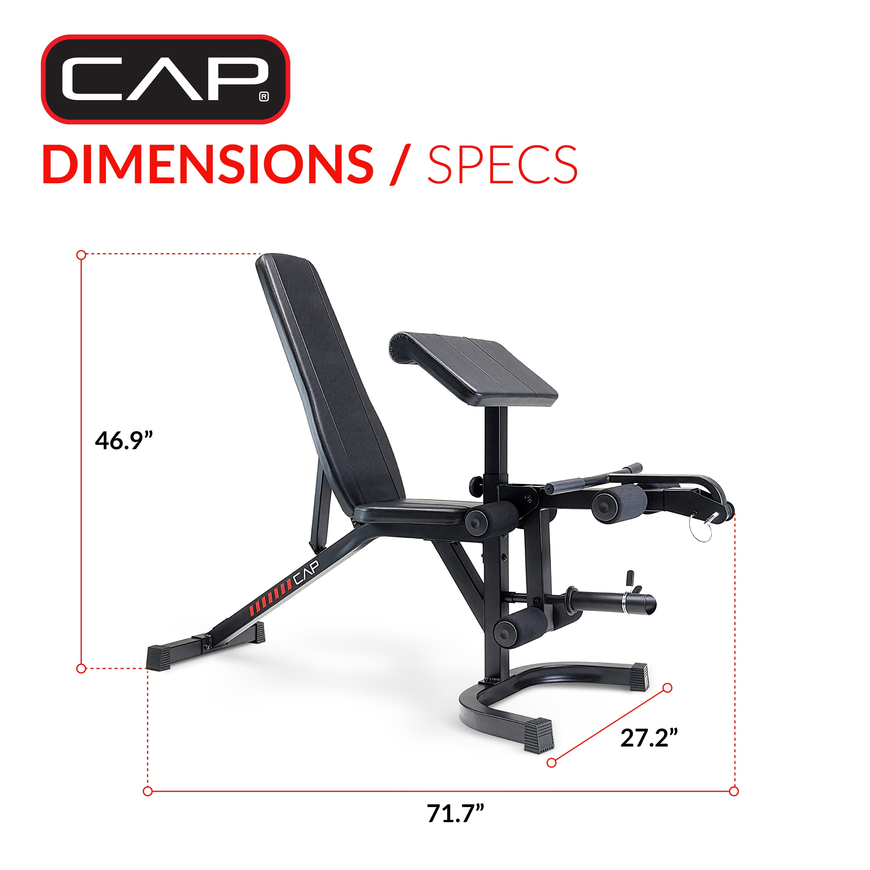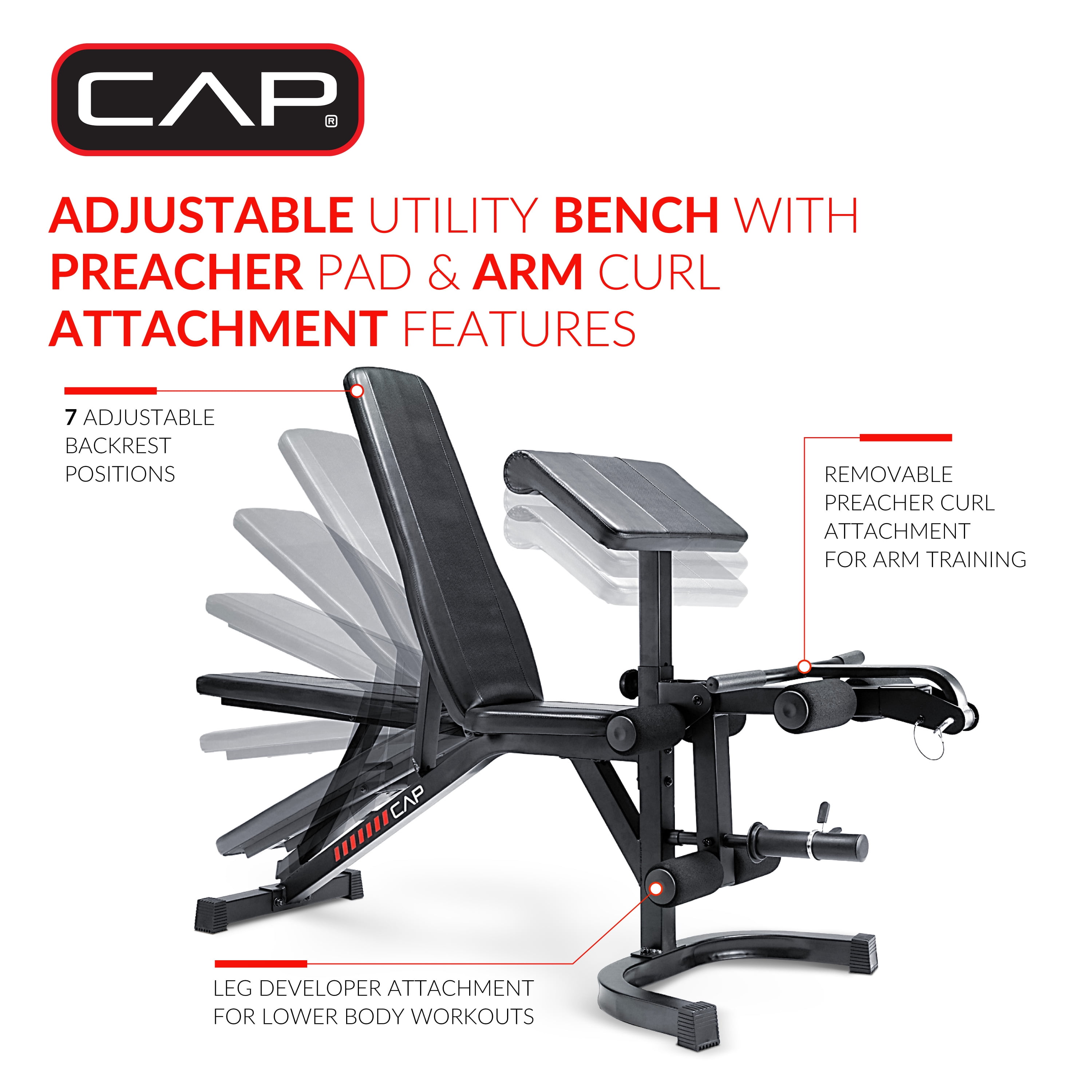 CAP Deluxe Adjustable Utility Weight Bench with Preacher Curl Attachment: Tubular steel construction for stability and durability Powder coated finish to prevent rust and scratches Wide padded seat and backrest for comfort during workouts 6-position back pad offers multiple bench positions, including upright, flat, incline and decline settings, offering a comprehensive workout Adjustable and removable Preacher Curl Pad attachment helps to target your biceps and triceps Leg developer helps to build muscle in the legs, using Standard or Olympic plate Multiple positions allow you to target a wide range of muscle groups Use alone or pair with the CAP Adjustable Squat Rack FM-905SR or FM-7000FW (sold separately) Maximum bench weight capacity, including user is 610 lbs; Leg developer weight capacity is 150 lbs; Arm curl weight capacity is 150 lbs. Weight bench with curl attachment dimensions: 72.24″L x 26.77″W x 46.18″H