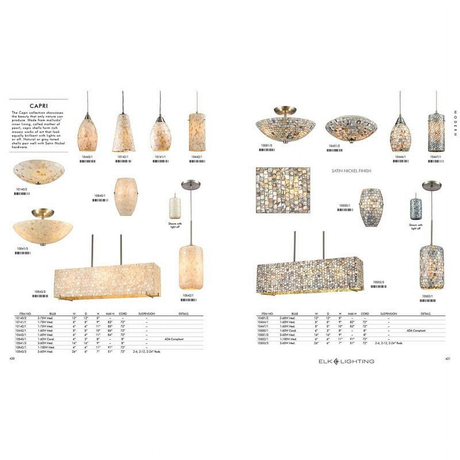 Illuminate your kitchen or island with the Elk Home Capri 1-Light Pendant. This pendant light showcases the natural beauty of mother of pearl, creating a brilliant mosaic that looks equally stunning with the lights on or off. The satin nickel hardware pairs well with natural or gray-toned shells, providing a versatile lighting solution that complements various decor styles. The LED light source is energy-efficient and long-lasting, addressing your preference for modern LED pendant lights. The pendant light is fully dimmable when used with a compatible dimmer switch, allowing you to adjust the ambiance to your liking. The fixture is designed for indoor use and can be installed on a sloped or vaulted ceiling, offering flexibility in placement. Professional installation is recommended for this hardwired, ceiling-mounted fixture, ensuring a safe and secure setup. This pendant light is part of the Capri collection, which showcases the beauty that only nature can produce. Made from mollusks inner lining, capiz shells form rich mosaic works of art that look equally brilliant with lights on or off. The natural or gray-toned shells pair well with the satin nickel hardware, making this pendant light a stunning addition to your home.