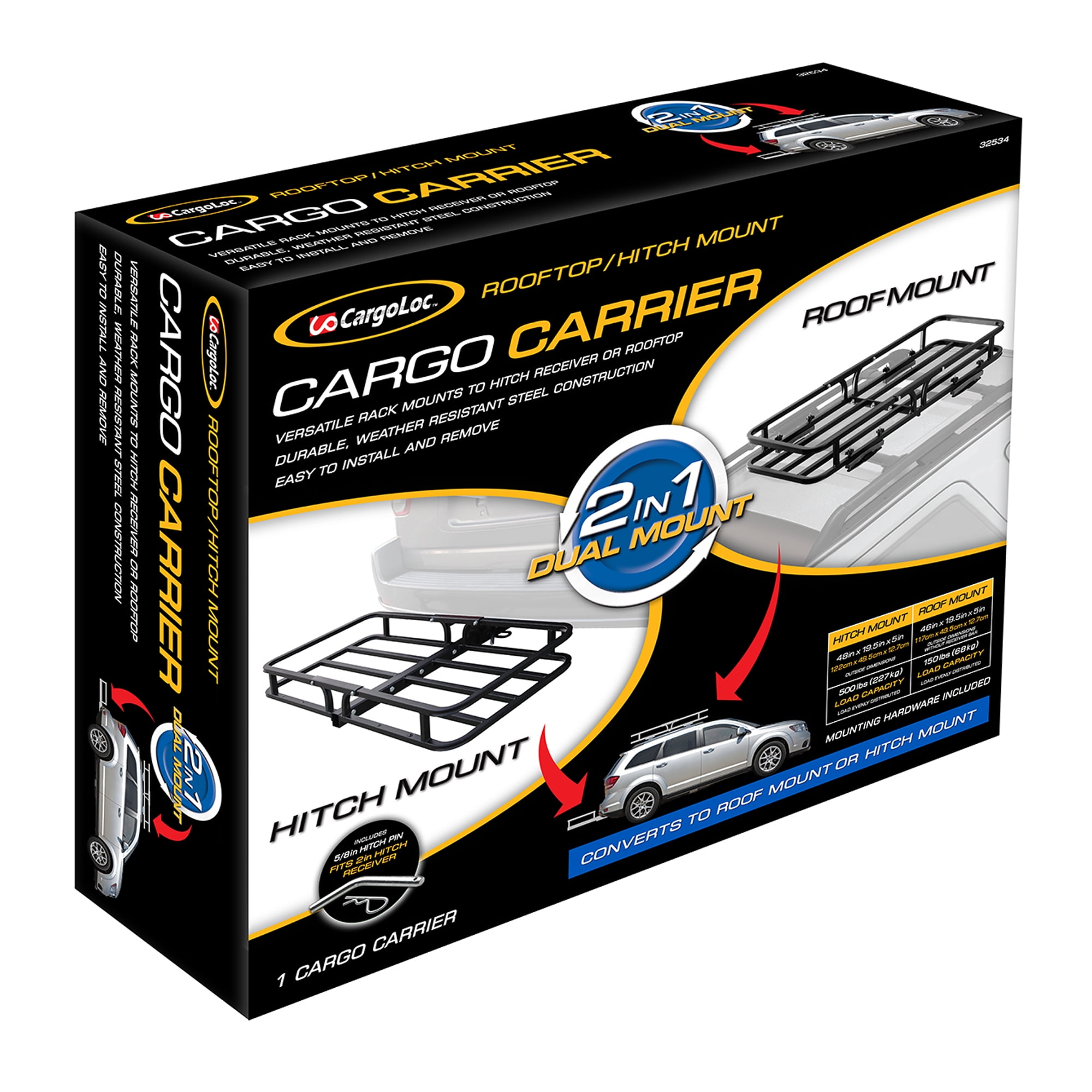 New CargoLoc 2-in-1 Hitch Mount and Roof Top Cargo Carrier Durable and Easy to Assemble With all the parts included for installation, the CargoLoc 2-in-1 Hitch Mount and Roof Top Cargo Carrier will certainly be your favorite accessory when you plan a road trip. Inclusive of two sets of bolts, a hitch bar with longer bolts and a roof-rack mode with shorter hardware you will easily be able to follow the instructions and install this carrier in no time. Super Sturdy Steel Construction With a sturdy construction, the CargoLoc 2-in-1 Hitch Mount and Roof Top Cargo Carrier will fit any SUV to size. Made with top quality material, you will be use this carries for years and multiple road trips without the worry of it accumulating rust due to weather conditions. Get More Space inside the Car By installing the CargoLoc 2-in-1 Hitch Mount and Roof Top Cargo Carrier, you will be able to store more in the boot of your car as you will be able to hold your luggage on the top of your car. You will easily be able to secure your luggage on this carrier with ropes. Carry more on your vacation with the assistance of this stunning carrier by CargoLoc.