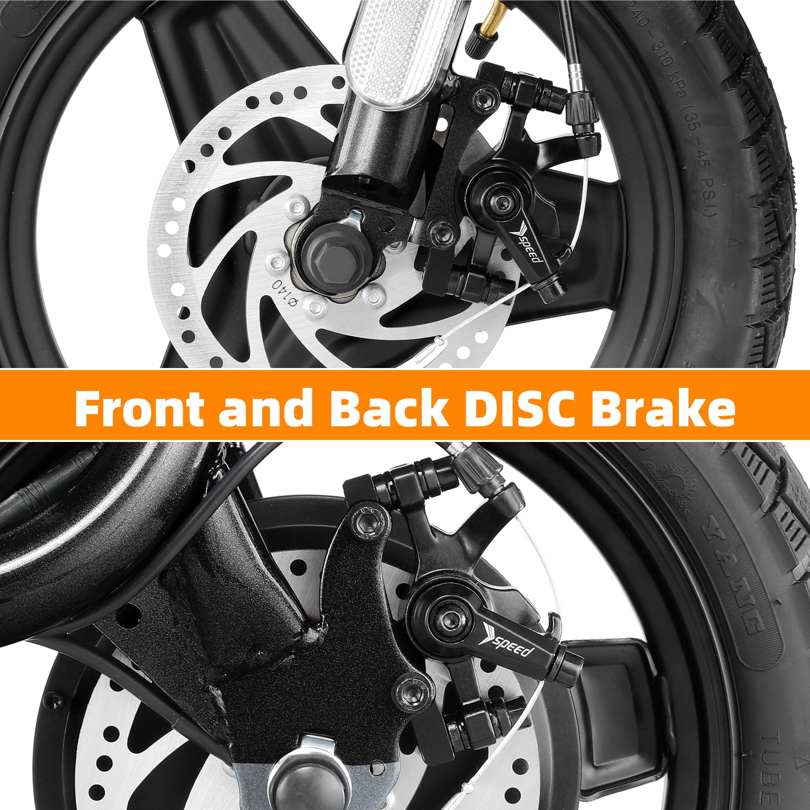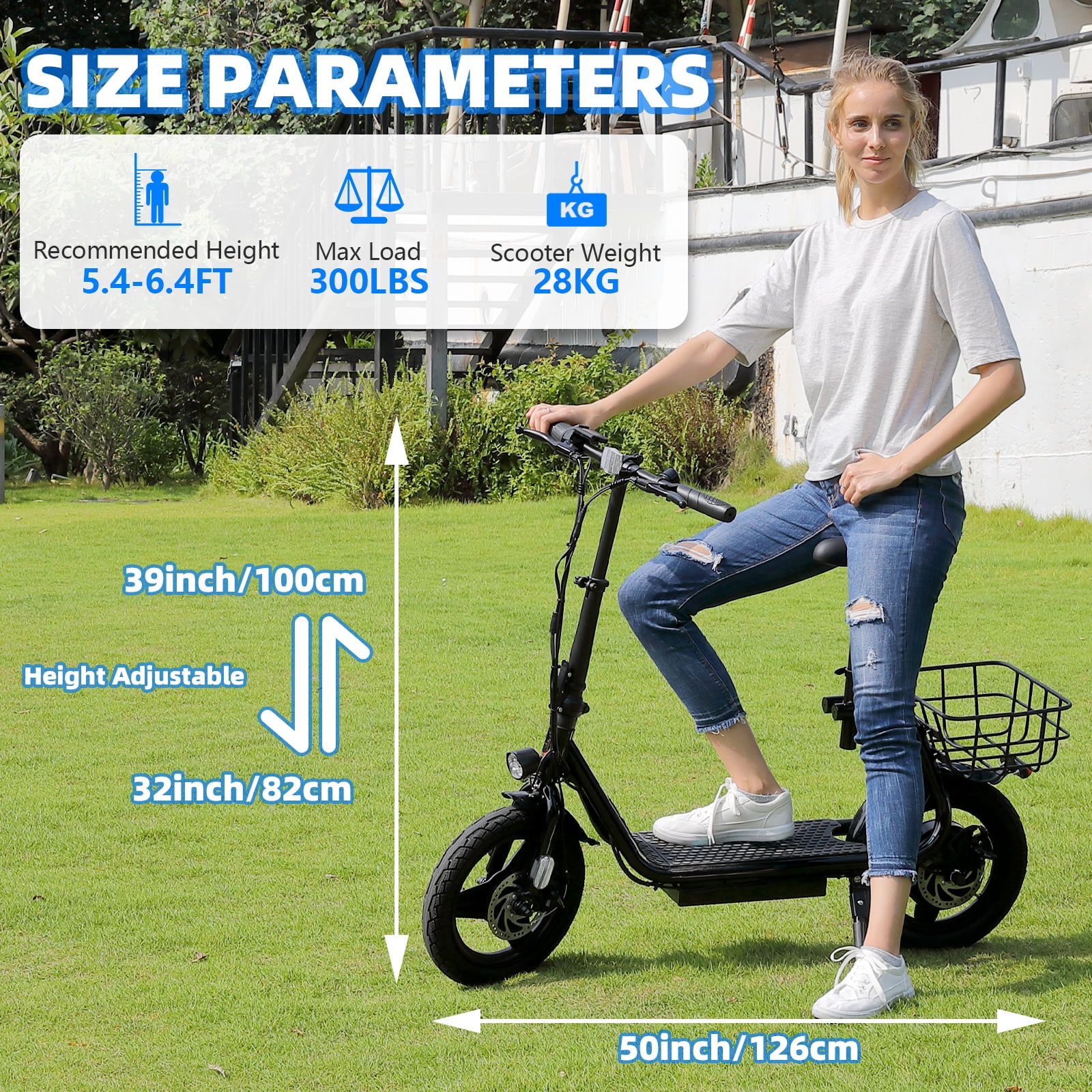 ✔POWERFUL MOTOR & BATTERY— The adult electric scooter is equipped with a powerful 500W(Peak 819W) brushless motor, which provides a 20 MPH max speed while reducing the noise by 10 decibels compared with ordinary motors. ✔48V Large Battery—48V large lithium battery supplies range up to 25 miles. Effortlessly take on slopes with a 20% incline. ✔Portable, Tough, and Durable—The foldable aluminum alloy frame supplies 330 lbs weight limit. 3-second foot-actuated folding, Foldable design makes this electric scooter easy to store and carry. ✔3 Riding Modes—Equipped with a soft seat and basket to provide you with a safe and comfortable trip, cruising at 3 constant speeds makes you more relaxed as well, so cool and convenient. ✔Dual Braking System—This adult electric scooter adopts disc braking + E-ABS anti-lock braking system to make a quicker response braking also safer and more durable for emergency braking. ✔Multiple Shock Absorption System—The front & rear 4 large shock absorbers, soft seat, seat spring shock absorption, and 14 inch tires will provide maximum comfort under any terrain. ✔14-inch Off-road Inflatable Run-flat Tires— The metal body combined with 14-inch tires is sturdy and durable. Compared to solid tires, pneumatic tires have better shock absorption and road adaptability, reducing the bumpy ride maximally. ✔More Functions—This electric scooter for adult is equipped with a wider foot anti-slip pedal. LED headlights, multi-color running lights, and taillights with a wider range of illumination and higher brightness. The driving data will be transmitted to the LCD in real-time. Motorrized Scooter: 500W electric motor scooter with 28-mile range and max speed of 20 mph Electric Scooter Accessories: E Scooter with rear carry basket and scooter deck, front LED light for safety, comes with toolkit Battery Capacity: 48V lithium-ion battery with intelligent overload and low voltage protection, charging time: 5 hours, with battery power display This scooter comes with a breathable seat to fit people from 4’9″ to 6’1″ tall, suitable for 12 years old and above Unisex. Safety First: Recommended scooters for teens 12 years and up with a pure iron frame, steel rigid fork, rear disc-brakes, 14″ tires for multi terrain use, reflective rear reflectors and front lamp. Lightweight: weight:65 lbs, maximum carrying load of 330 lbs. Warranty information:30 days free return and exchange service for product quality. 1 year warranty, except tires or other consumables. The battery warranty is 6 months. Warranty: 1 year Warranty for Scooter and 6 month Warranty for battery Package list:E-scoote,Charger,User Manual,Allen key 30-day no-cost return and exchange policy to customers.1-year warranty, excluding tires and other consumable items. The warranty for batteries is valid for a period of 6 months.